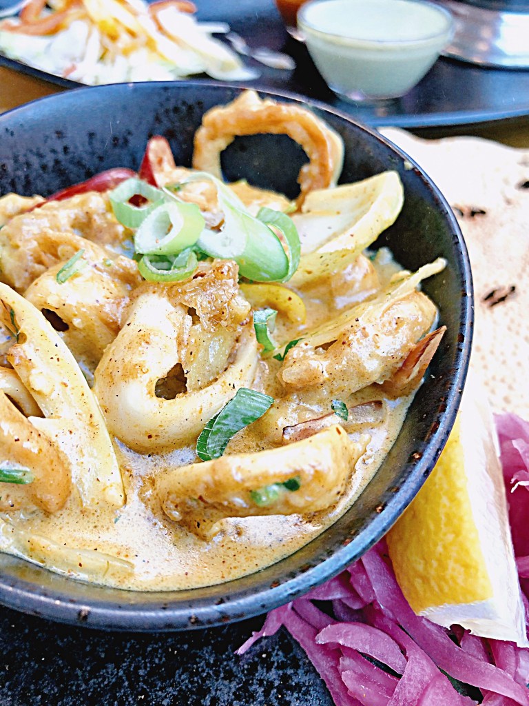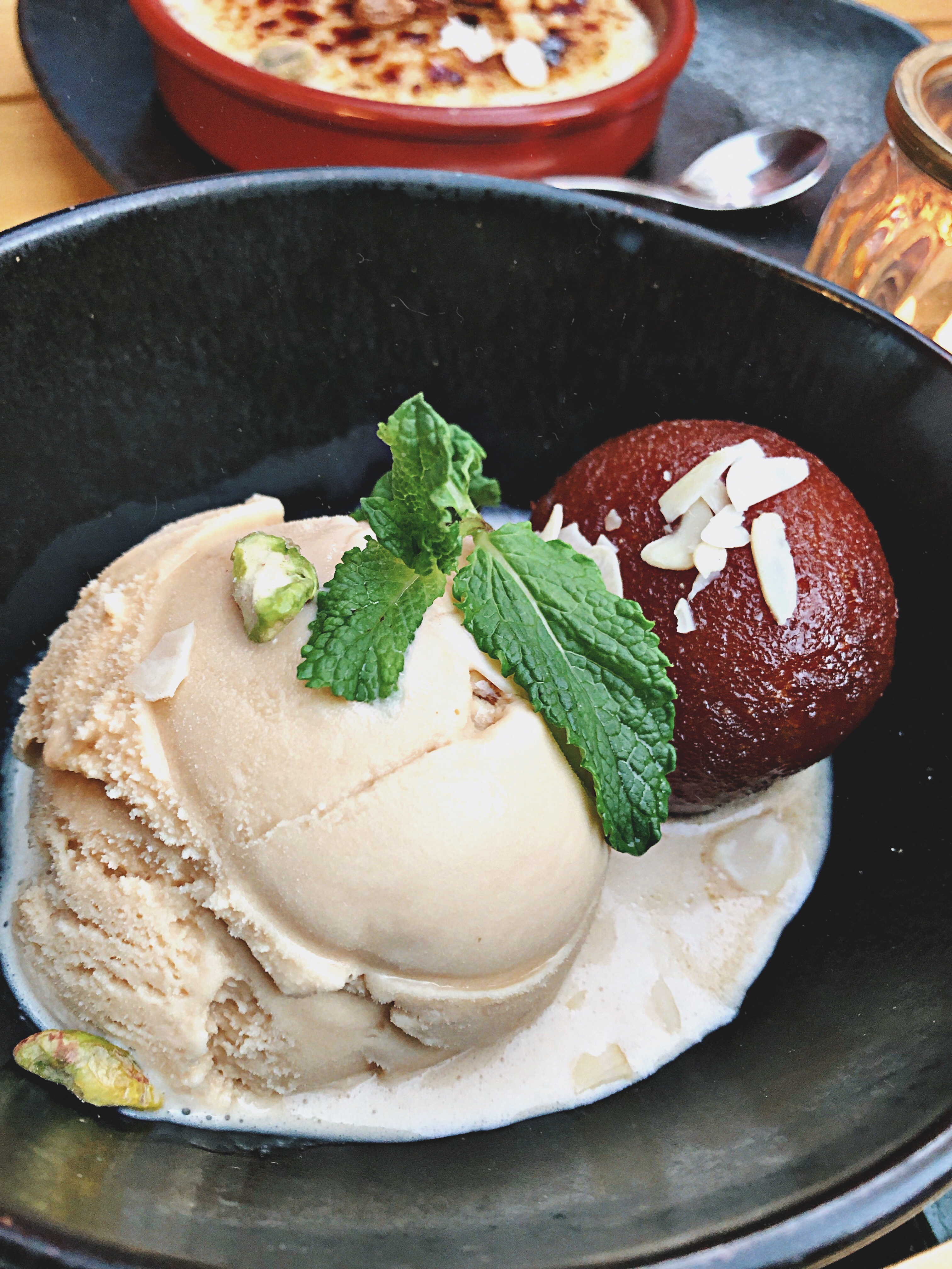Wir hatten die Mixed Vegetable Pakoras (knusprig) und die Curried Calamari (pikant) als Starters. Beim Hauptgang haben wir uns für die Prawn Tikka (Garnelen aus dem Tandoor) und das Navratan Korma (Gemüse in Cashew-Kokossauce) entschieden und zu guter letzt gab es dann noch einen süßen Abschluss mit der traditionellen Gulab Bombe (frittiertes Bällchen in Sirup mit salzigem Karamelleis) und dem Rice Kheer Brûlée (indischer Reispudding mit Kardamom und Safran). Auch wenn wir eigentlich schon satt waren, haben wir es nicht bereut, uns für den köstlichen Nachtisch entschieden zu haben!