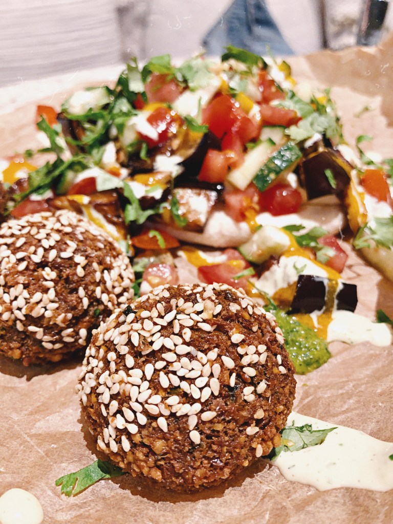 Als Hauptgerichte hatten wir Sabich (Falafel, Hummus, Pita, Gemüse und viel Geschmack) und den israelischen Salat.