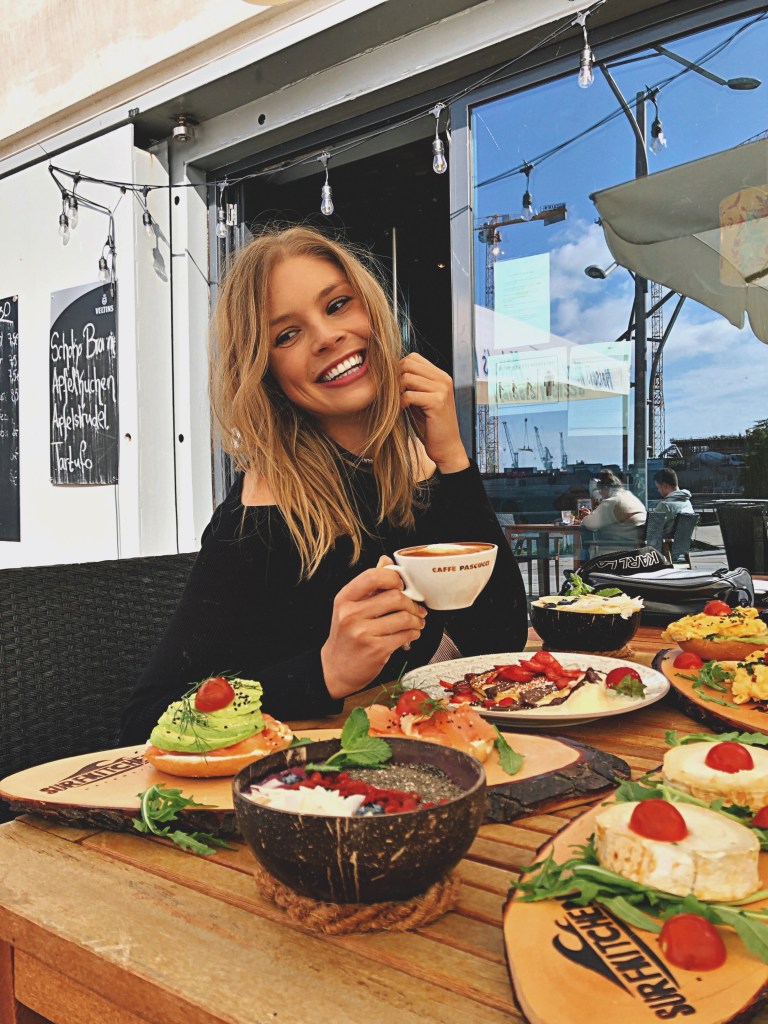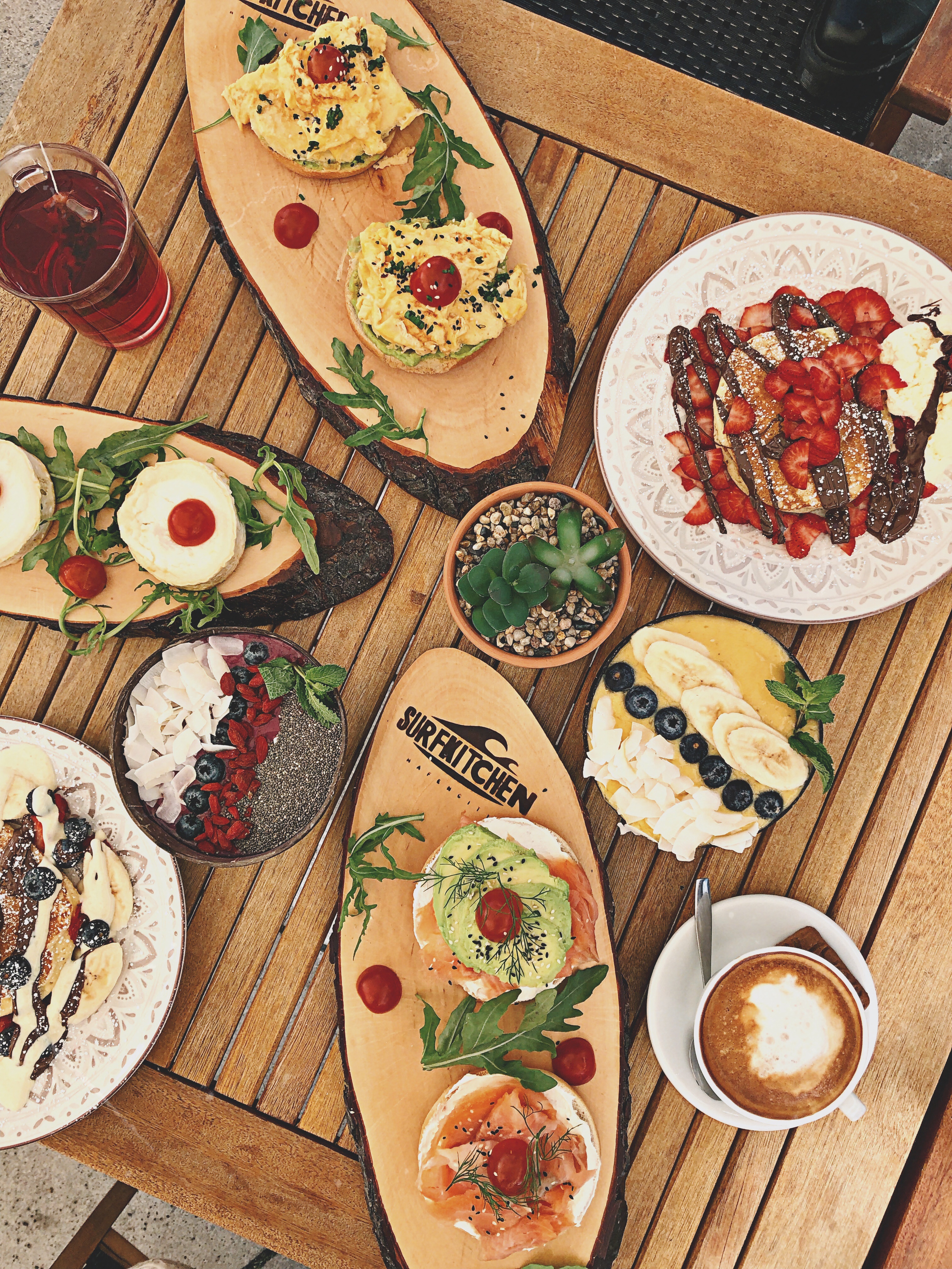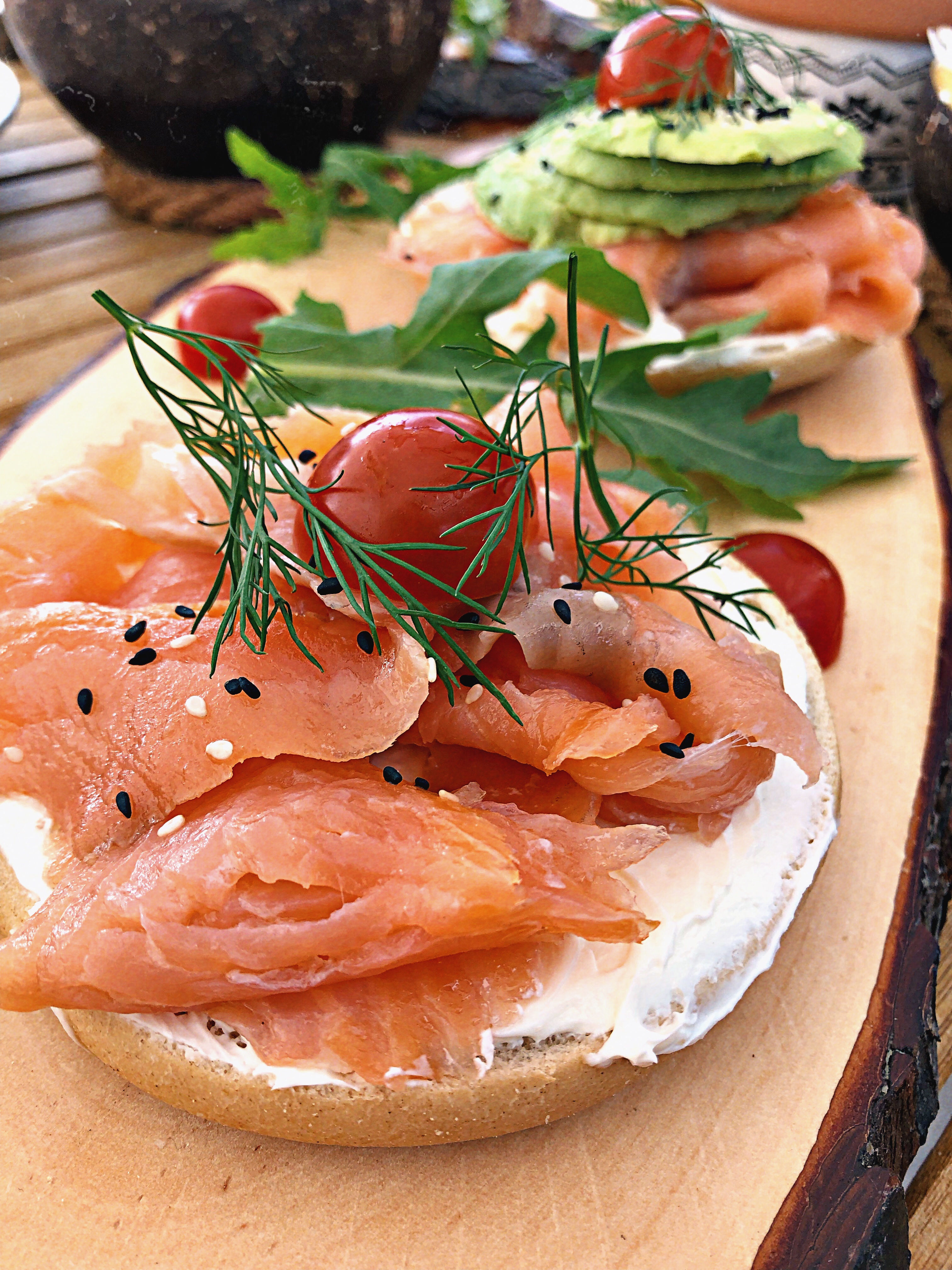 Da wir uns mal wieder nicht entscheiden konnten, haben wir kurzerhand die halbe Karte geordert und uns die Açaí Bowl, die Mango Smoothie Bowl, den Lachs und auch den Avocado-Rührei-Bagel, die Ziegenkäsetaler, die Blueberrypancakes und die Pancakes mit frischen Erdbeeren, Eis und Schokosauce gegönnt. Mein persönliches Highlight war tatsächlich der Avocado-Rührei-Bagel. Der Bagel war einfach super knusprig und ein kleiner Tipp: in Kombination mit dem Ziegenkäse ist er einfach unschlagbar 😉