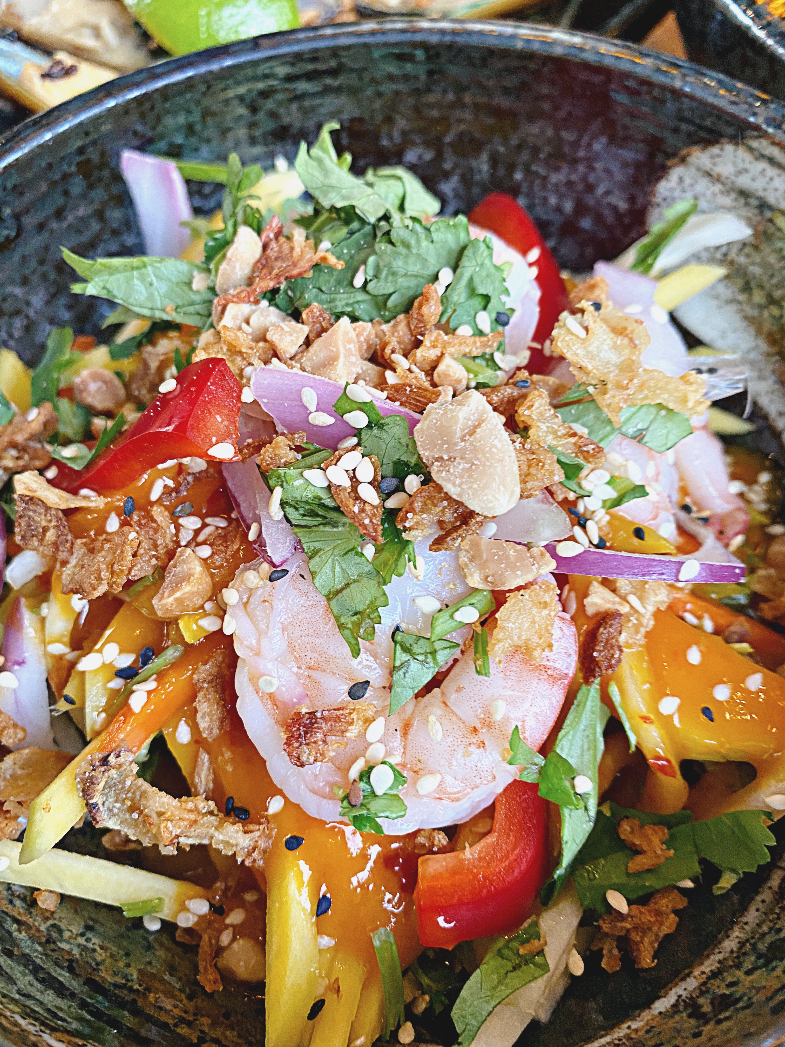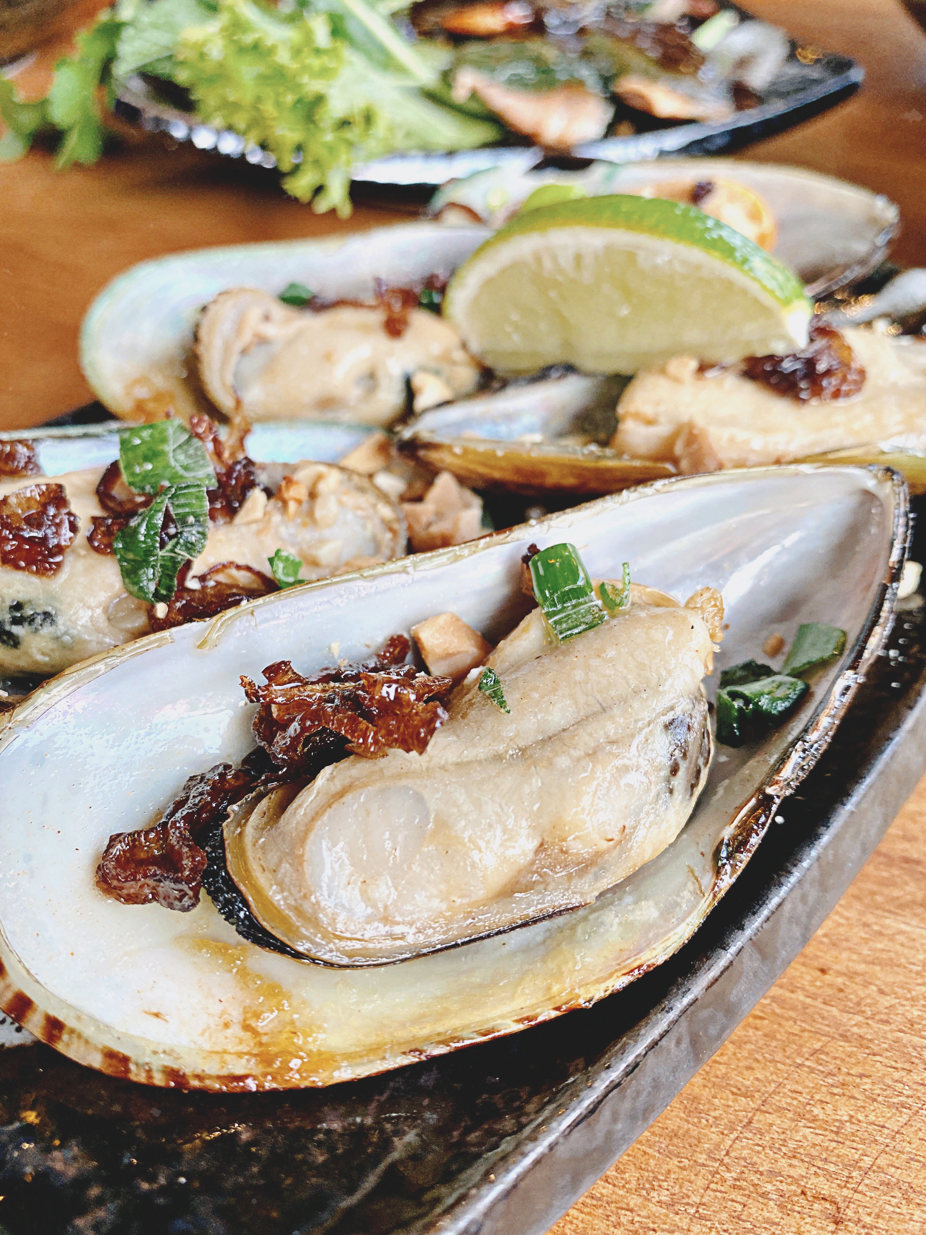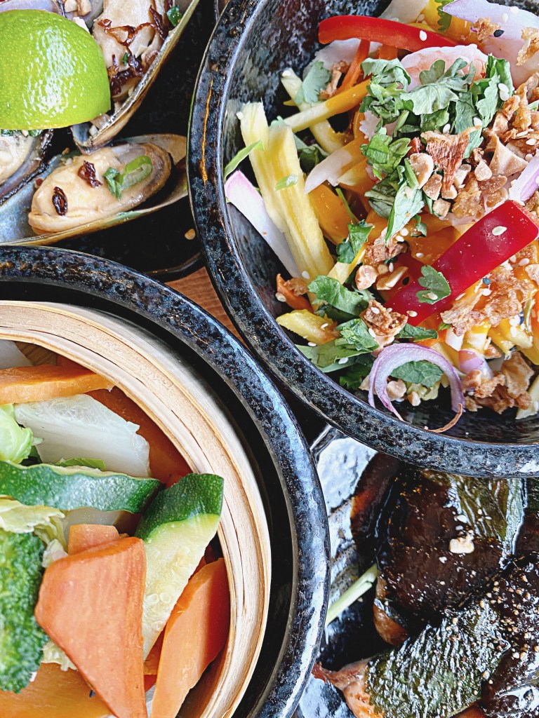 Wir haben uns für verschiedene Tapas entschieden und hatten gebratenes Gemüse mit Tofu, gegrillte Garnelen mit Zitronengras und Chillichoten, gedämpftes Gemüse, Mangosalat mit Garnelen, gegrillte Grünschalenmuscheln, gegrillten in Shiso Blättern eingerollten Lachs und mit Knoblauch gebratenes Saisongemüse. Das Essen war im Allgemeinen sehr lecker, nur leider waren zwei der Muscheln nicht gut und was wir wirklich nicht in Ordnung fanden, war, dass das dem Laden ganz egal war und sie uns nicht entgegen gekommen sind. Begeistert war ich allerdings von meinem Dragon Phoenix Tee mit Goji Beeren. Als Dessert haben wir uns noch die knusprige Banane im Sesamteigmantel mit Kokosstreifen und Honig und das hausgemachte Panna Cotta mit Mangosauce bestellt und das ließ mich dann auch die schlechten Muscheln vergessen 😉
