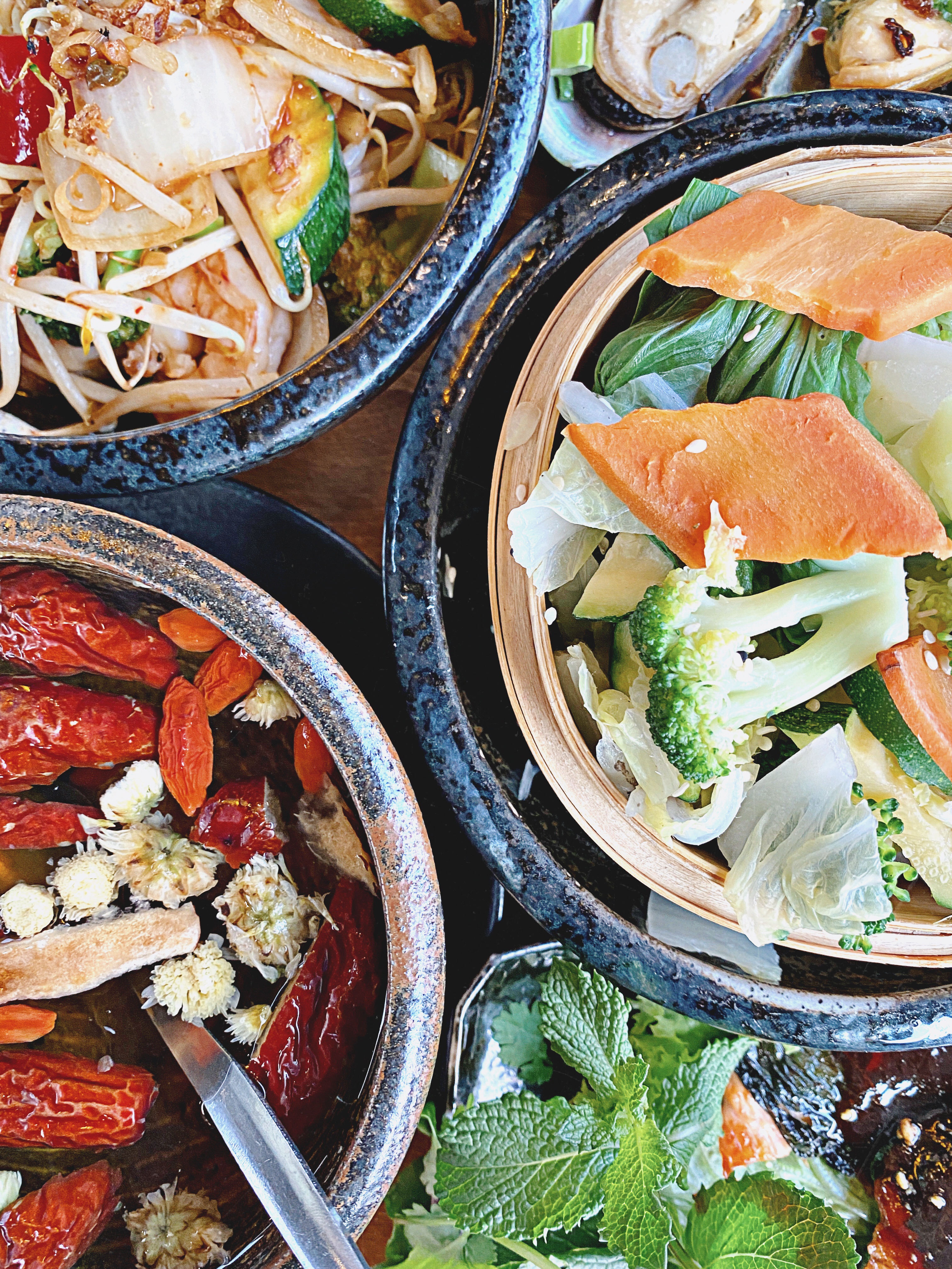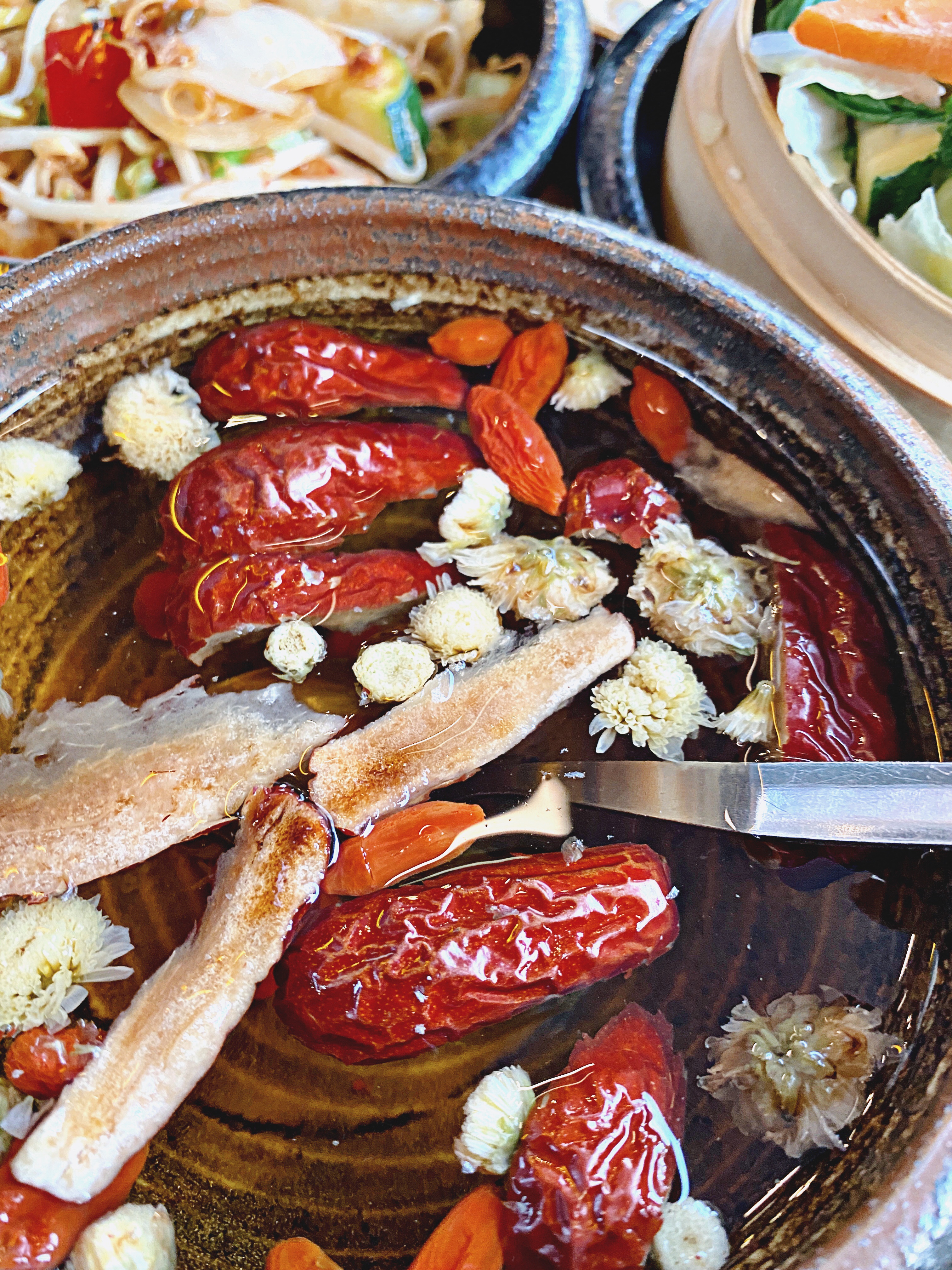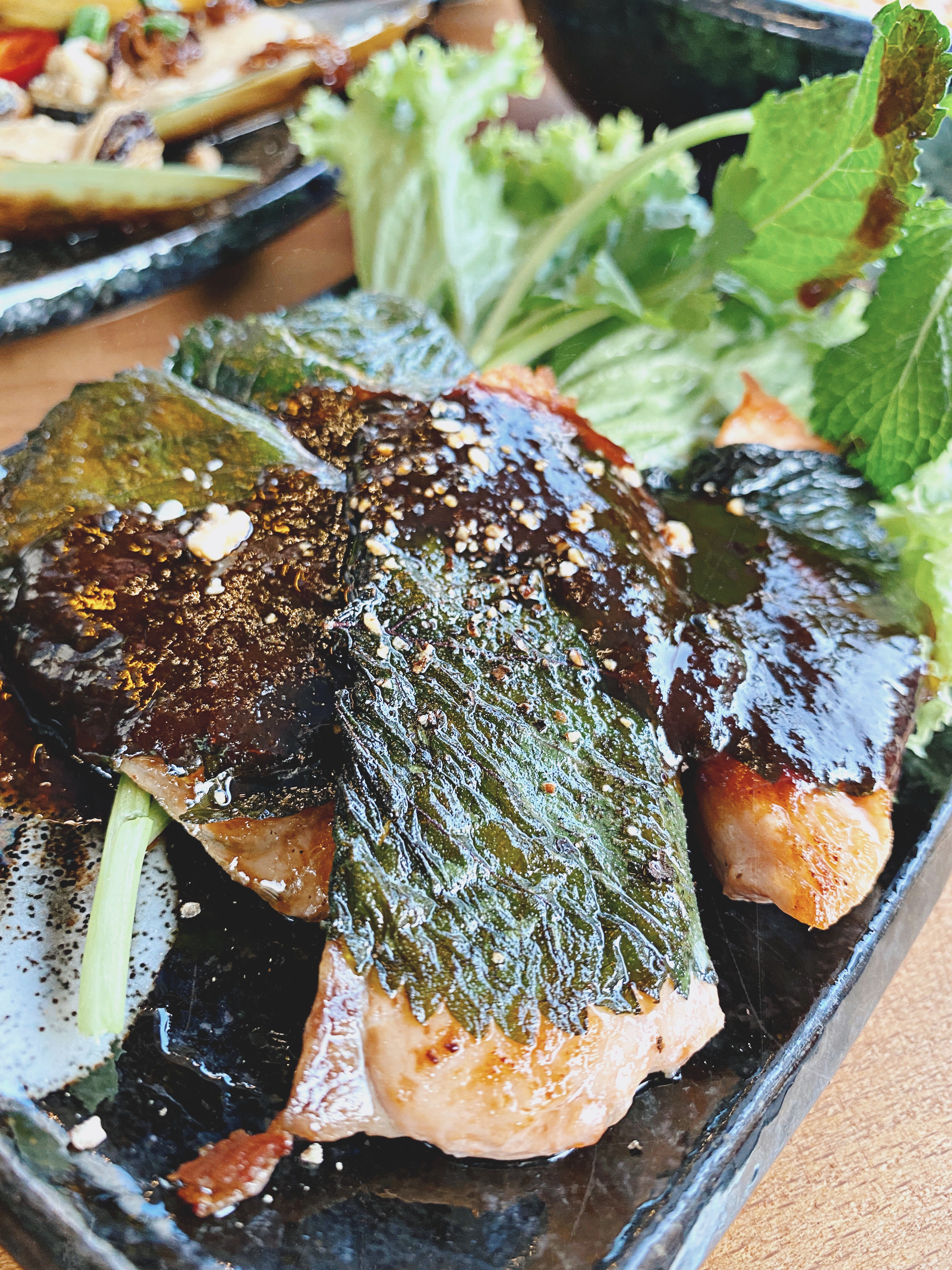 Wir haben uns für verschiedene Tapas entschieden und hatten gebratenes Gemüse mit Tofu, gegrillte Garnelen mit Zitronengras und Chillichoten, gedämpftes Gemüse, Mangosalat mit Garnelen, gegrillte Grünschalenmuscheln, gegrillten in Shiso Blättern eingerollten Lachs und mit Knoblauch gebratenes Saisongemüse. Das Essen war im Allgemeinen sehr lecker, nur leider waren zwei der Muscheln nicht gut und was wir wirklich nicht in Ordnung fanden, war, dass das dem Laden ganz egal war und sie uns nicht entgegen gekommen sind. Begeistert war ich allerdings von meinem Dragon Phoenix Tee mit Goji Beeren. Als Dessert haben wir uns noch die knusprige Banane im Sesamteigmantel mit Kokosstreifen und Honig und das hausgemachte Panna Cotta mit Mangosauce bestellt und das ließ mich dann auch die schlechten Muscheln vergessen 😉