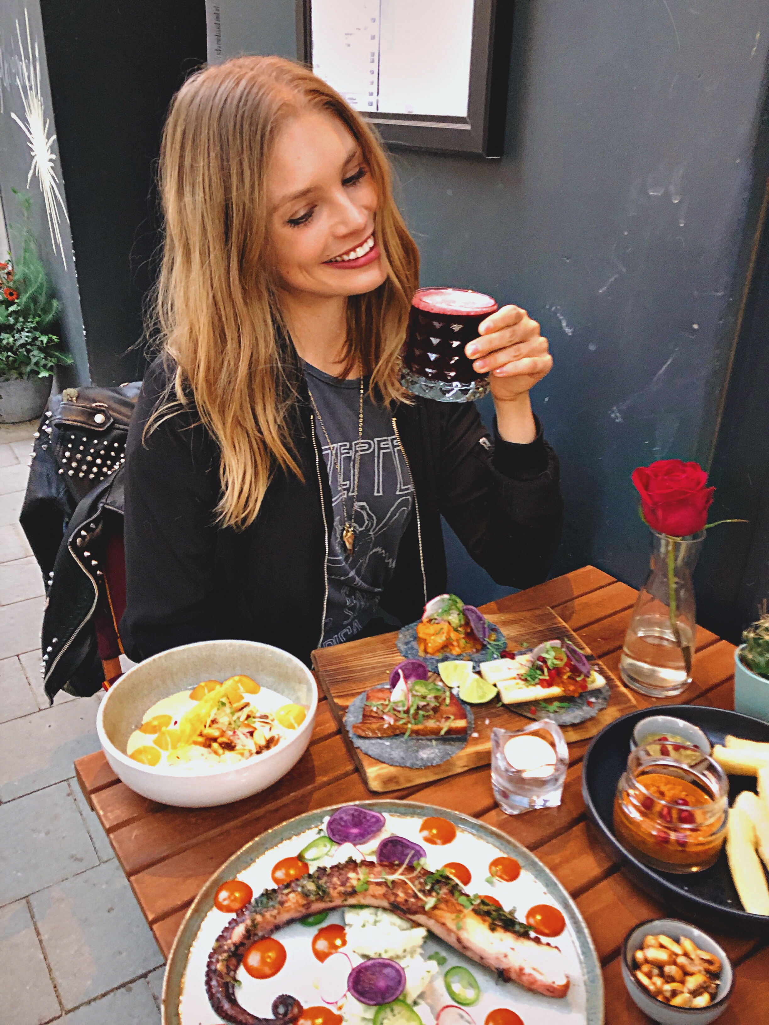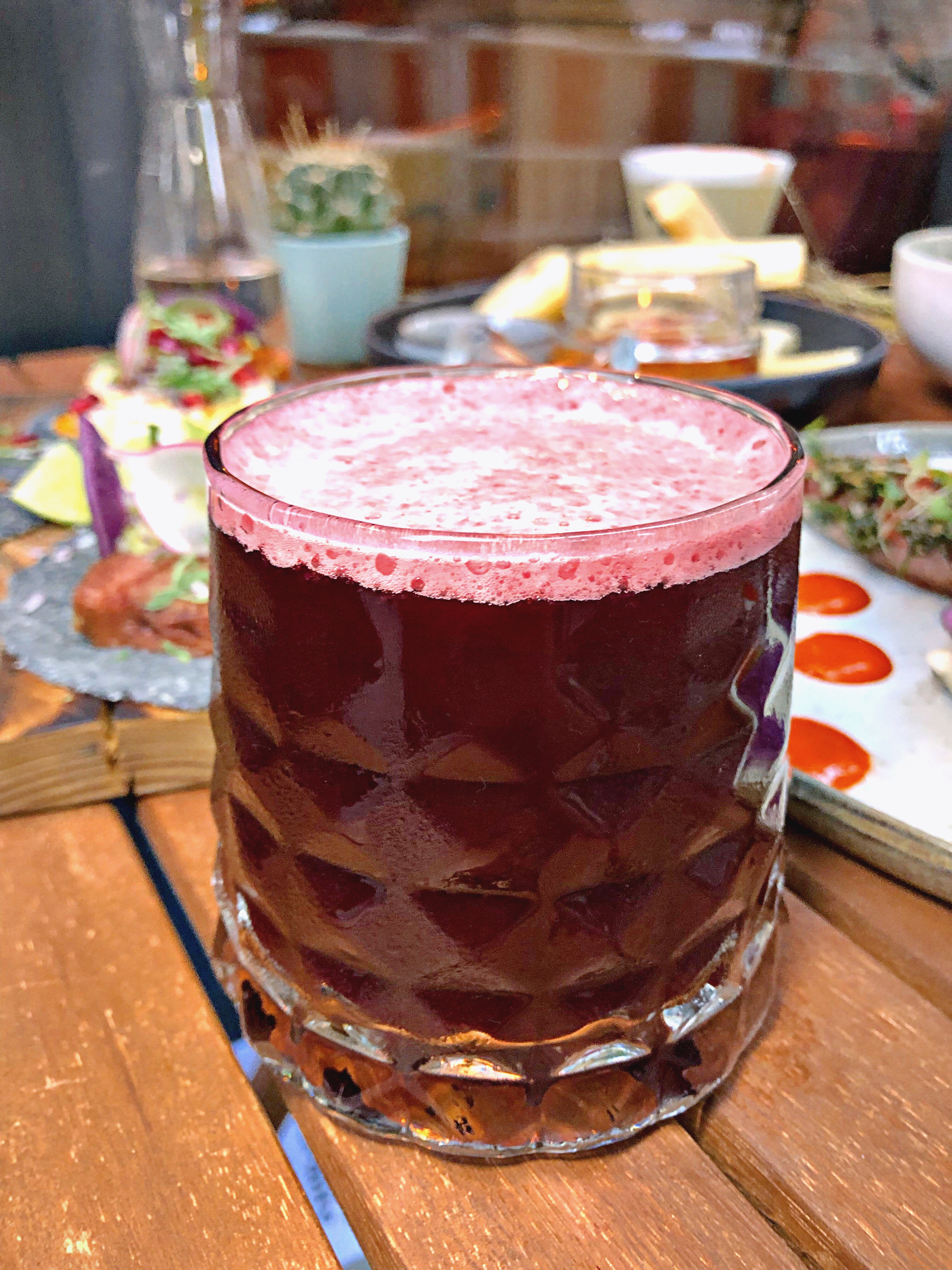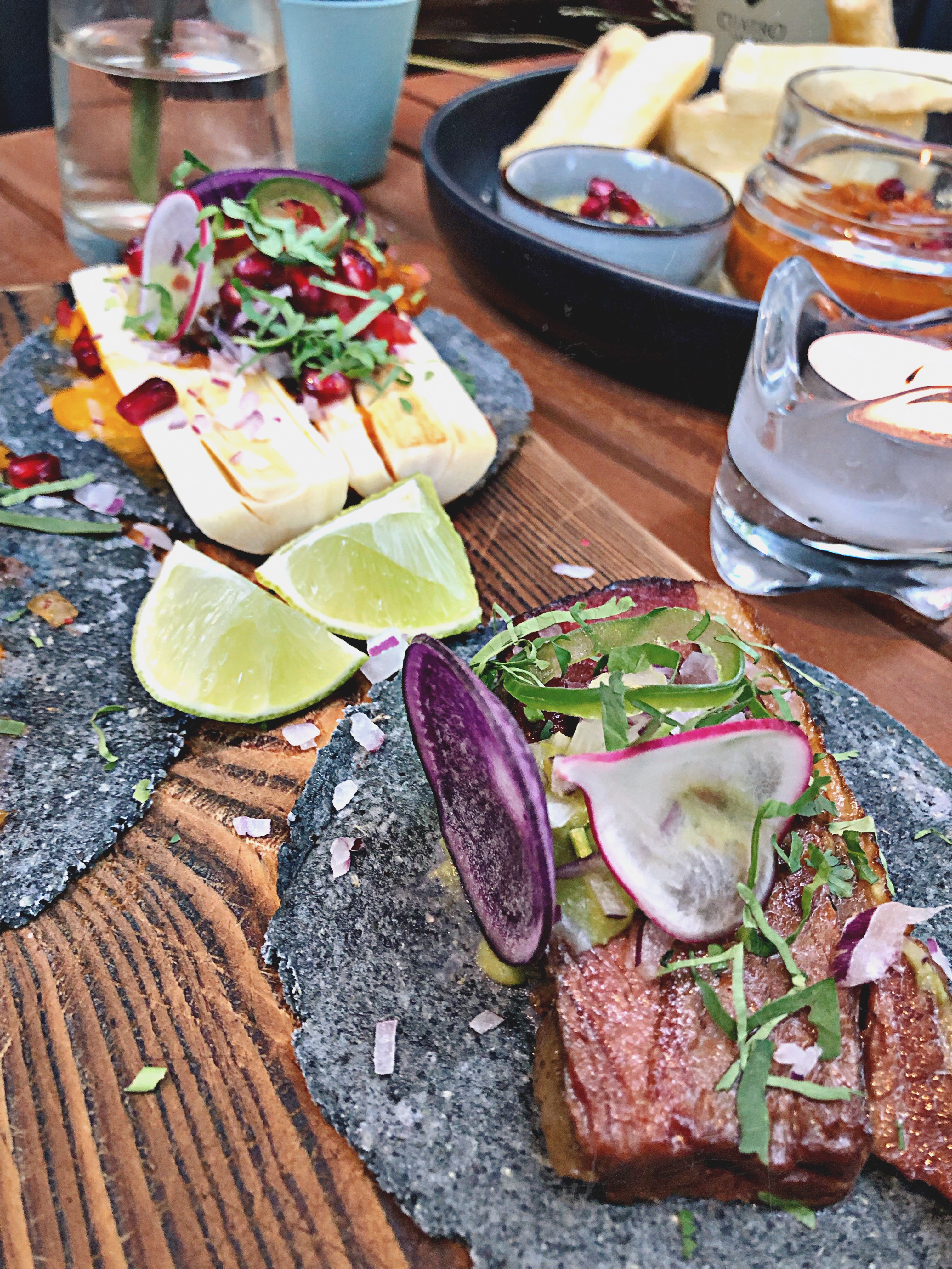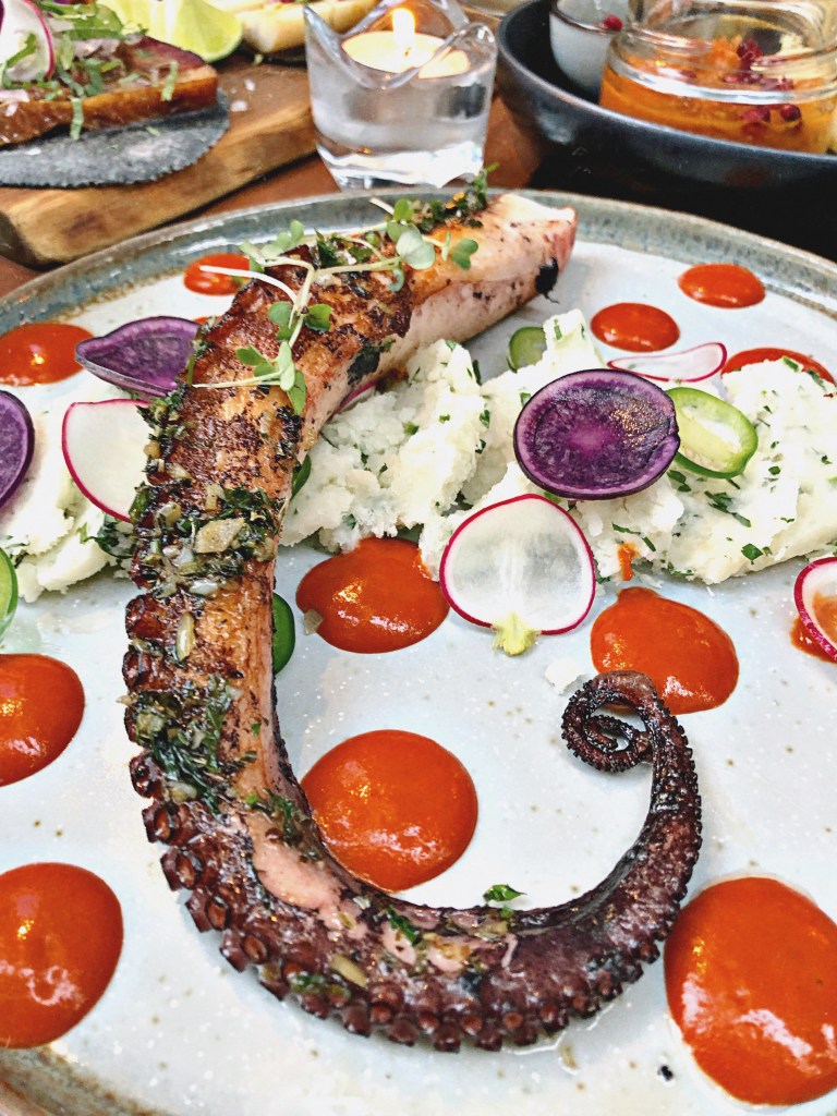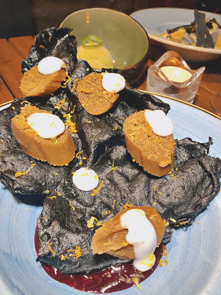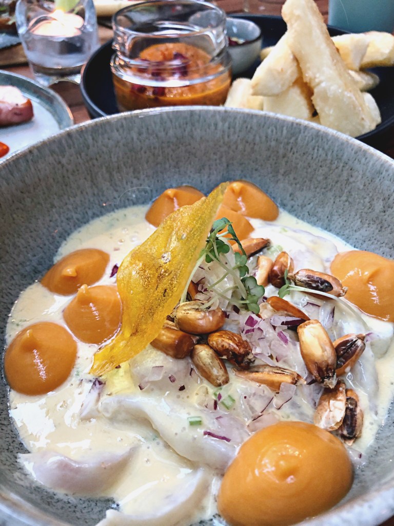 Wir haben uns zunächst Chicharra Morada, ein frisches Getränk nach peruanischem Rezept aus lila Andenmais, und Chilcano Power, original peruanische Pisco, frische Limette, Ginger Ale und Angostura Bitter, bestellt. Uns wurden die Tacos de Mariachi „Mx“ empfohlen und wir müssen gestehen, dass diese Tacos wirklich fabelhaft sind! Sie sehen auch großartig aus, da der Teig schwarz ist und sie wirklich schön angerichtet werden. Natürlich musste ich mir auch den gegrillten Oktopus bestellen, der auf kaltem Maniokteig mit Yaku-Chimichurri, Forellenkaviar und einer Chillichoten-Limettensauce serviert wird. Besonders begeistert waren wir zudem von dem peruanischen Nationalgericht, dem Ceviche. Das Yaku Ceviche besteht aus rohem Wolfsbarsch in Limettensauce mit peruanischen gelben Chilli gegart, dazu mit gelben Chillischoten bestreutes Sufkartoffelpüree. Als Beilage hatten wir noch gebratene Maniokstangen. Wer mich kennt, weiß natürlich, dass wir uns auch den Nachtisch nicht entgehen lassen konnten. Wir haben uns direkt einmal quer durch probiert und Maíz Pilconcillo, das ist festes Zuckerrohr mit einer Creme aus Kokosnuss und Mescal mit schwarzer Vanille und Maisknusper, Miks I Hanka „pe“, sprich Biskuit Kuchen, Minz Mousse und Orangenmeringue und Heladito Rico, jalapeño Eiscreme, bestellt. Mir persönlich gefiel das Zukkerrohr am besten und nicht nur, weil es ganz toll aussah, der Geschmack ist für mich völlig neu und spannend gewesen! Der Biskuit Kuchen war sehr süß 😉