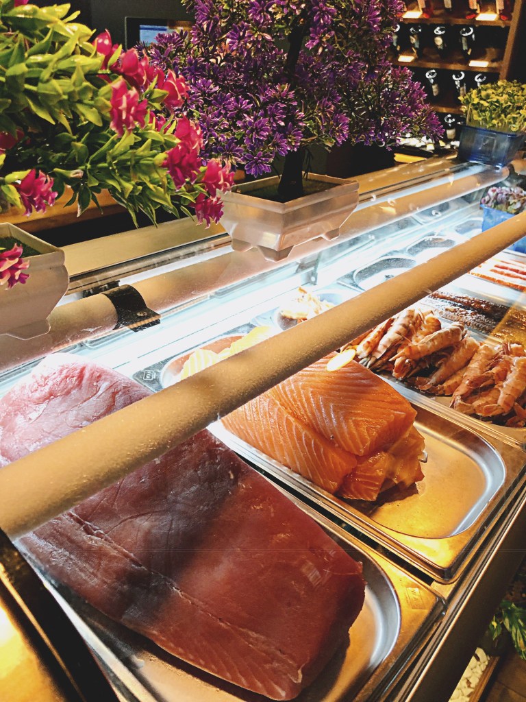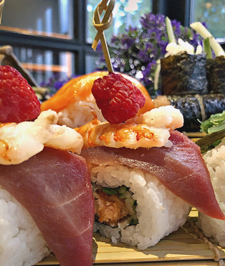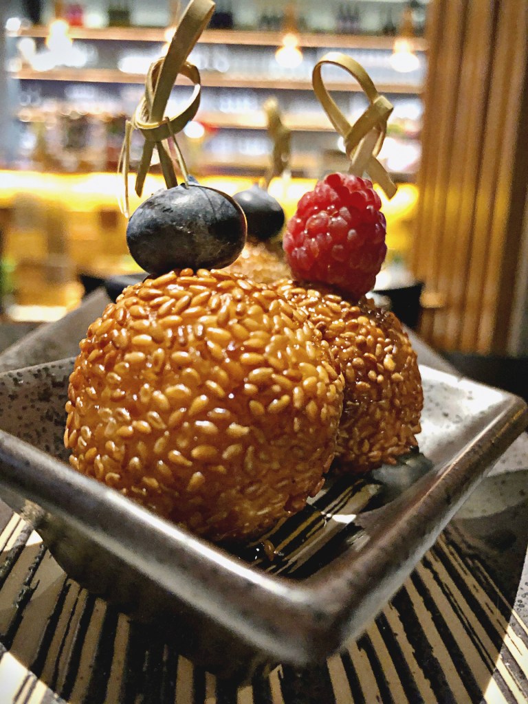 Wir hatten mit Garnelen gefüllte Dumplings als Vorspeise und die Kamasutra Sushi Platte mit riesigen und sehr leckeren Sushirollen. Unter anderem waren eigene Kreationen vom Sushi Chef dabei, die mit Himbeeren verziert wurden. Die Platte wird wirklich zauberhaft angerichtet, das Sushi liegt auf einem Drehteller und ist umgeben von einem Miniaturkirschbaum, einem kleinen Häuschen und einem Brunnen, aus dem Trockeneisnebel kommt. Durch den Nebel wirkt das Ganze einfach atemberaubend. Auch die Getränke sind einen Besuch wert. Wir hatten eine hausgemachte Limonade mit Ingwer und ein Kopf über Bier (ähnlich wie ein Alsterwasser). Natürlich haben wir uns auch noch einen Nachtisch bestellt, die hausgemachten Seesambällchen, gefüllt mit Bohnenpaste und serviert mit Honig und Beeren.