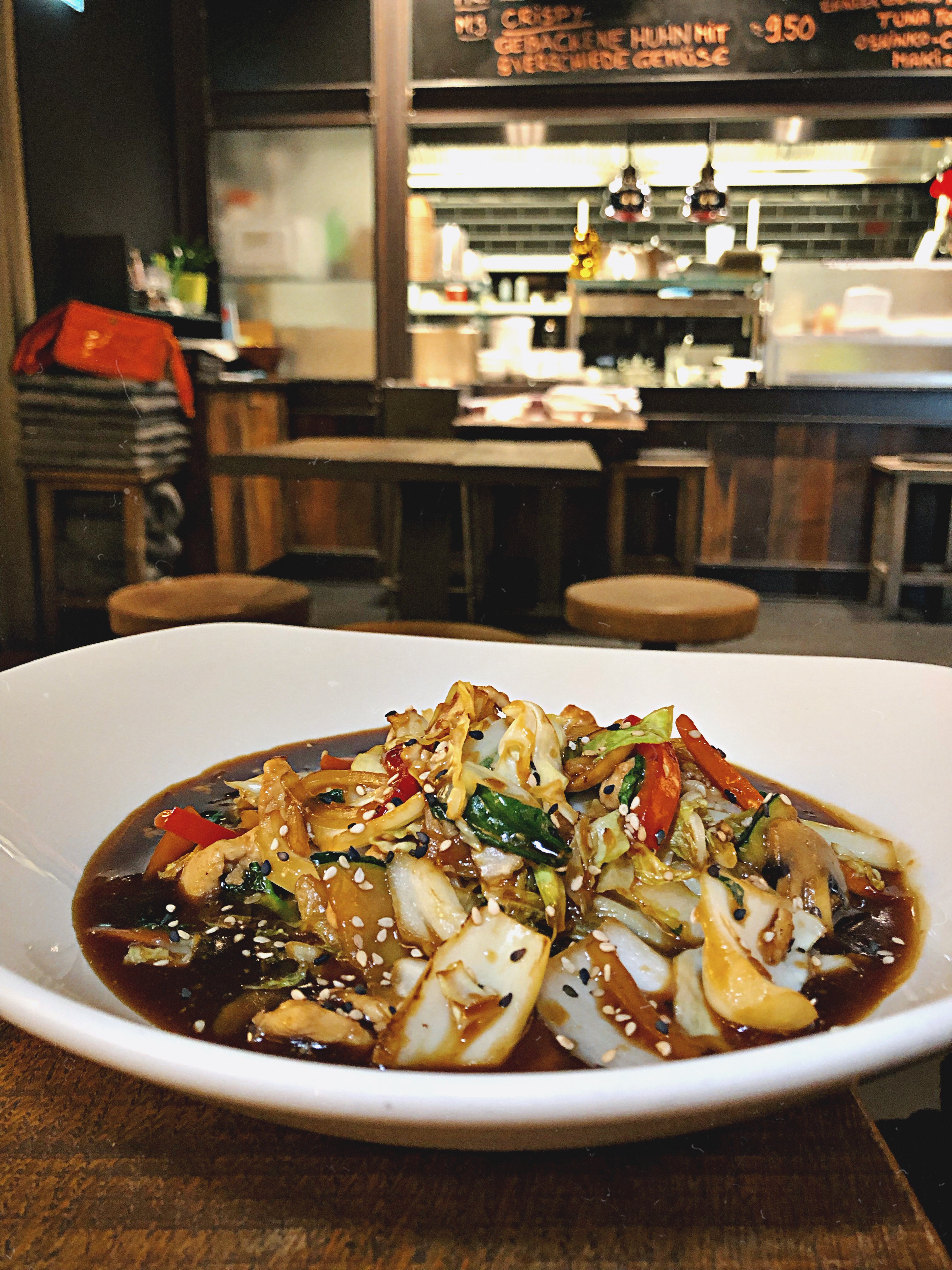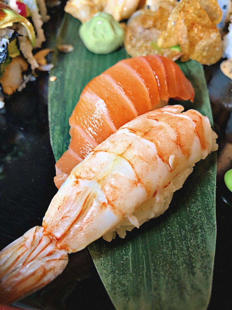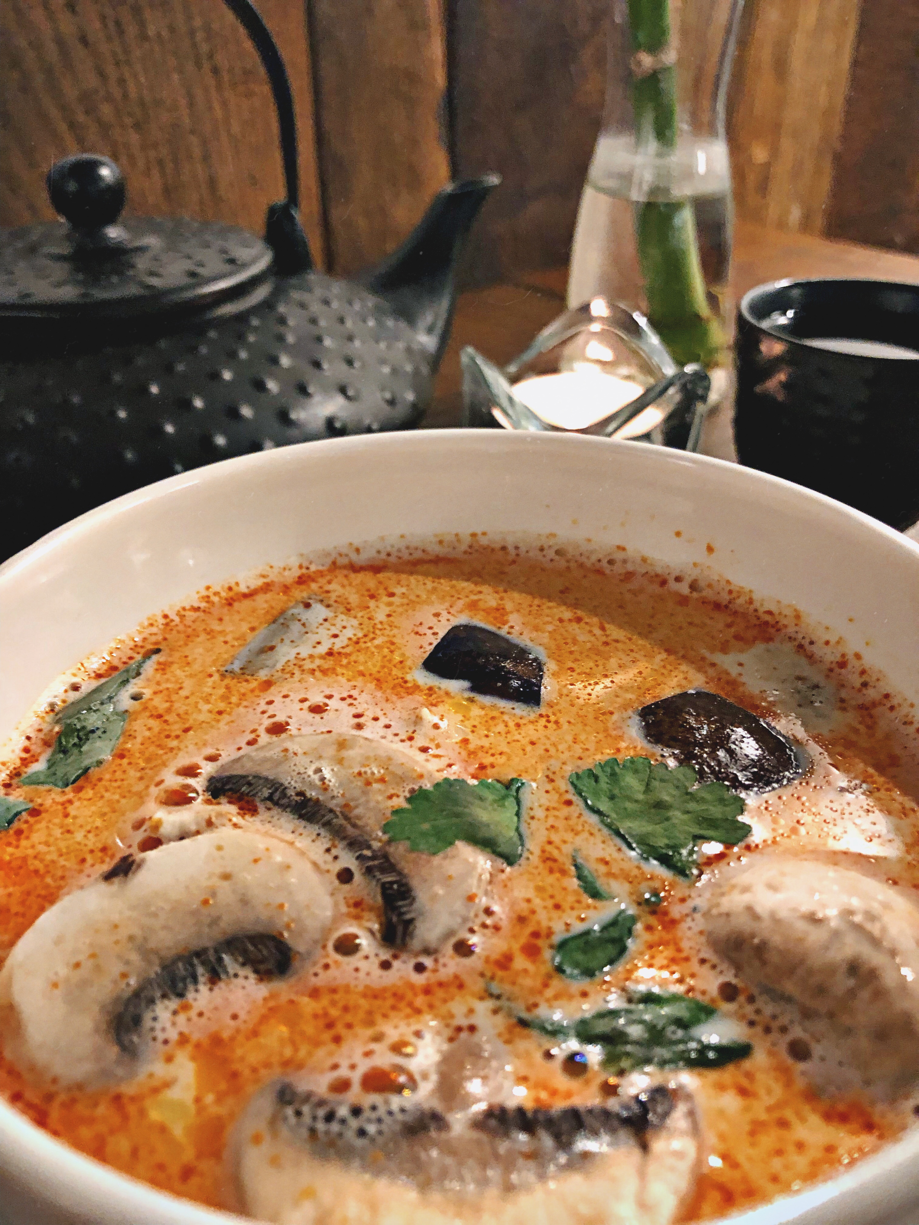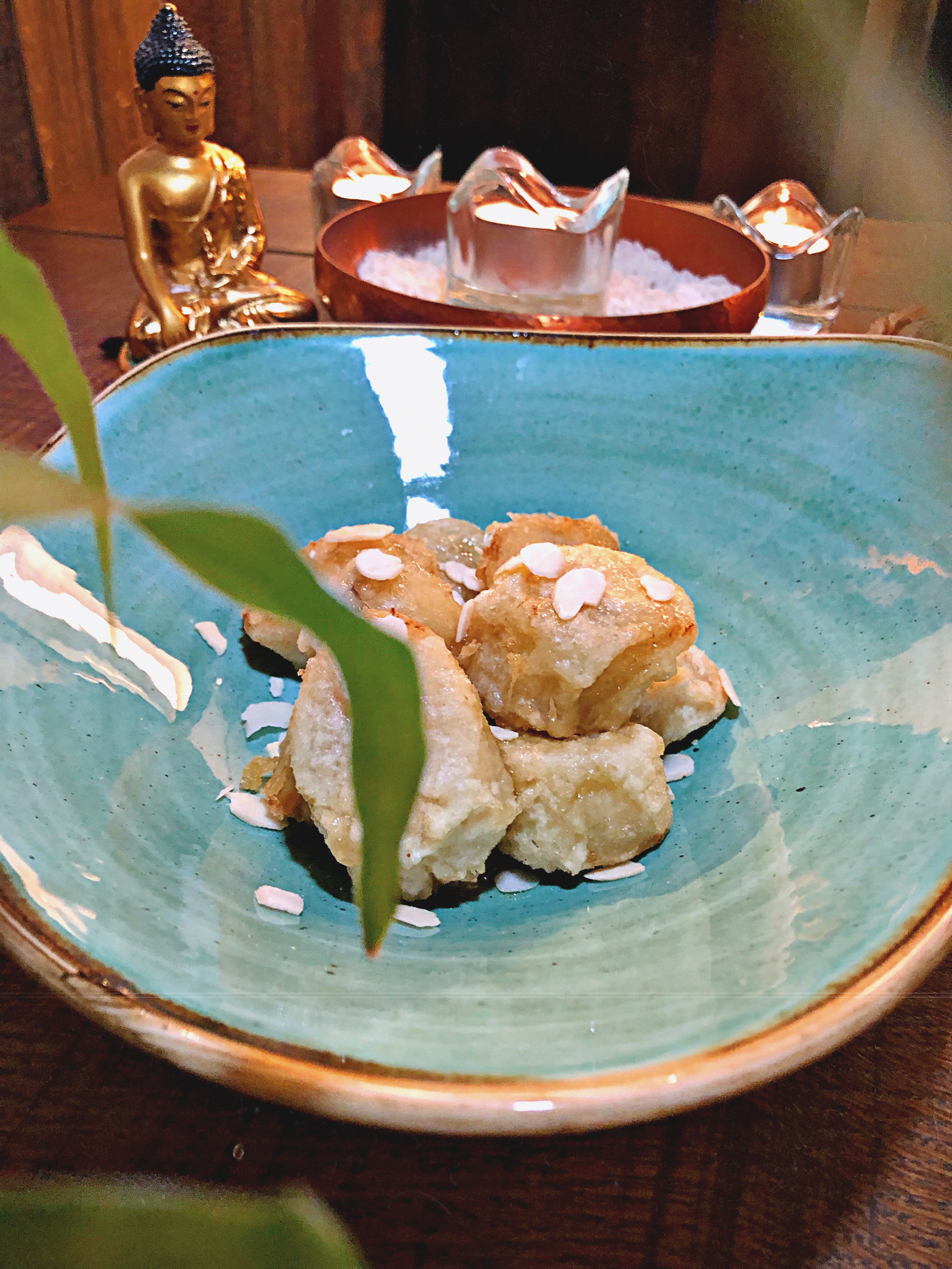Angefangen haben wir mit einer Tom Kha Gai Suppe – die Tage werden ja auch wieder kälter und da ist eine heiße Kokossuppe genau das Richtige. Als Hauptgerichte hatten wir Teriyaki Huhn mit frischem Gemüse und eine Sushi Platte mit der besonders leckeren Wakimi Lachs Special Roll, einer für uns kreierten Special Roll mit Avocado und ein paar Nigiri. Der Fisch war wirklich frisch und die Rollen sehr schön angerichtet. Getrunken haben wir grünen Tee und Jasmin Tee, die beide in typischen Teekannen serviert wurden. Zu unser großen Freude gab es auch noch ein Dessert und zwar eine gebackene Banane mit Honig und Nüssen und das war ein fantastischer Abschluss.