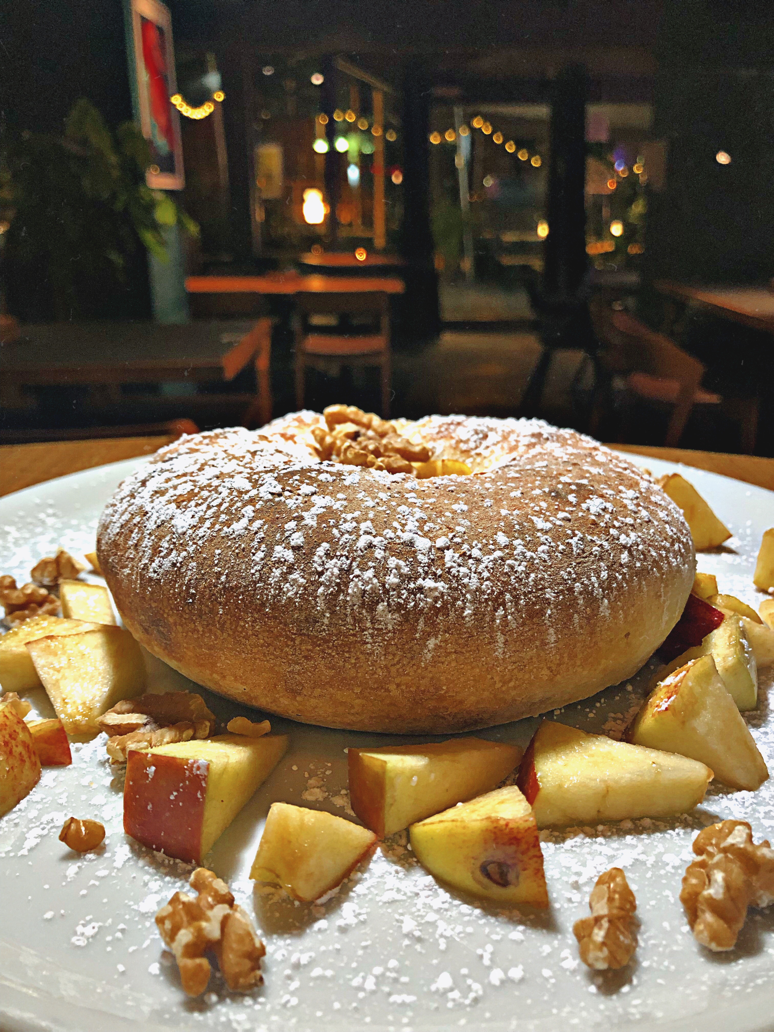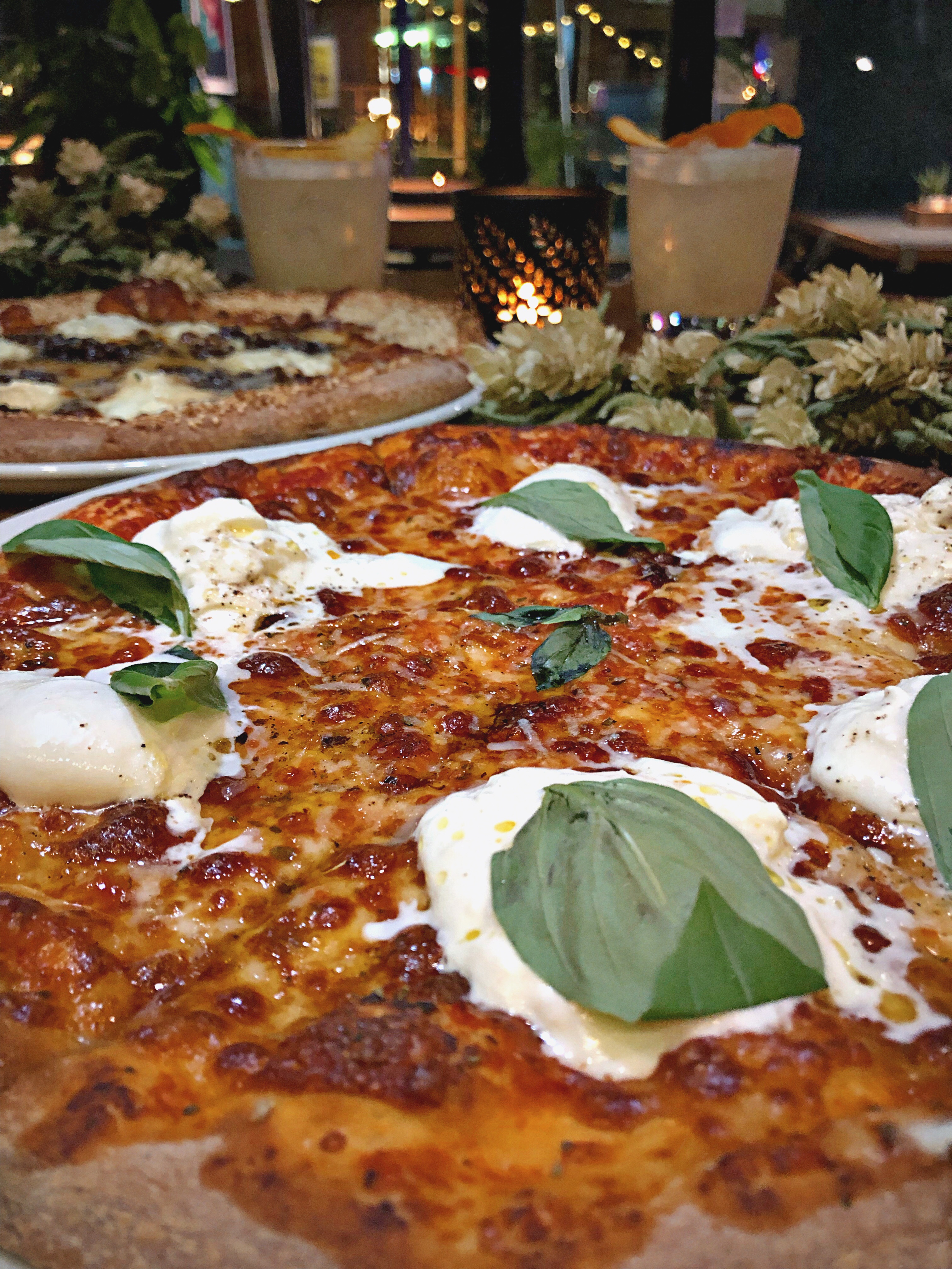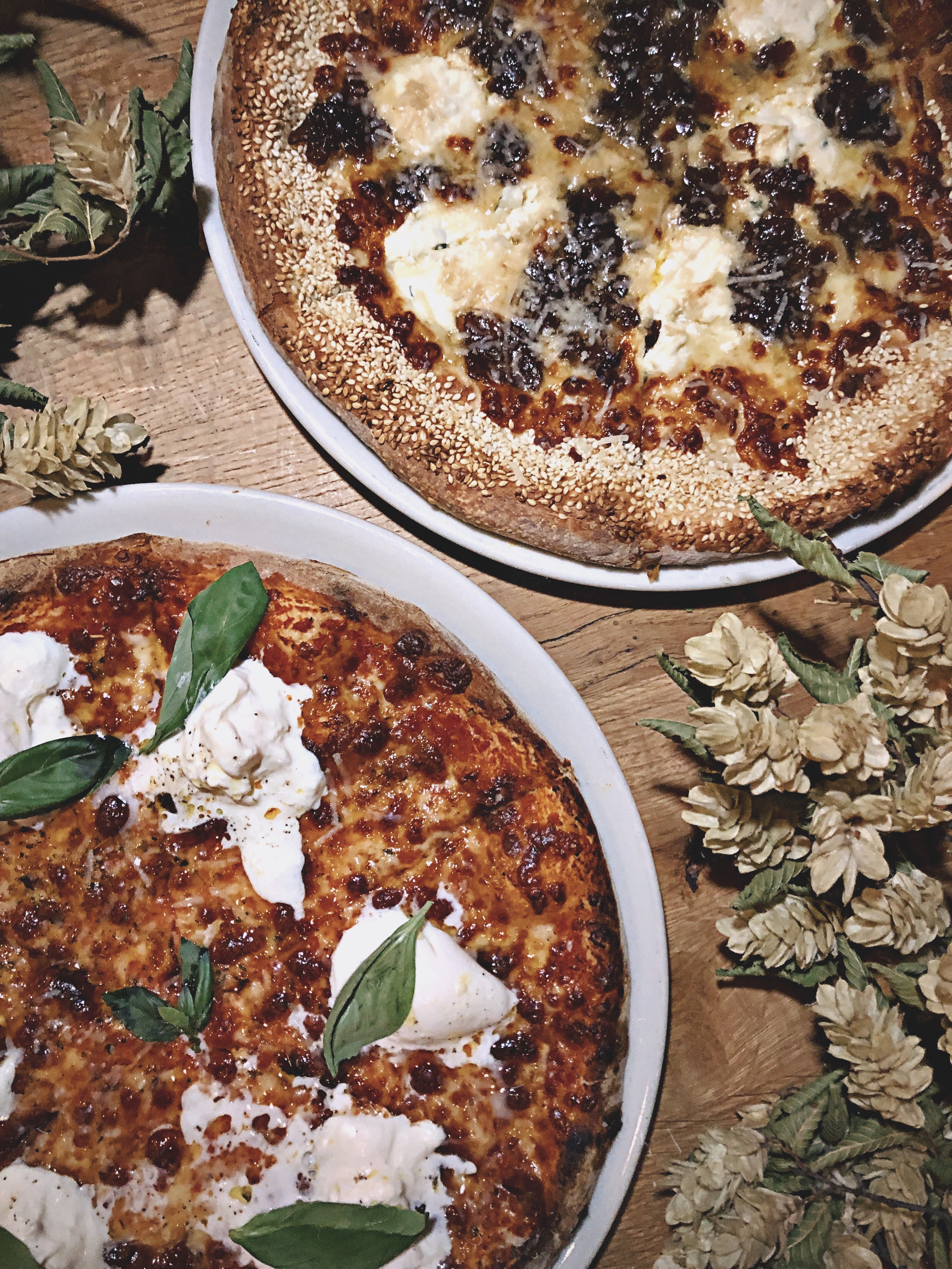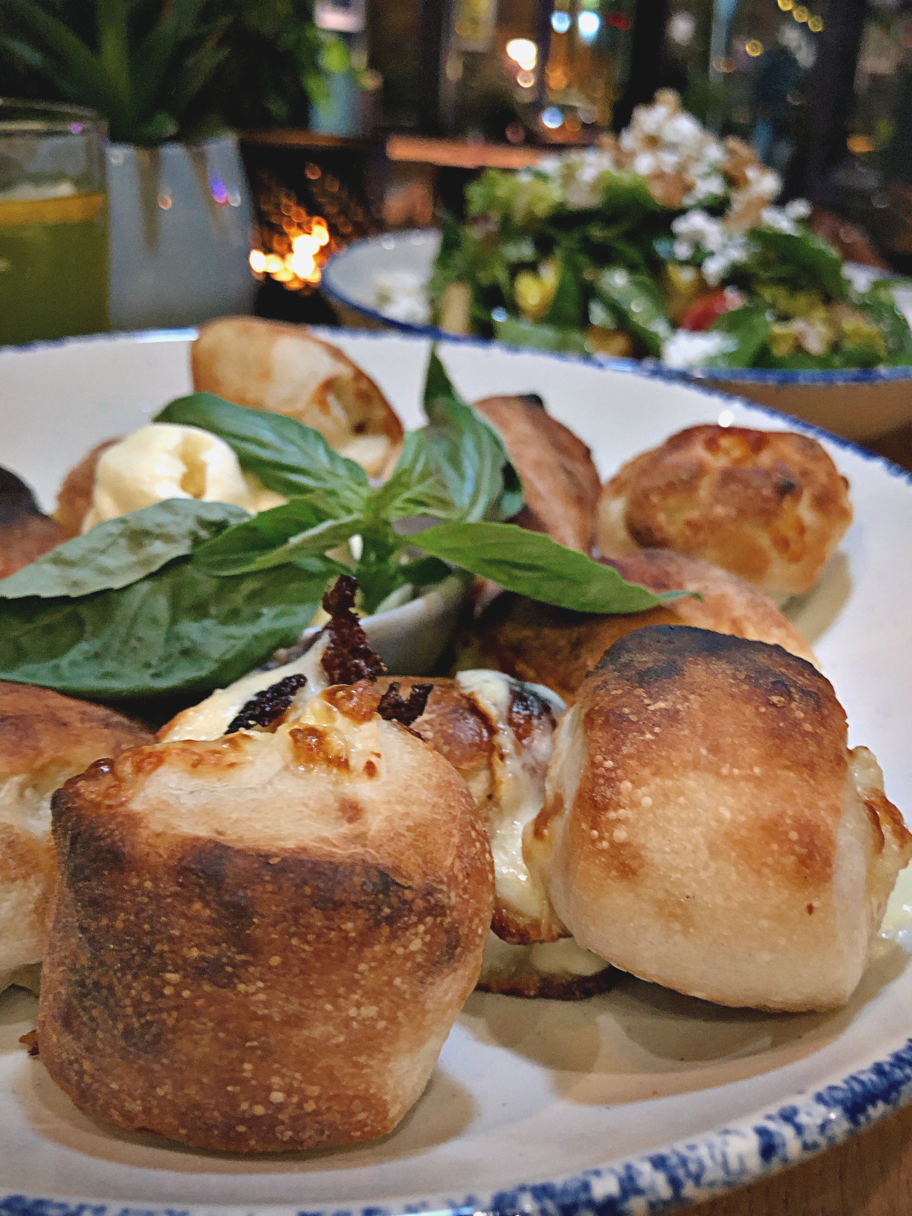 Den Abend haben wir mit einem Gin Basil Smash und einem Mojito begonnen und uns dann einen G.O.A.T. Salad und Pizzabrötchen mit Mozzarellafüllung und Trüffel-Dip bestellt. Bei den Pizzen haben wir uns für die Signature Pizza “Mission Pizza” mit Ricotta, Mozzarella, Zwiebelmarmelade, Sesamkruste, Olivenöl und Parmigiano Reggiano und die “Queen M” – Margherita mit frischem Burrata, entschieden. Beide Pizzen sind sehr geschmacksintensiv. Als Nachtisch kam dann noch ein Nutella Ring mit Nüssen und natürlich zwei weitere Cocktails, Gin Sour (auf Wunsch/ nicht auf der Karte). Unser Favorit waren tatsächlich die Pizzabrötchen, die waren einfach unglaublich!