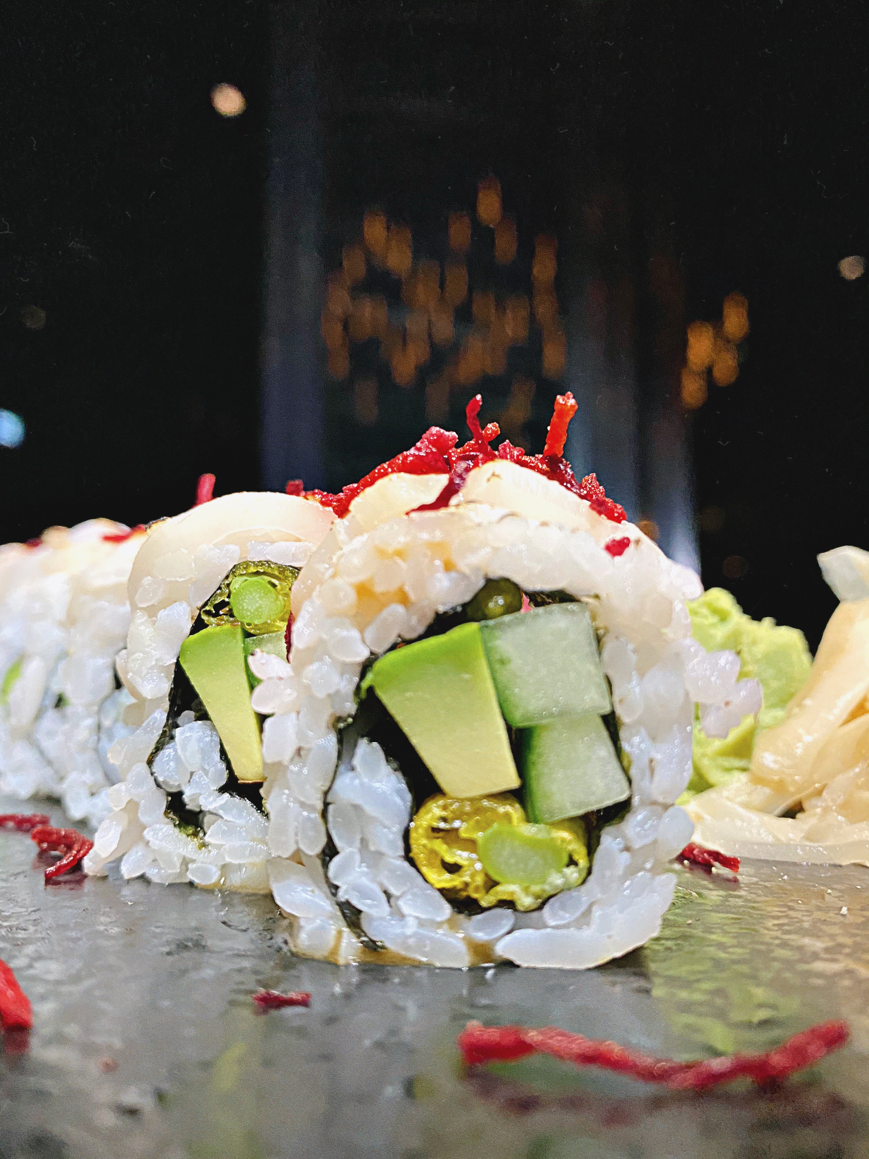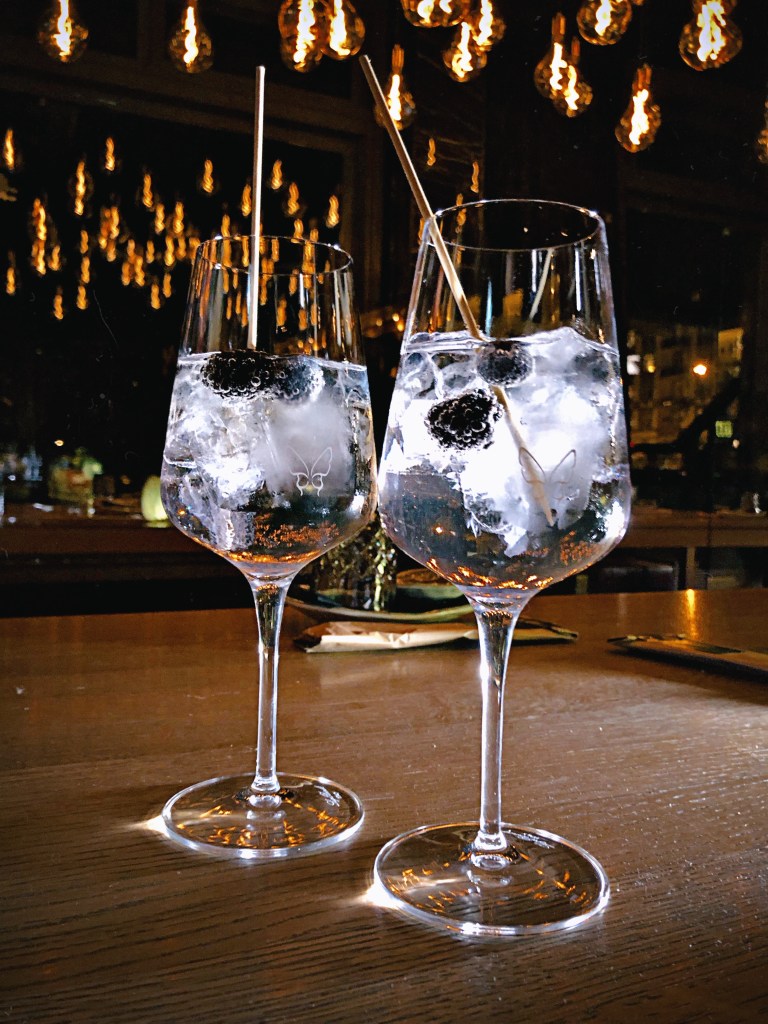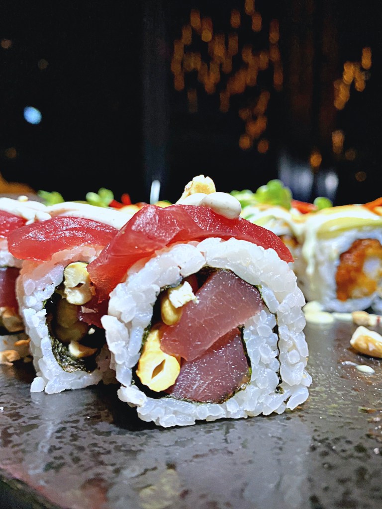 Wir haben den Abend mit zwei leckeren Cocktails gestartet – dem Bellini (Champagner, Peachtree und Pfirsichpüree) und dem Martini Parisien ( Tanqueray Gin, Antica Formula und Créme des Cassis) und uns dann die Pink Lady (Tunatatar, gebackene Garnele, Leche de Tigre, Avocado, Koriander und spicy Topping), Evolution (Thunfisch, Cashewnüsse und Trüffelmayo), White Pearl (Jakobsmuschel, Avocado, Thai Spargel, Gurke und Trüffel Ponzu) und Creamy Crunchy (Lachs, Thai Spargel, Gurke und Frischkäse) bestellt. Unser Highlight waren die Pink Lady und die knusprigen Creamy Crunchy. Die Platten werden sehr edel angerichtet und kommen umgeben von Trockeneis-Nebel. Die Sushi Rollen sind sehr groß und wenn ihr nicht extrem viel Hunger mitgebracht habt, empfehlen wir erstmal nur drei Rollen zu bestellen und lieber noch etwas Platz für einen der leckeren Nachtische zu lassen. Wir haben das bedauerlicher Weise tatsächlich nicht mehr geschafft und uns stattdessen einfach noch einen Drink bestellt. Zu meiner Freude haben wir sogar Frangelico mit Limone bekommen und dann noch einen Prosecco mit Lavendellimonade.