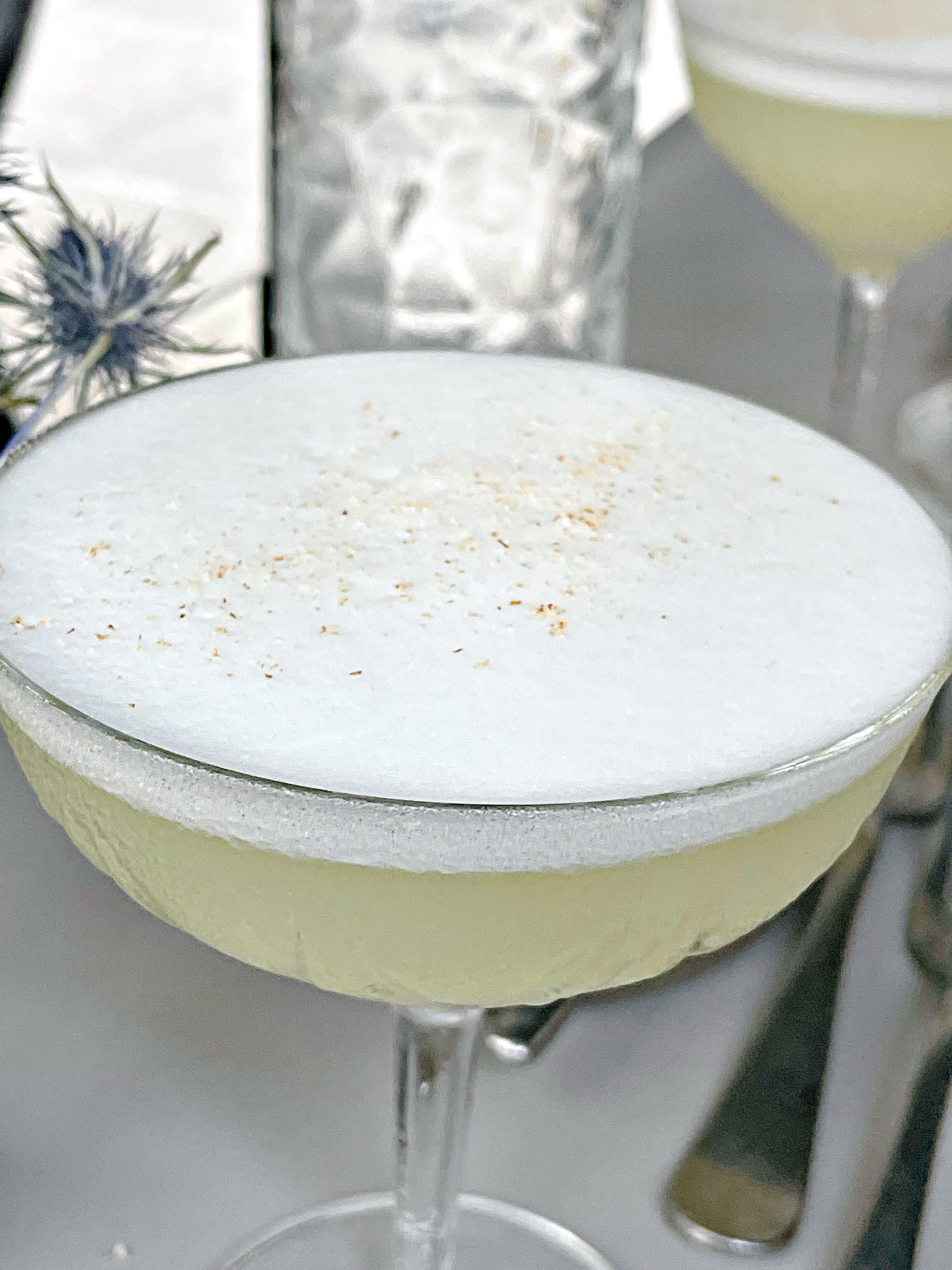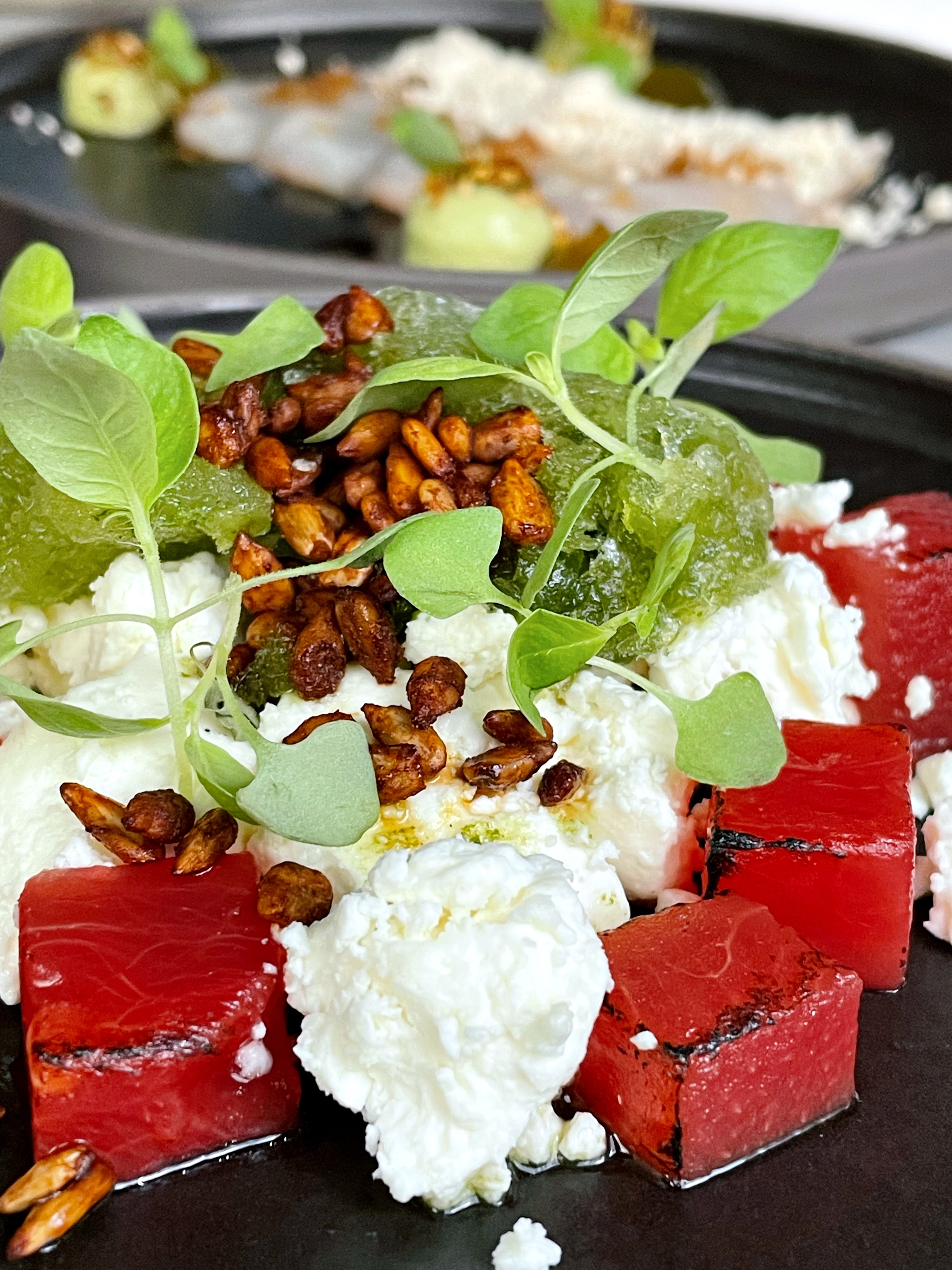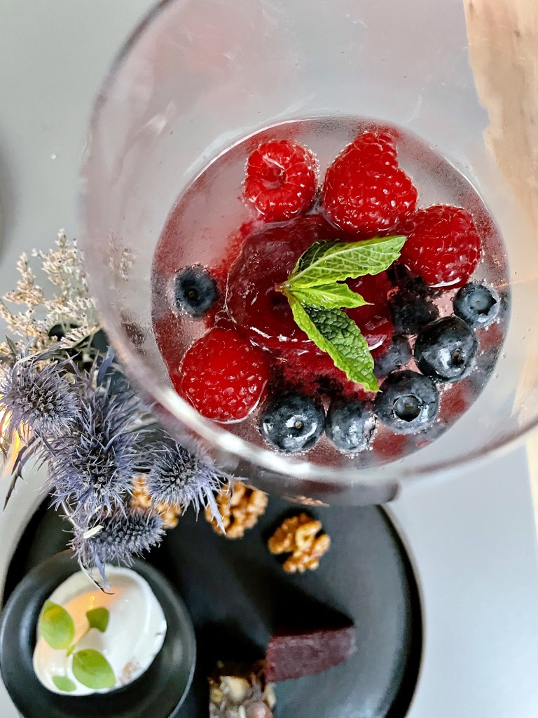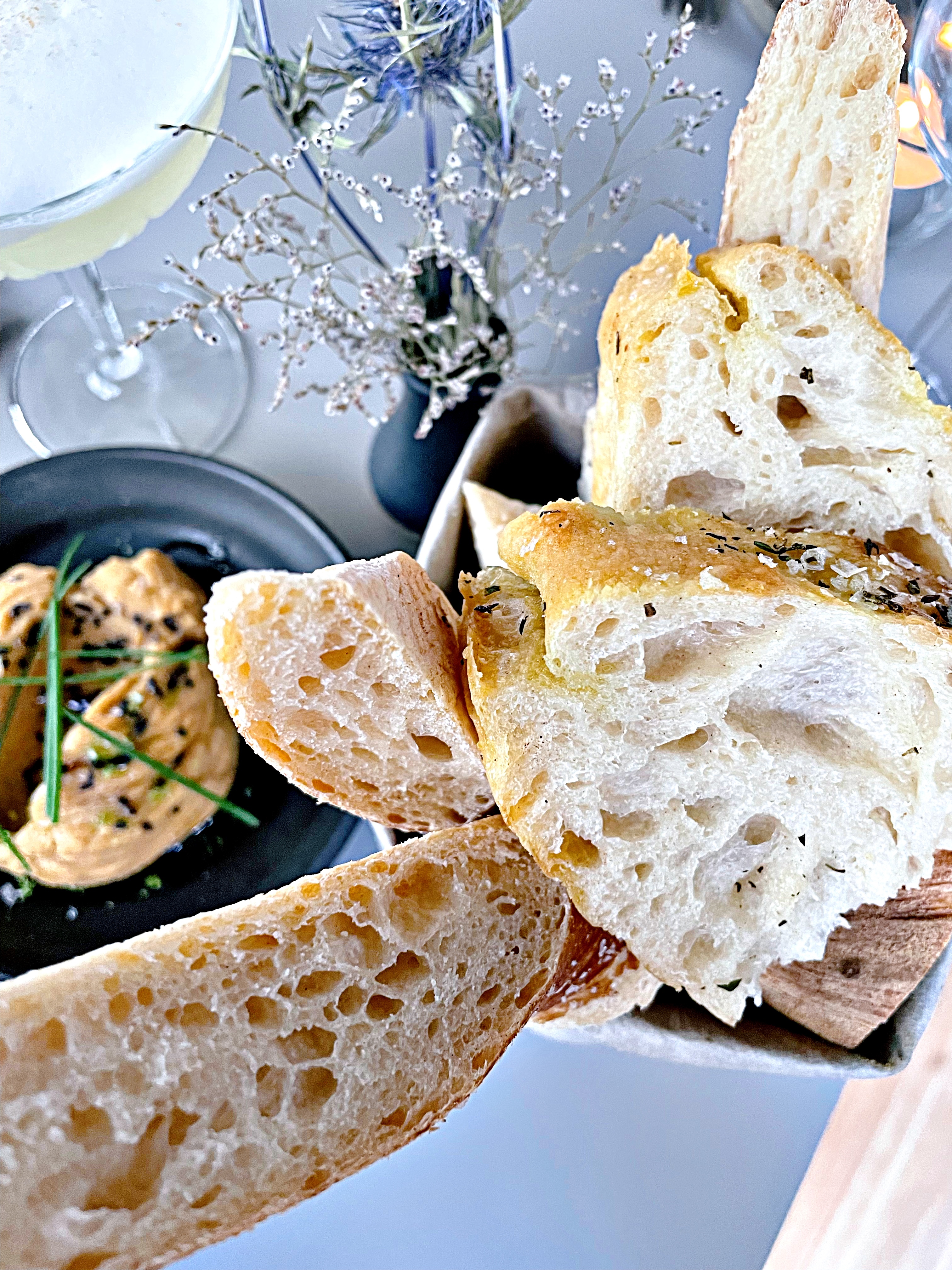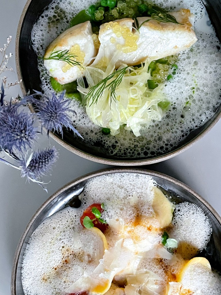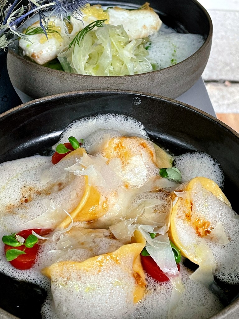 Begonnen haben wir den Abend mit einer Empfehlung des Hauses, dem „Hotel Georgia“ (Bombay Sapphire, Zitrone, Mandelsirup, Eiweiß). Ich sage euch, eine ausgezeichnete Wahl! Für die Wartezeit gibt es leckeres selbst gebackenes Brot mit Hummus, welches ihr auf jeden Fall probieren solltet. Für uns ging es direkt mit den Vorspeisen weiter, bei denen wir uns für den Ziegenkäse vom Hof Brachenbruch mit Wassermelone, Melisse und Kernen und das Sashimi von der Gelbflossenmakrele mit Yuzu, Avocado und Haselnuss entschieden haben. Zum Hauptgang gab es dann Tortelloni gefüllt mit dem sehr geschmackvollen Käse Rungholt von Pellworm, auf weißem Tomatenschaum mit Basilikum und Pinienschmelz und gebrantenen Nordsee-Heilbutt auf Erbse mit Fenchel, Beurre Blanc und Saiblingskavier. Selbstverständlich durfte das Dessert nicht fehlen, obwohl wir tatsächlich schon ziemlich gut gesättigt waren. Wir haben uns für die leichte Variante, Sorbet mit Beeren und Schaumwein und Blue Cheese Ice Cream mit kandierten Walnüssen, Portwein-Apfel-Gelee und Früchtebrot entschieden. Dazu gab es noch meinen Lieblingsdrink, Pisco Sour und zum Abschluss einen Apfelschnaps. Unser Highlight waren tatsächlich der Heilbutt und das Portwein-Apfel-Gelee. Danke für den schönen Abend und den ausgezeichneten Service!