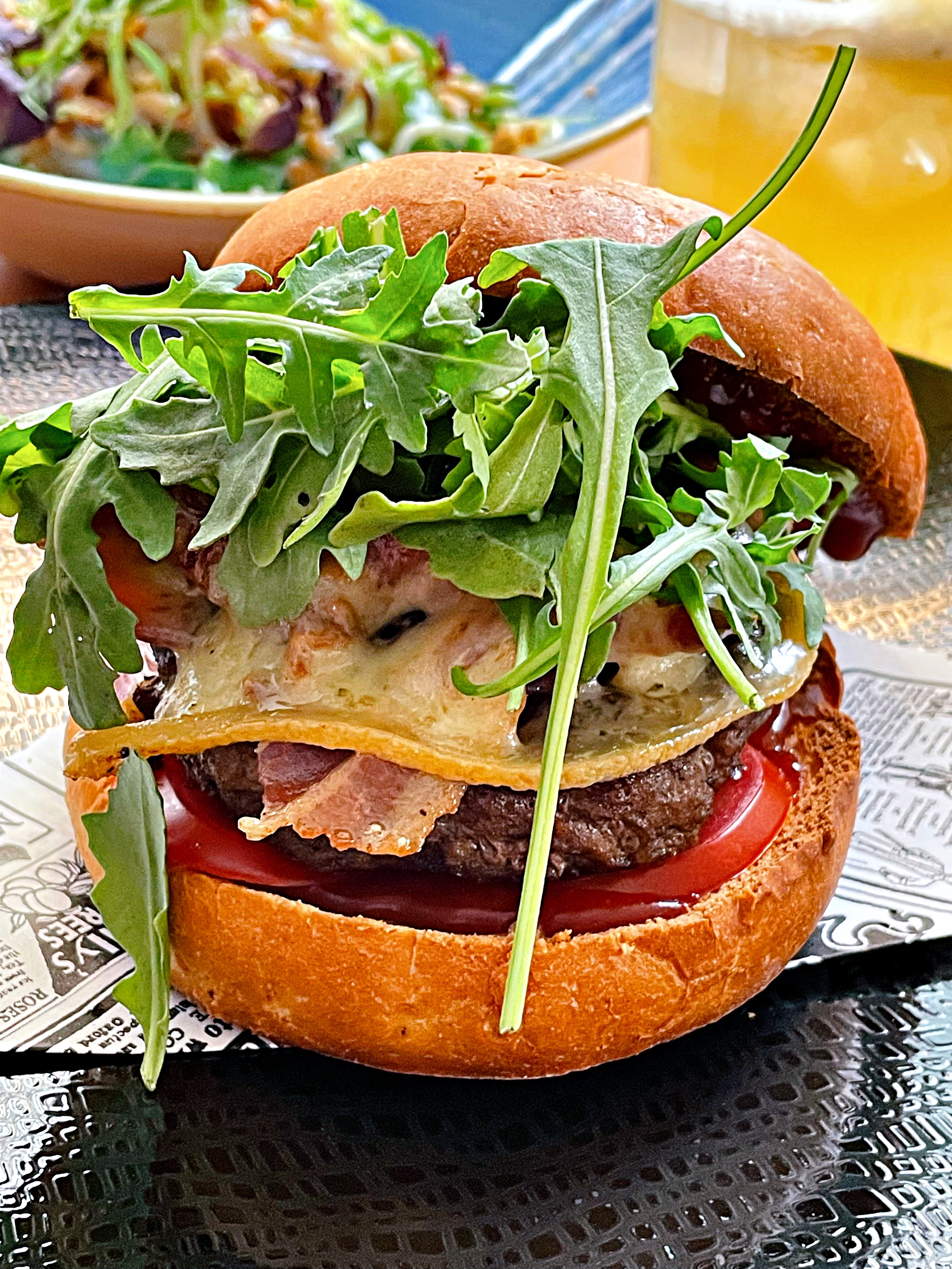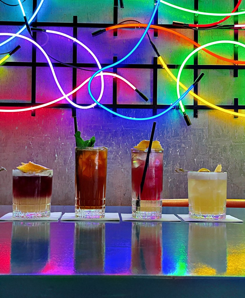 Wir haben uns direkt zwei Drinks von der Signature Cocktail Karte gegönnt, und zwar den “Tokyo Highball” mit japanischem Whisky, frischem Zitronensaft, Zuckersirup, Rotwein, Soda und Orangenzeste, “Geiler Keiler” mit Jägermeister, frischem Limettensaft, Thomas Henry Mystic Mango, Angostura und Minze und dann noch einen Pisco Sour und einen NY Sour. Die Speisekarte ist überschaubar, es findet sich allerdings für jeden etwas. Wir haben uns für den Bricks Burger mit Süßkartoffel Pommes, das Bricks Club Sandwich, den Caesar Salat mit gegrillter Hähnchenbrust, die Kokos Limetten Pasta (vegan) und Broscheks Fish’n’Chips entschieden, die wir besonders empfehlen können. Auch der Nachtisch durfte nicht fehlen und so haben wir uns den Cheesecake, Zupfkuchen und Pana Cotta bestellt. Dazu gab es noch die Bowle der Woche mit Fruchtsäften und den “Kornito” mit Korn Himbeer Infusion, Minze, frischem Limettensaft, Soda und Zucker.
