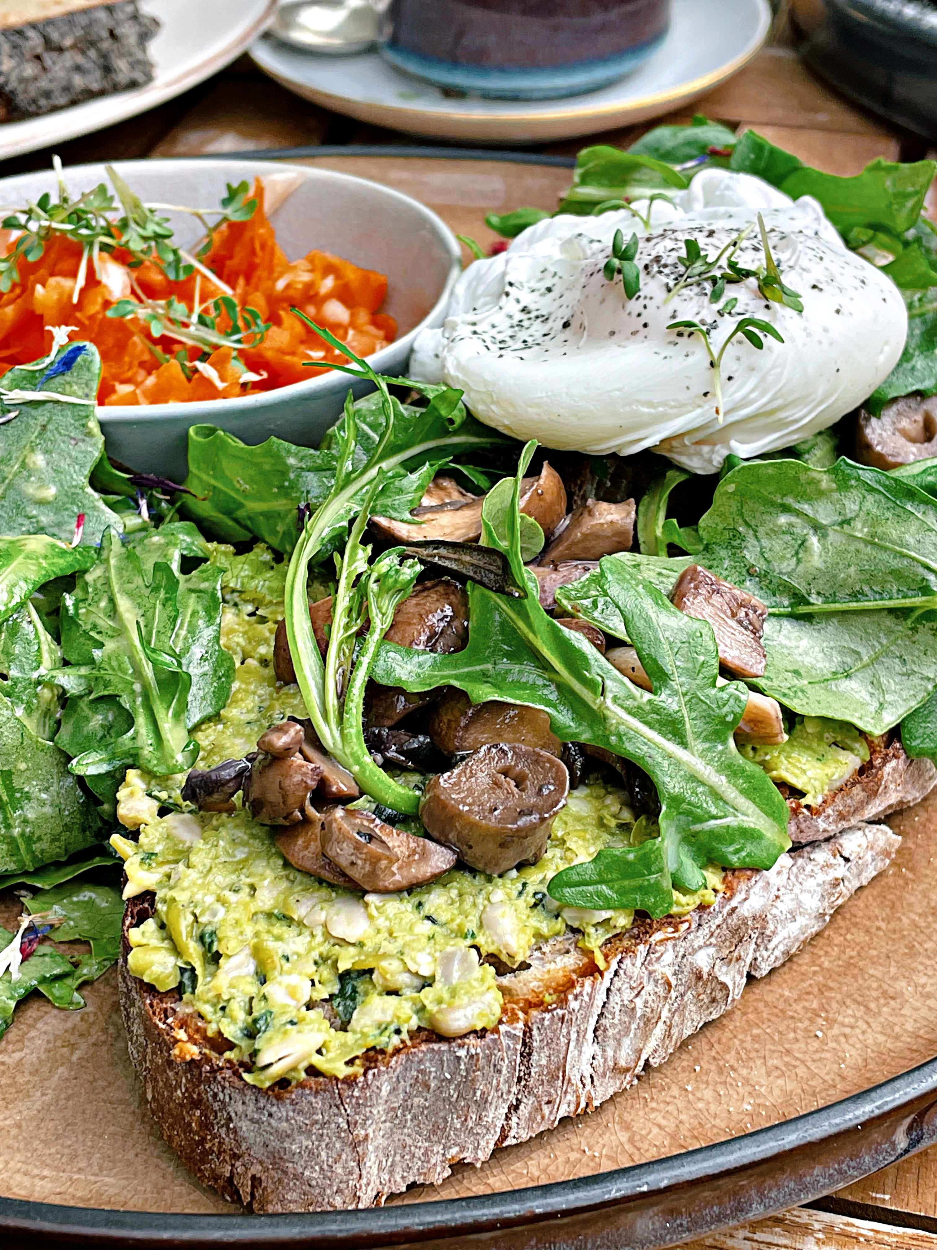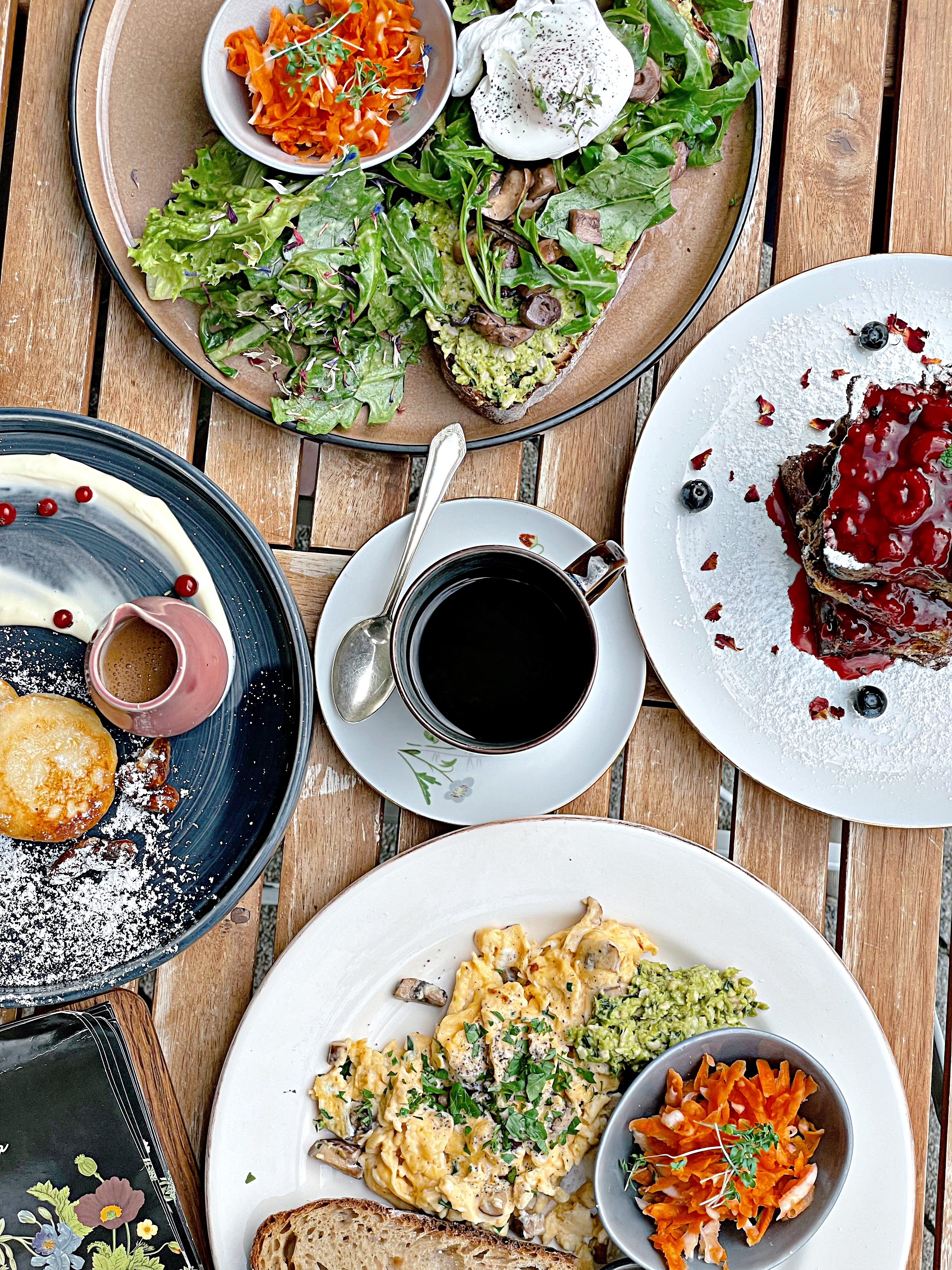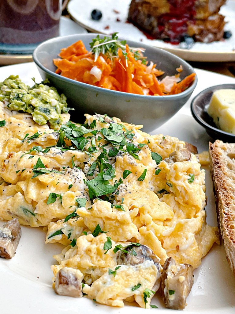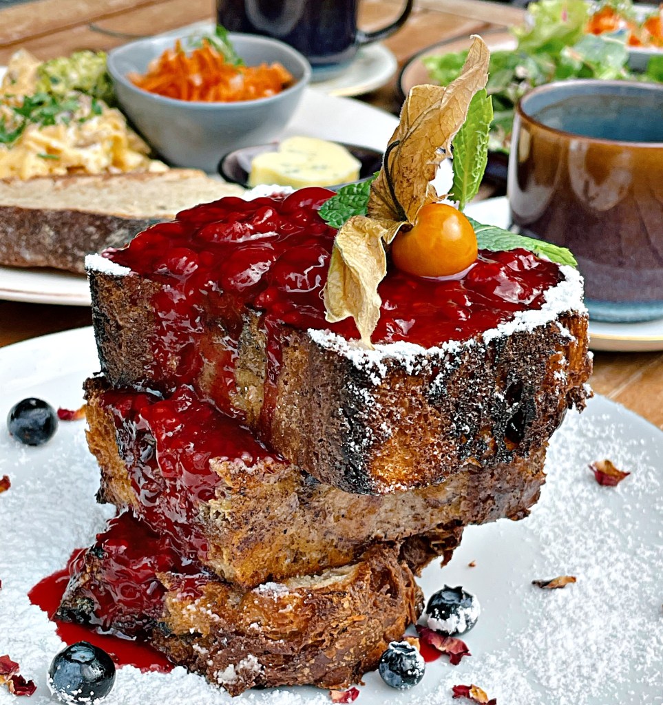 Wir haben uns “An Eggcellet Choice” mit gebratenen Pilzen, hausgemachtem Erbse- Basilikum-Pesto und Kräutern, eine Pilzstulle mit pochiertem Ei, Nussknacker Quarkies mit Karamellsoße und das Himbeer-French Toast mit Ahornsirup bestellt. Der Kuchen hat uns auch angelacht, also haben wir uns noch ein Stück Zitrone-Mohn und eine Zimtschnecke mitgenommen. Besonders empfehlen können wir das French Toast und den Zitronenkuchen, die Brote lohnen sich aber auf jeden Fall auch!