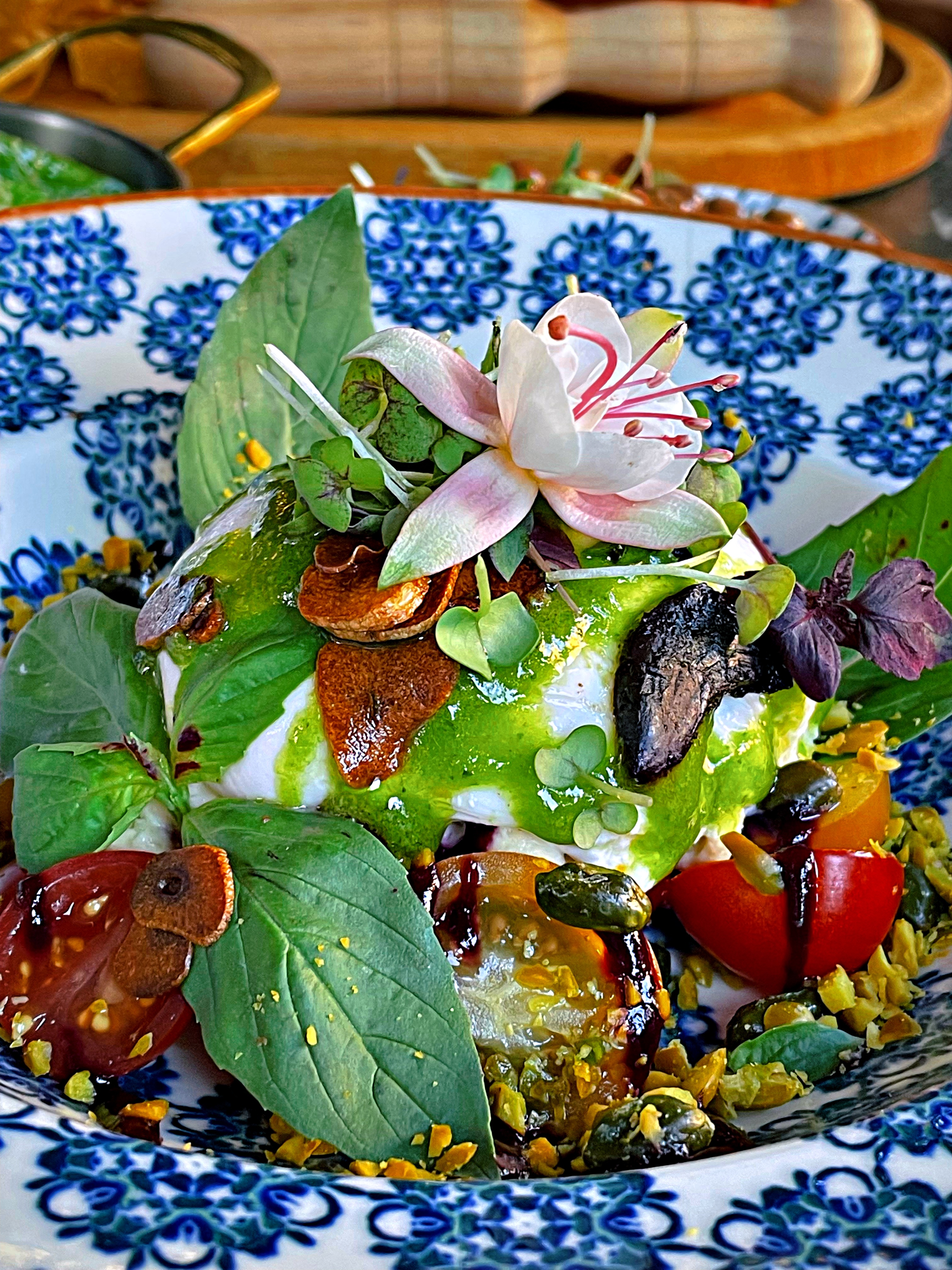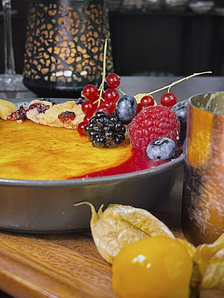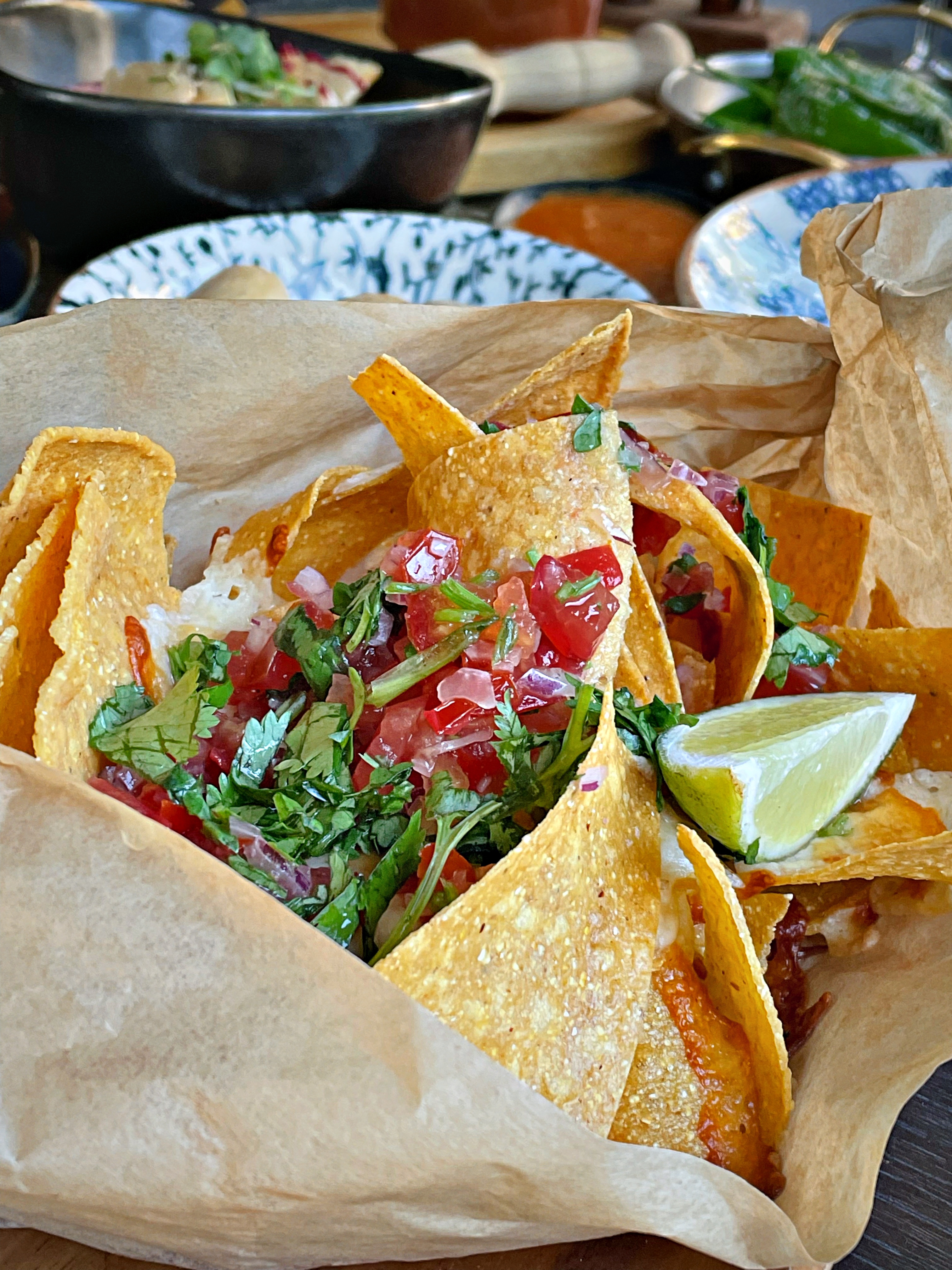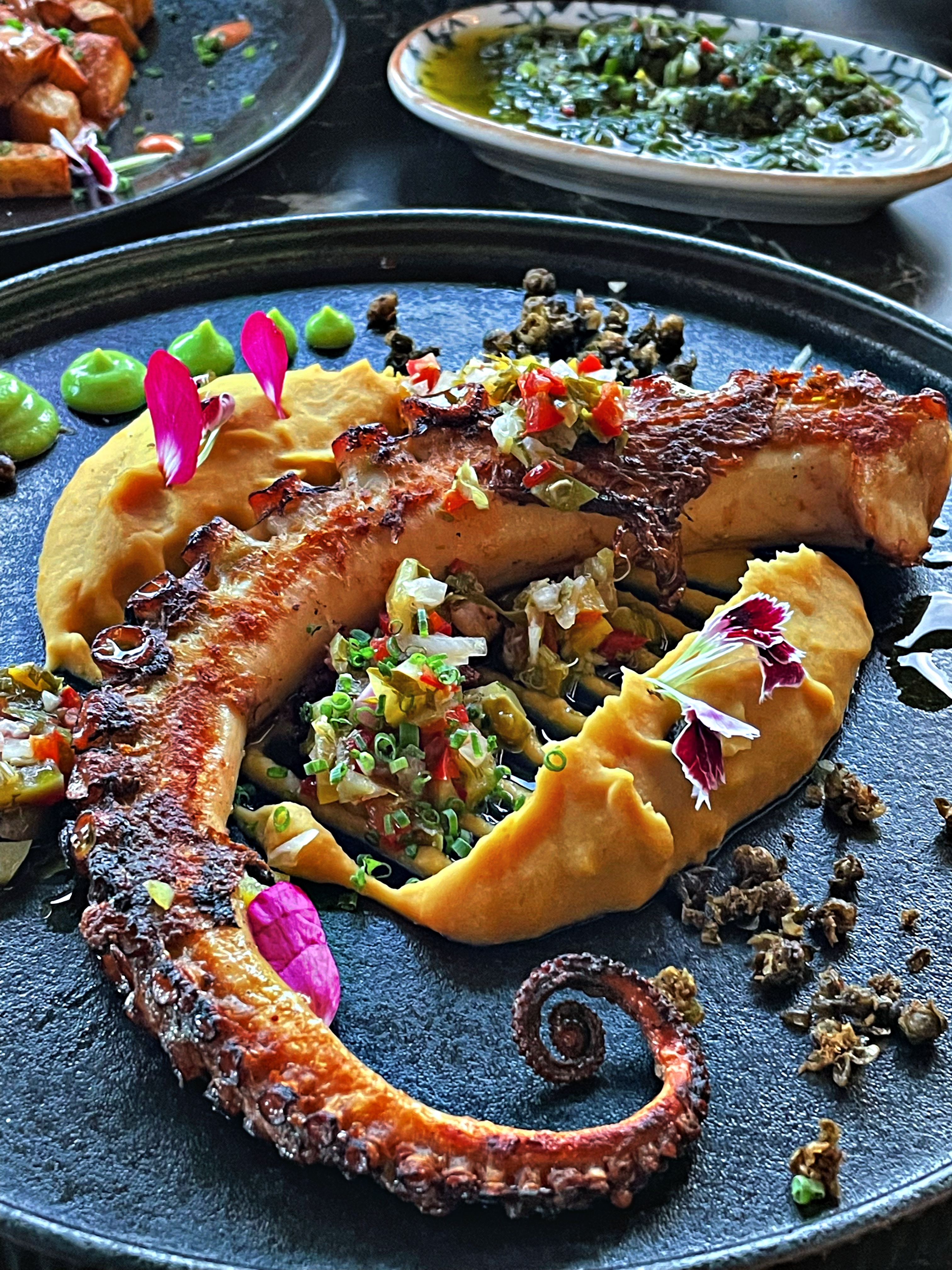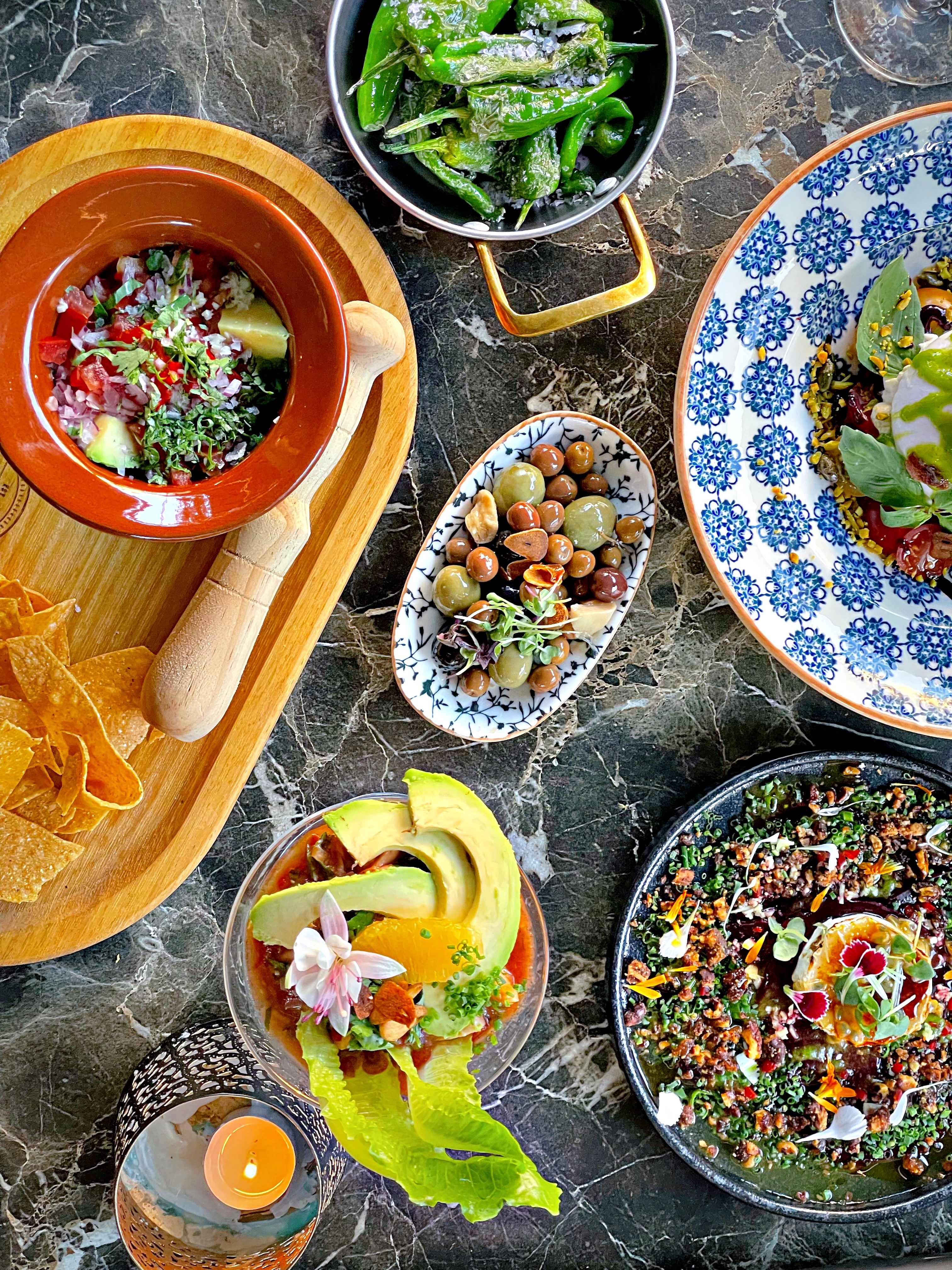Wir haben uns zu Beginn für einen Pisco Sour und Rose Spritz entschieden. Bei den Tapas hieß es wirklich Qual der Wahl also haben wir nicht lange überlegt und uns direkt die halbe Karte bestellt. Wir hatten die hausgemachte Guacamole mit Mörser zum Selbermachen, Sergio’s Nachos mit Käse überbacken mit Pico de Gallo (scharfe Sauce), den bunten Tomaten- Salat mit Burrata, Mascarpone-Pistazien-Creme, Basilikum, Ajo Negro und Cassisreduktion, Rote-Beete Carpaccio mit Ziegenkäse, Walnuss, Chili, Ingwer, Maracuja und Kräuteröl, Patatas Bravas (gebackene Kartoffeln mit Salsa), Pimientos de Padrón (gebackene Bratpaprika mit Meersalz), Chipirones (frittierte Babytintenfische), den gegrillten Oktopus mit gelbe Linsen-Püree und Gemüse, die Scampi aus der heißen Pfanne mit viel Knoblauch, die Lammschulter, geschmort in Pappillote mit Kartoffeln und Rote Beete, Dátiles con Jamón Serrano (Datteln im Speckmantel) und die Chorizo a la Parrilla (gegrillte Chorizo auf Kartoffelpüree). Dazu gab es noch die Cavas Brut Trocken (ein leichter Schaumwein für laue Sommernächte) und das Rosat halbtrocken bis lieblich mit Aromen von dunklem Steinobst wie Kirsche und Pflaume. Natürlich konnten wir auch nicht nein zum Dessert sagen, also kam auch noch eine Dessertvariation mit einem Mandelküchlein, Mango Coulis, Luicella’s Vanilleeis, Crema Catalana und einem Schokokuchen a la Sergio. Zum Dessert gab es dann noch einen sehr leckeren Sangria mit Noten von Orange, Brombeere, Himbeere und Erdbeere.