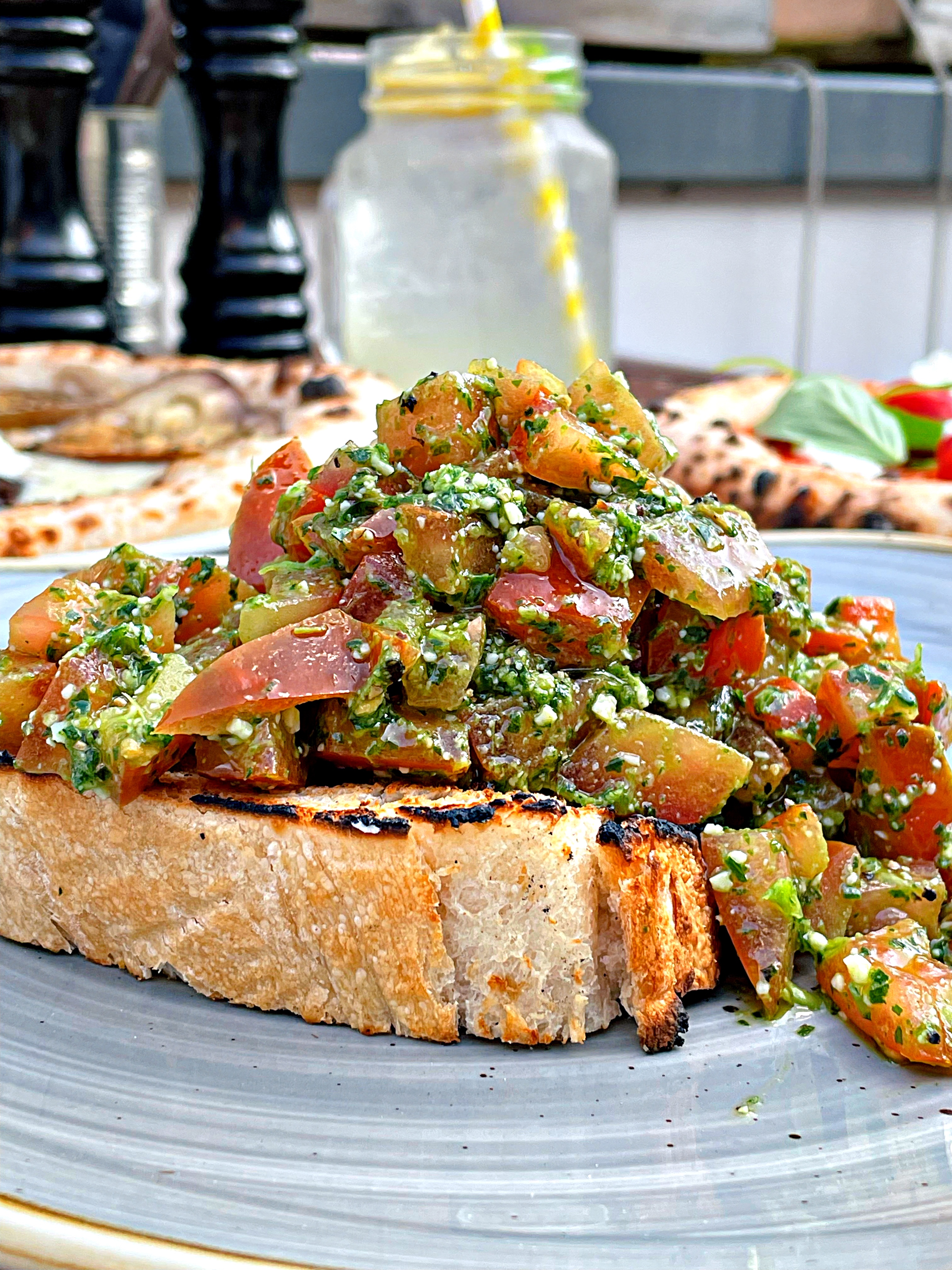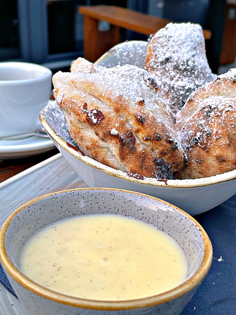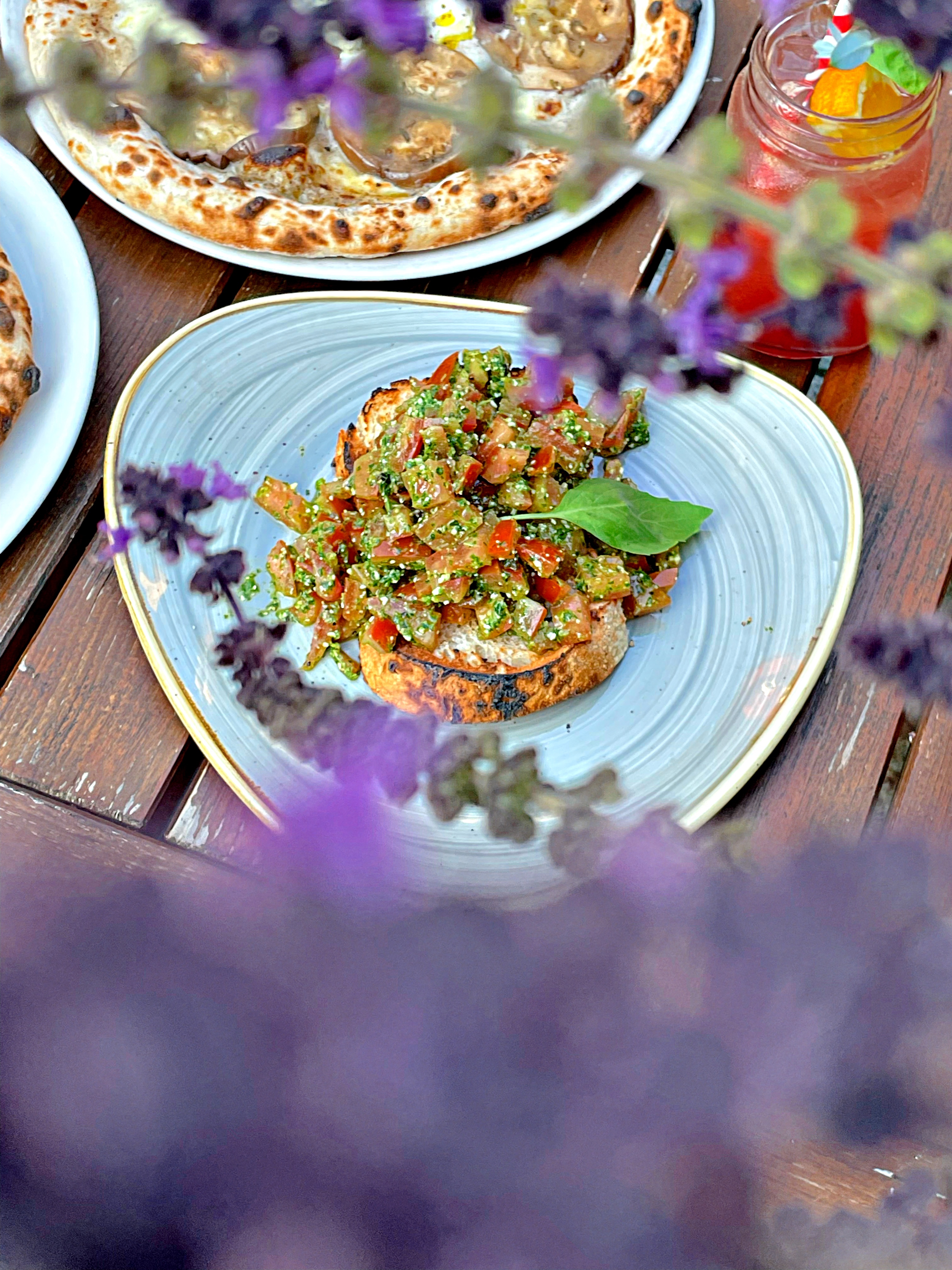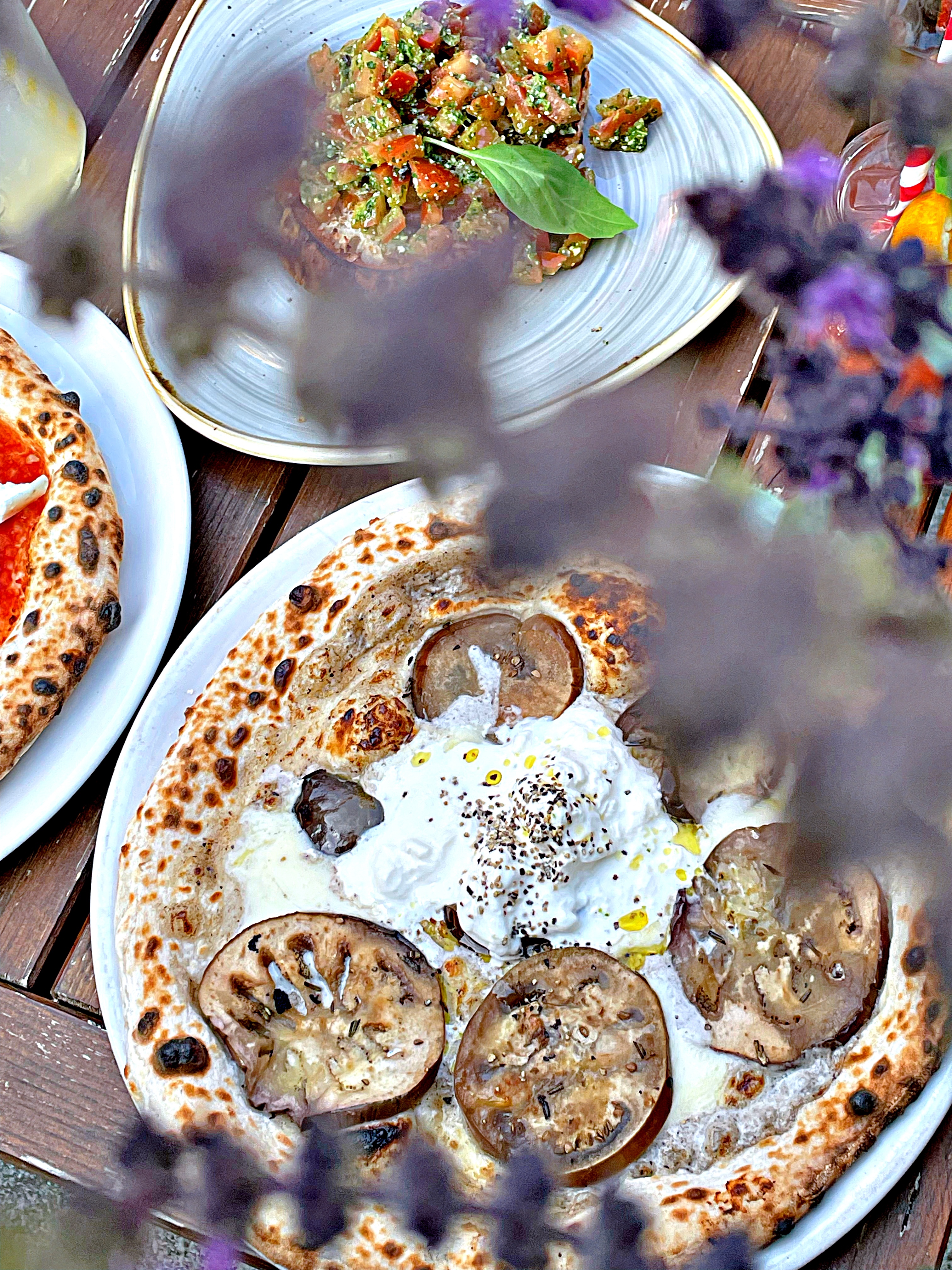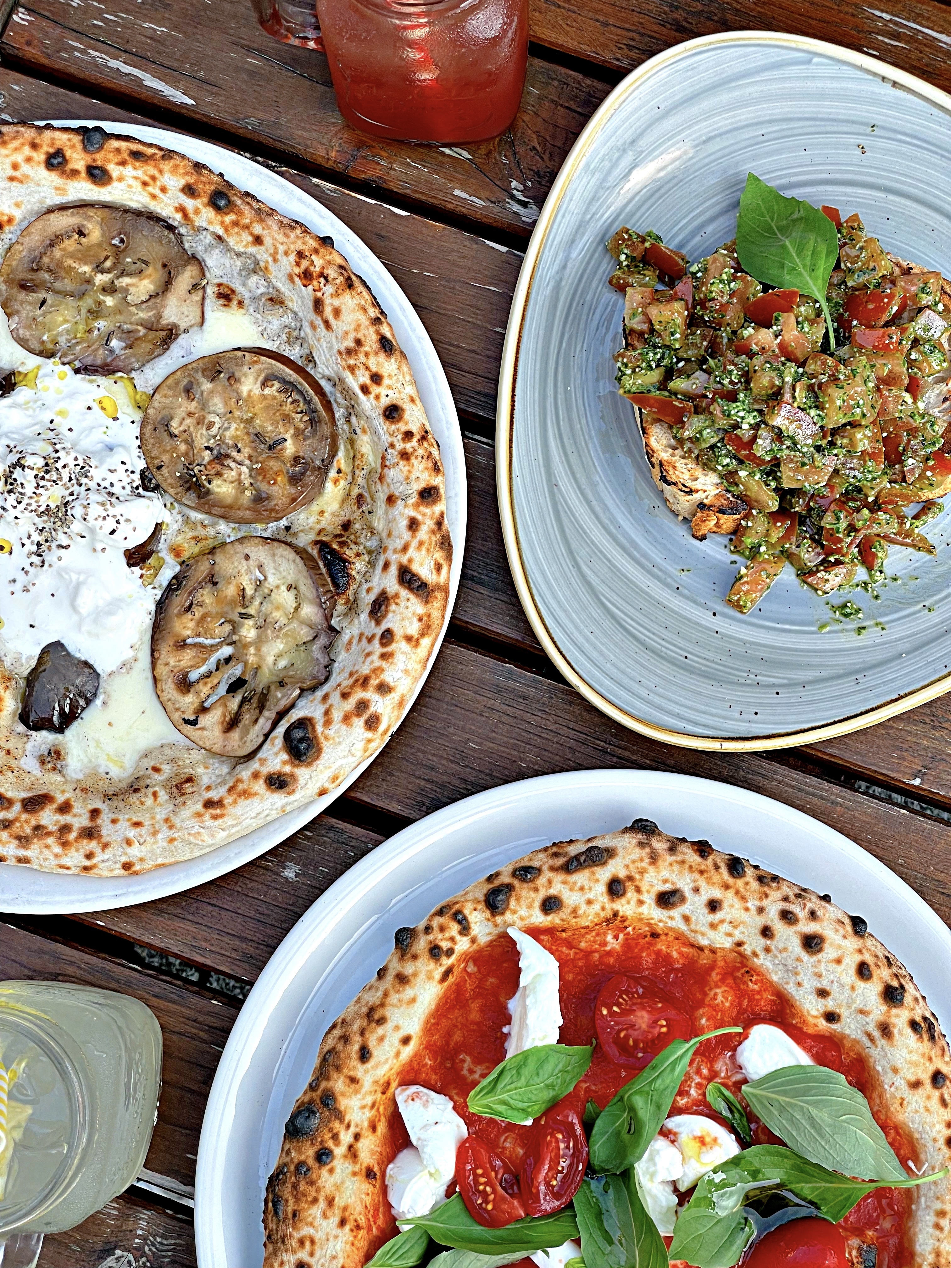 Die hausgemachten Limonaden am Nachbartisch haben uns so angesprochen, dass wir sie uns direkt bestellen mussten. Wir haben gleich beide Sorten (Zitrone und Maracuja-Blutorange) bestellt. Vorab gab es ein sehr gut gewürztes Bruschetta und dann haben wir uns nach langem hin und her Überlegen für die „Trüffel“ Pizza mit Trüffelcreme, Fior di latte, Aubergine und Burrata und die „Bufalina“ Pizza mit San Marzano Tomaten, Cherry-Tomaten, Büffelmozzarella (nach dem Backen), Basilikum und Olivenöl entschieden. Natürlich konnten wir gar nicht anders als auch noch das „Ein Traum“ Dessert zu bestellen. Dieses besteht aus Ravioli aus Pizzateig, gefüllt mit Schokolade und einer wahnsinnig leckeren Vanillesoße zum Tunken. Dazu können wir wirklich nur sagen: Ein Traum! Unbedingt probieren!