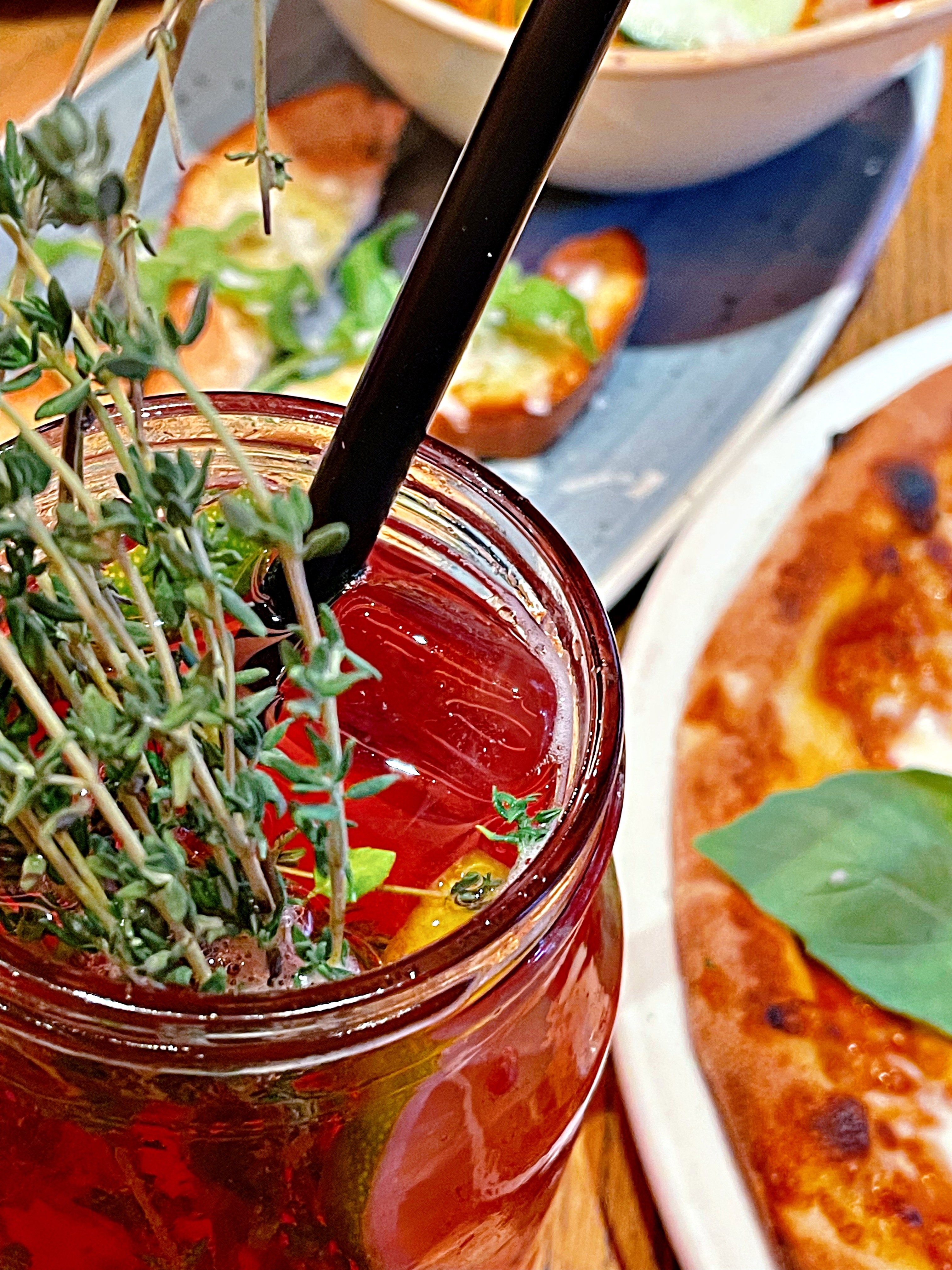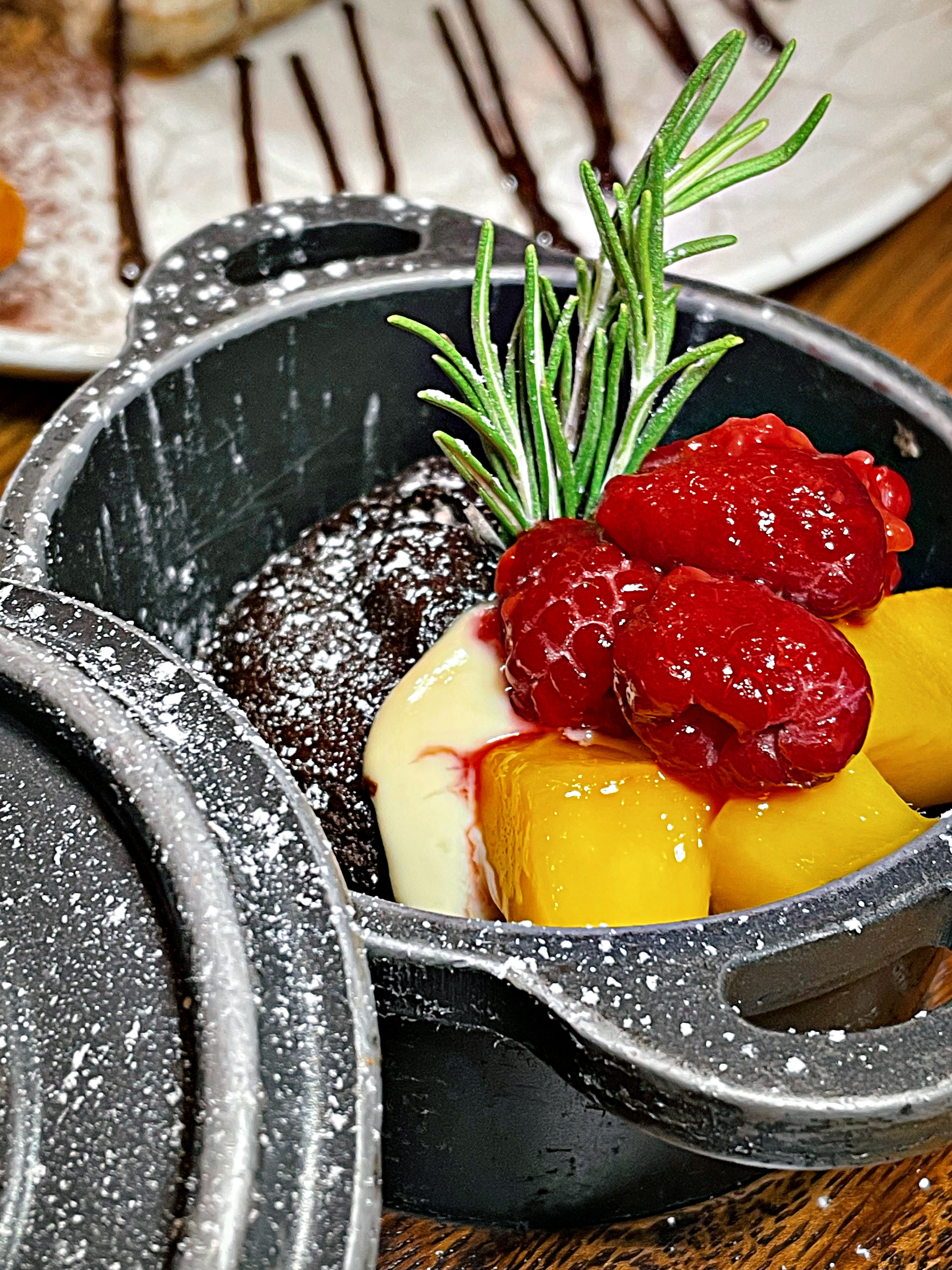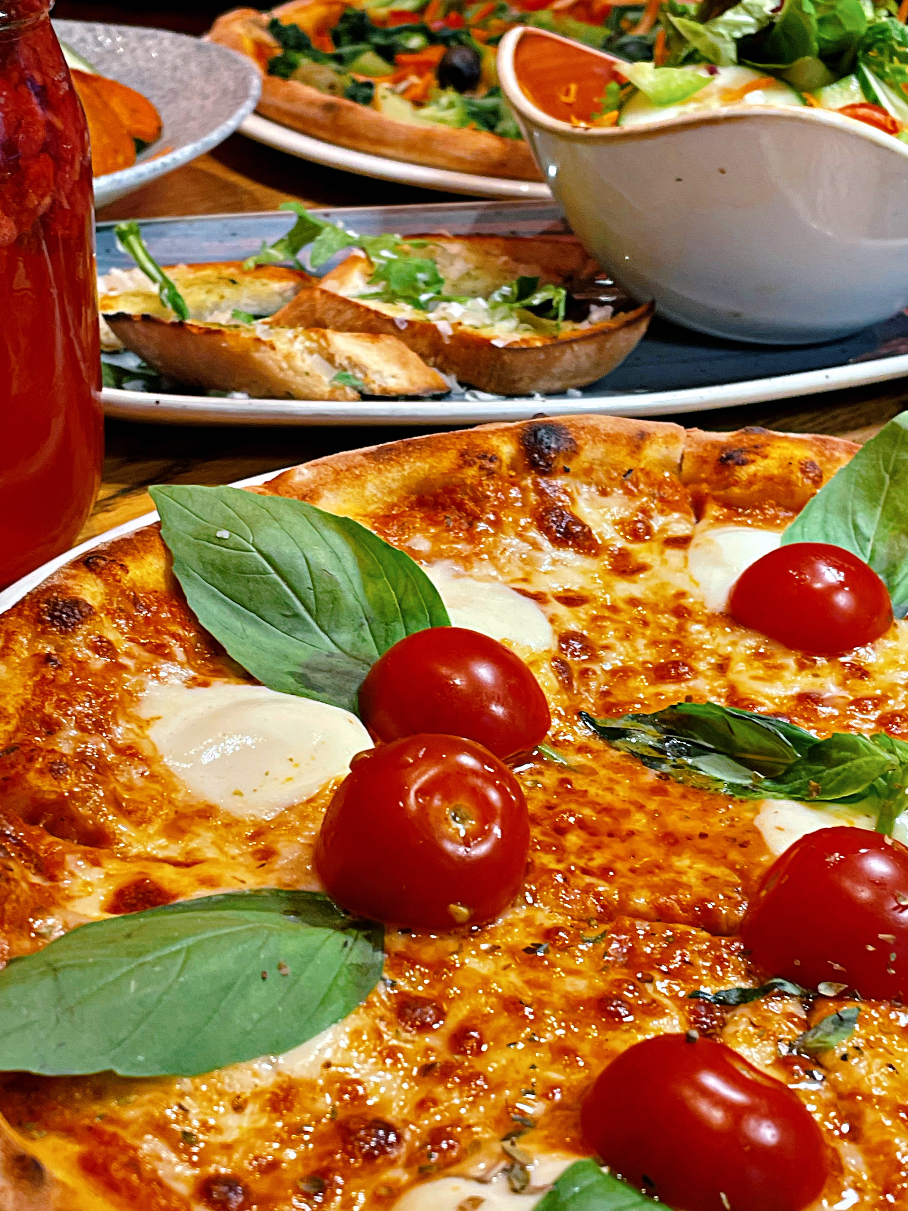 Wir haben uns für die hausgemachte Himbeere-Thymian und Ananas-Limetten Limonade entschieden. Vorab gab es die „Antipasti di Verdura“, einen vegetarischen Antipasti Teller mit reichlich Auswahl. Für die Frische haben wir uns noch einen Fitness Salat bestellt, welcher aus Gurken, Cherrytomaten, roten Zwiebeln, gedünstetem Saison-Gemüse mit italienischen Käutern und einer Salatvariation der Saison besteht. Dann ging es weiter mit einer Pizza Mozzarella und Pizza Vegetarisch, welche sie uns sogar vegan zubereiten konnten. Uns wurden die gegrillten Black Tiger Gamberetto empfohlen, also haben wir uns diese auch noch bestellt und sechs Black Tiger Garnelen in einer gusseisernen Pfanne mit Knoblauchbrot und Salat bekommen. Zu guter Letzt mussten wir natürlich auch noch ein Dessert bestellen und weil wir uns bei der ganzen Auswahl an Köstlichkeiten kaum entscheiden konnten, haben wir uns direkt mehrere bestellt. Wir haben das hausgemachte Tiramisù, bestehend aus Schoko-Crumble, Karamell-Didess, Bitter Kakao, Sambuca und Amaretto, das ebenfalls hausgemachte Pana Cotta im Glas mit Erdbeersauce und das warme Schoko-Soufflé mit flüssigem Schokokern, einer Kugel Créme Vanille und Sahne bestellt. Besonders empfehlen können wir die Black Tiger Garnelen und das Schoko-Soufflé, das zudem auch wunderschön aussieht.