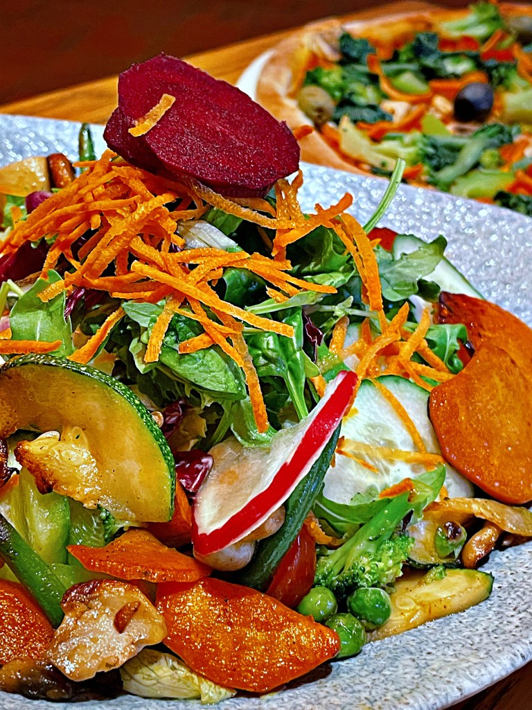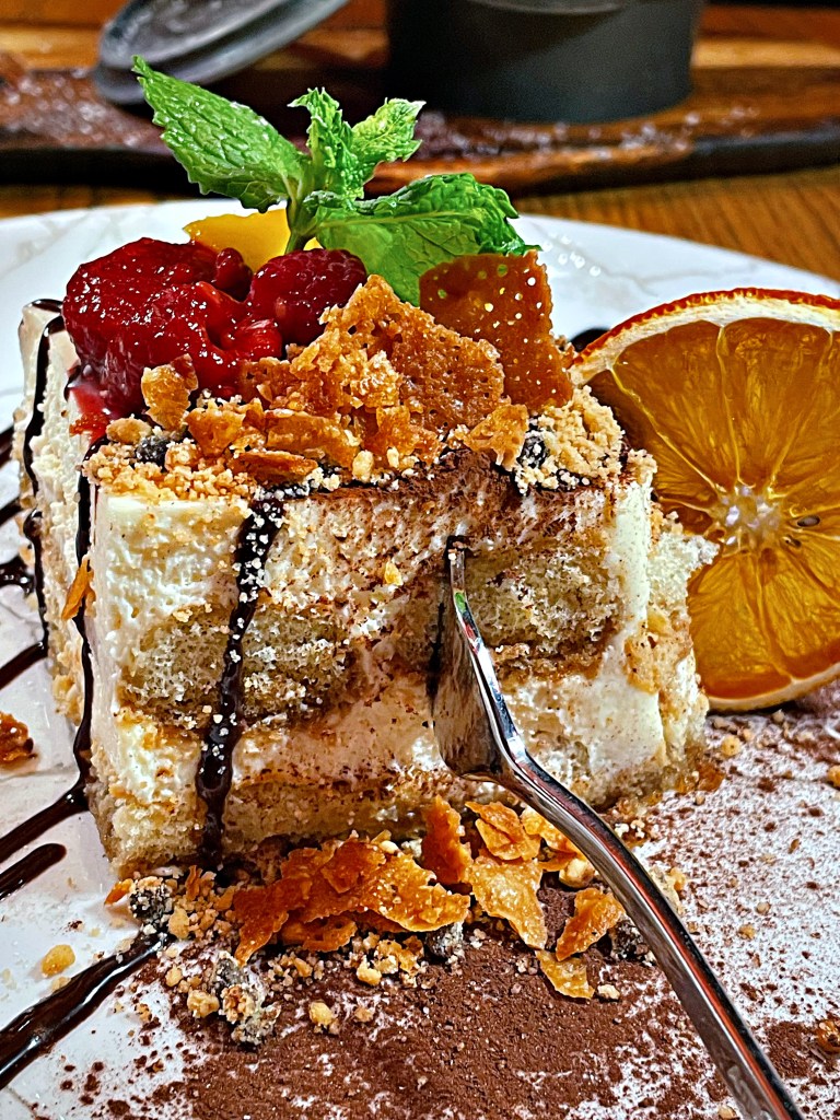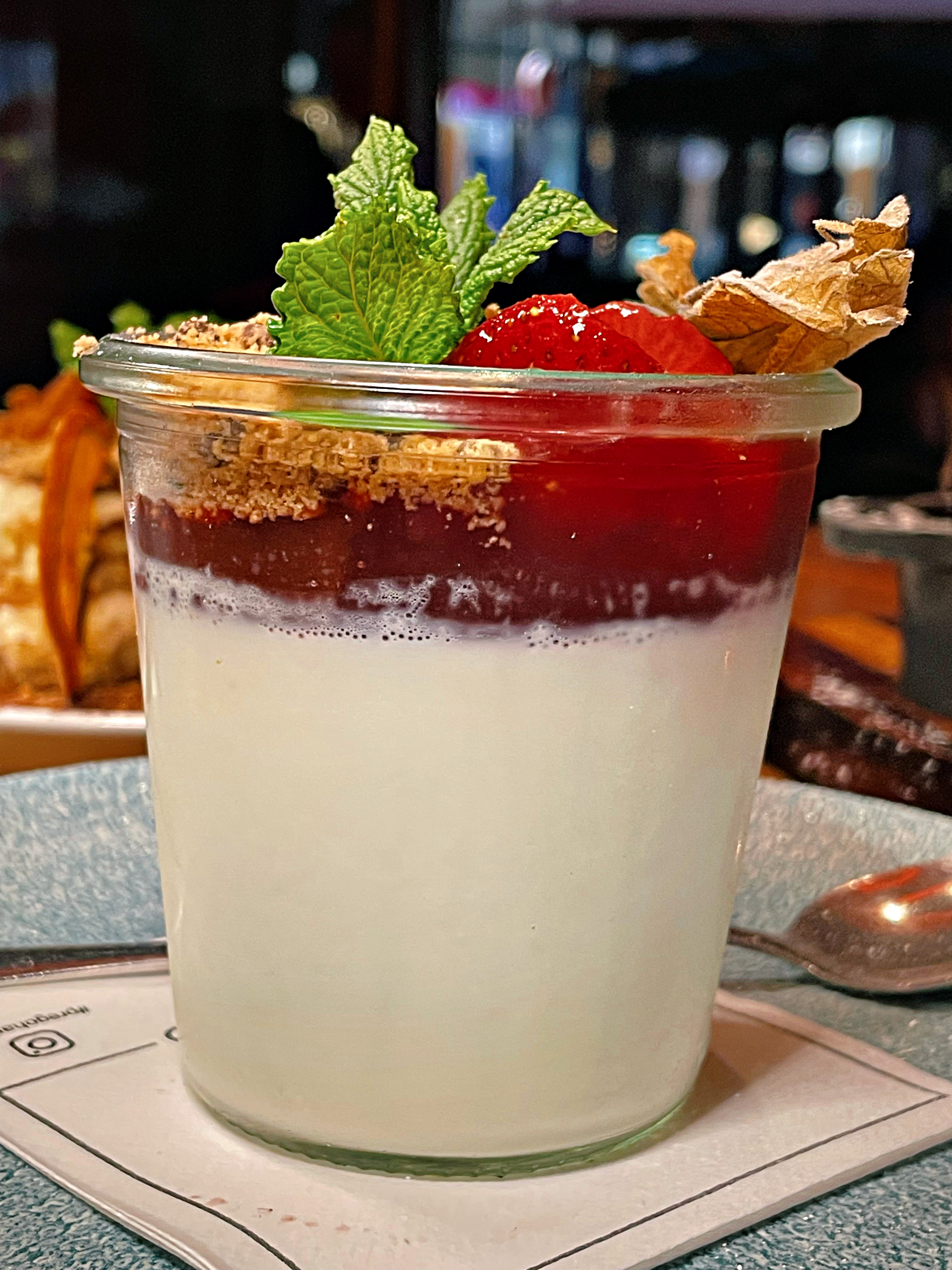 Wir haben uns für die hausgemachte Himbeere-Thymian und Ananas-Limetten Limonade entschieden. Vorab gab es die „Antipasti di Verdura“, einen vegetarischen Antipasti Teller mit reichlich Auswahl. Für die Frische haben wir uns noch einen Fitness Salat bestellt, welcher aus Gurken, Cherrytomaten, roten Zwiebeln, gedünstetem Saison-Gemüse mit italienischen Käutern und einer Salatvariation der Saison besteht. Dann ging es weiter mit einer Pizza Mozzarella und Pizza Vegetarisch, welche sie uns sogar vegan zubereiten konnten. Uns wurden die gegrillten Black Tiger Gamberetto empfohlen, also haben wir uns diese auch noch bestellt und sechs Black Tiger Garnelen in einer gusseisernen Pfanne mit Knoblauchbrot und Salat bekommen. Zu guter Letzt mussten wir natürlich auch noch ein Dessert bestellen und weil wir uns bei der ganzen Auswahl an Köstlichkeiten kaum entscheiden konnten, haben wir uns direkt mehrere bestellt. Wir haben das hausgemachte Tiramisù, bestehend aus Schoko-Crumble, Karamell-Didess, Bitter Kakao, Sambuca und Amaretto, das ebenfalls hausgemachte Pana Cotta im Glas mit Erdbeersauce und das warme Schoko-Soufflé mit flüssigem Schokokern, einer Kugel Créme Vanille und Sahne bestellt. Besonders empfehlen können wir die Black Tiger Garnelen und das Schoko-Soufflé, das zudem auch wunderschön aussieht.