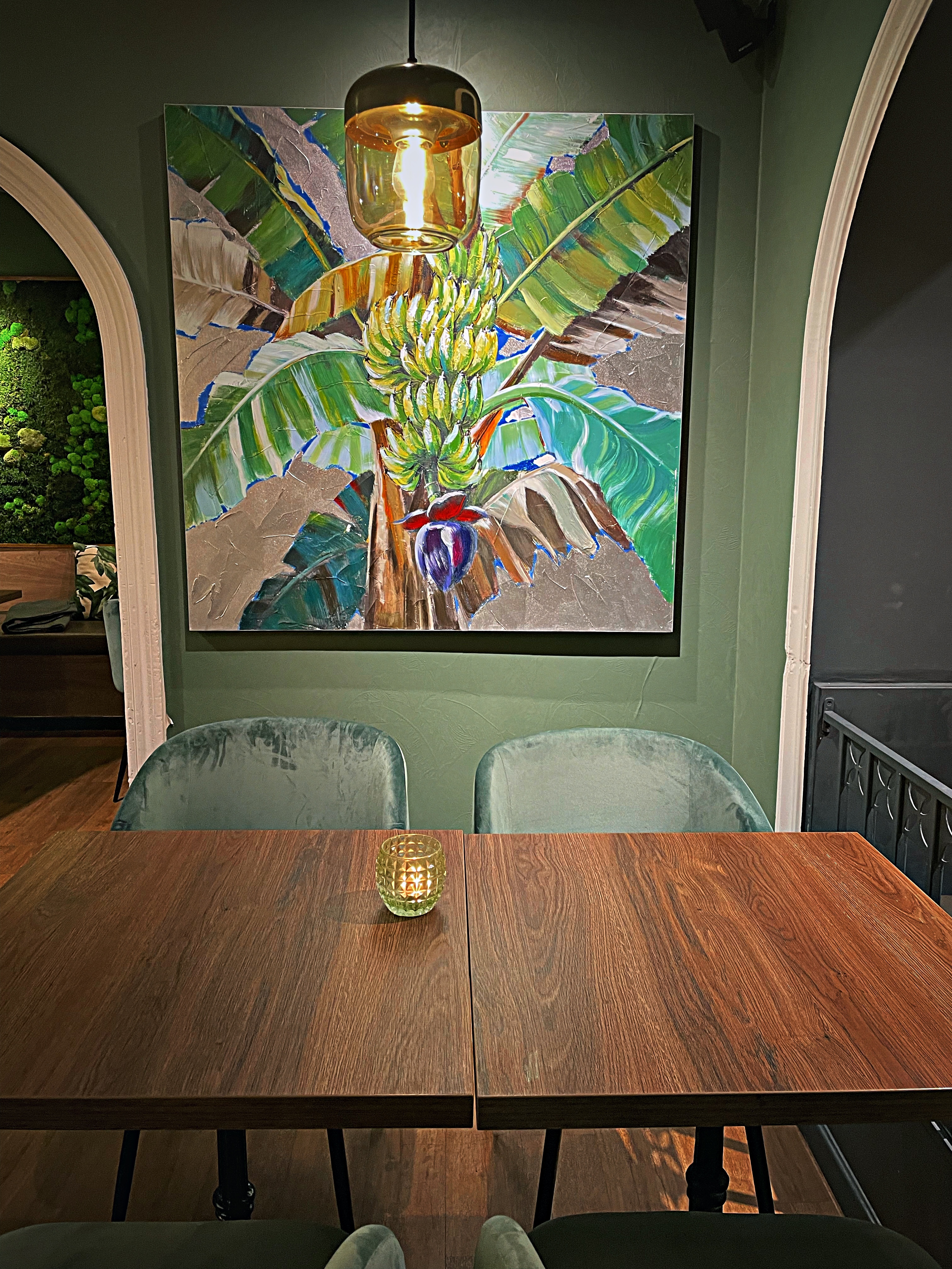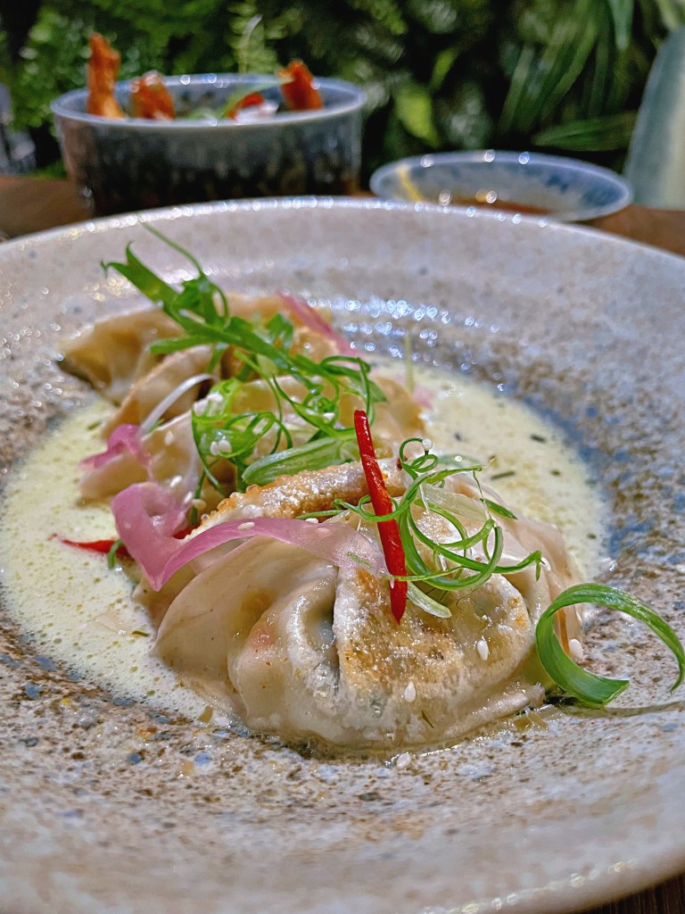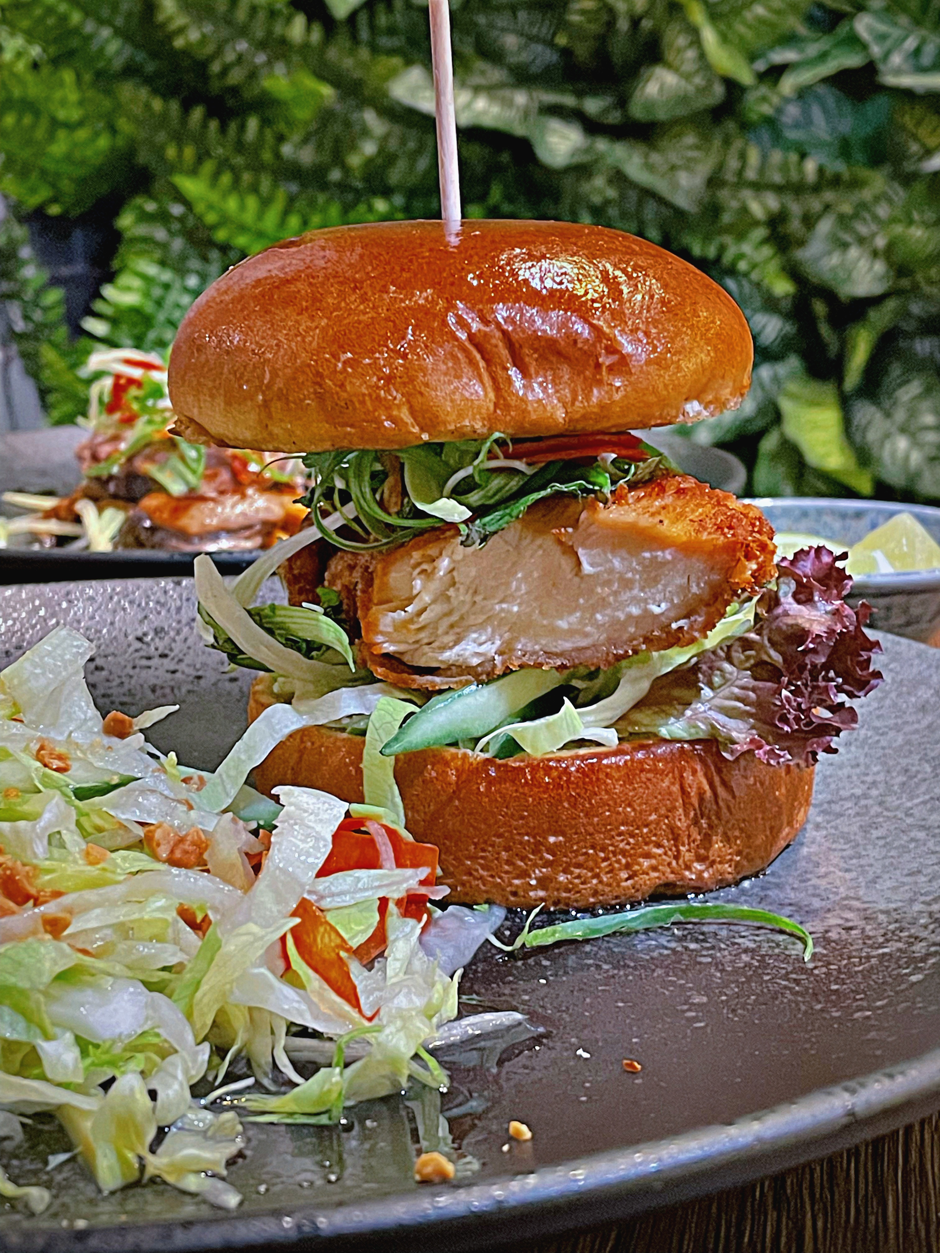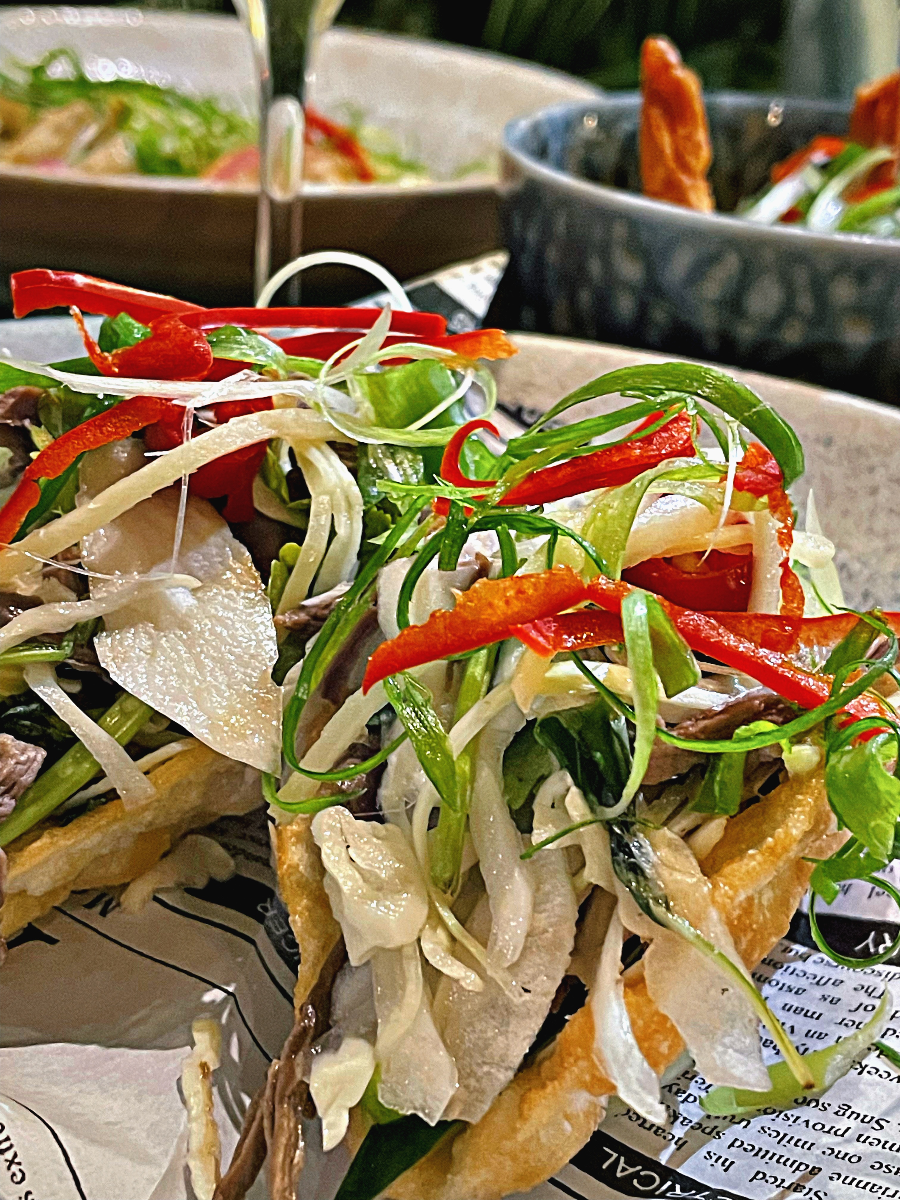 Wir haben uns einen “Cái Râng Style” mit Granatapfel, Maracuja, Curaçao und Wodka und einen “Pornstar Martini” mit Wodka, frischer Maracuja, Limettensaft und Prosecco bestellt und uns dann die “grünen Garnelen”, Hummerkrabben mit knusprigen Reisflocken, “Vegan Gyoza”, Kohlsalat, Frühlingslauch, Koriander und eingelegte Chilis und den “Taco Moo”, knuspriger Dumplingteig, Rindfleisch, Erdnuss, Kohlsalat, Koriander, asiatische Kräuter und Rau Râm Zwiebeln, empfehlen lassen. Als Hauptgang gab es die “Duck Till Dawn”, Barbarie Entenbrust, gebratene gemischte Pilze, Teriyaki Sauce, Frühlingslauch, Ingwersfreifen, Spinat und Duftreis und den “Bangkok Burger“ mit Brioche Bun, Koriander, Minze, gegrilltem Hähnchenbrustfilet, Erdnuss und Mangosalat. Dazu haben wir uns auch noch den „Blue Passion Ice Tea“ mit Grüntee, Maracuja, Blue Curaçao und Calamondin und den „Lytchee Rose Tea“ mit Litschi, Rosenblüten und Zitronen bestellt. Am Ende gab es noch ein Dessert, „Banane|Eis“, gebackene Banane im Teigmantel, Vanilleeis, Honig, Erdnuss und Sesam und „Arancini“, schwarzer Klebreis, Kokos, Arancini, Mangokompott, Joghurtsorbet und Himbeersauce. Wirklich empfehlen können wir die Cocktails, die Gyoza und die Ente.