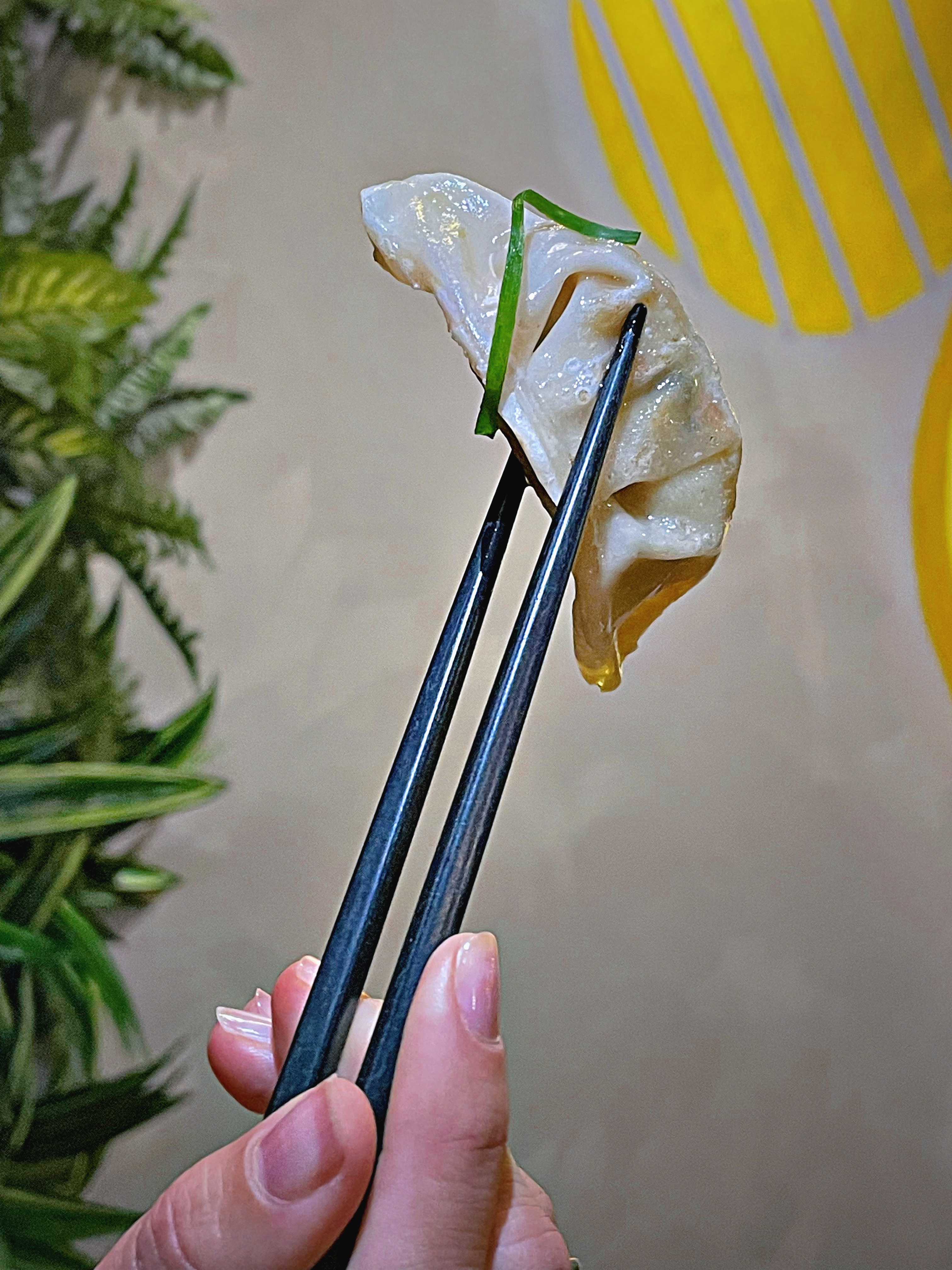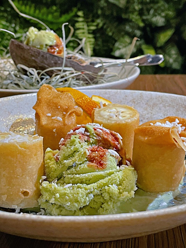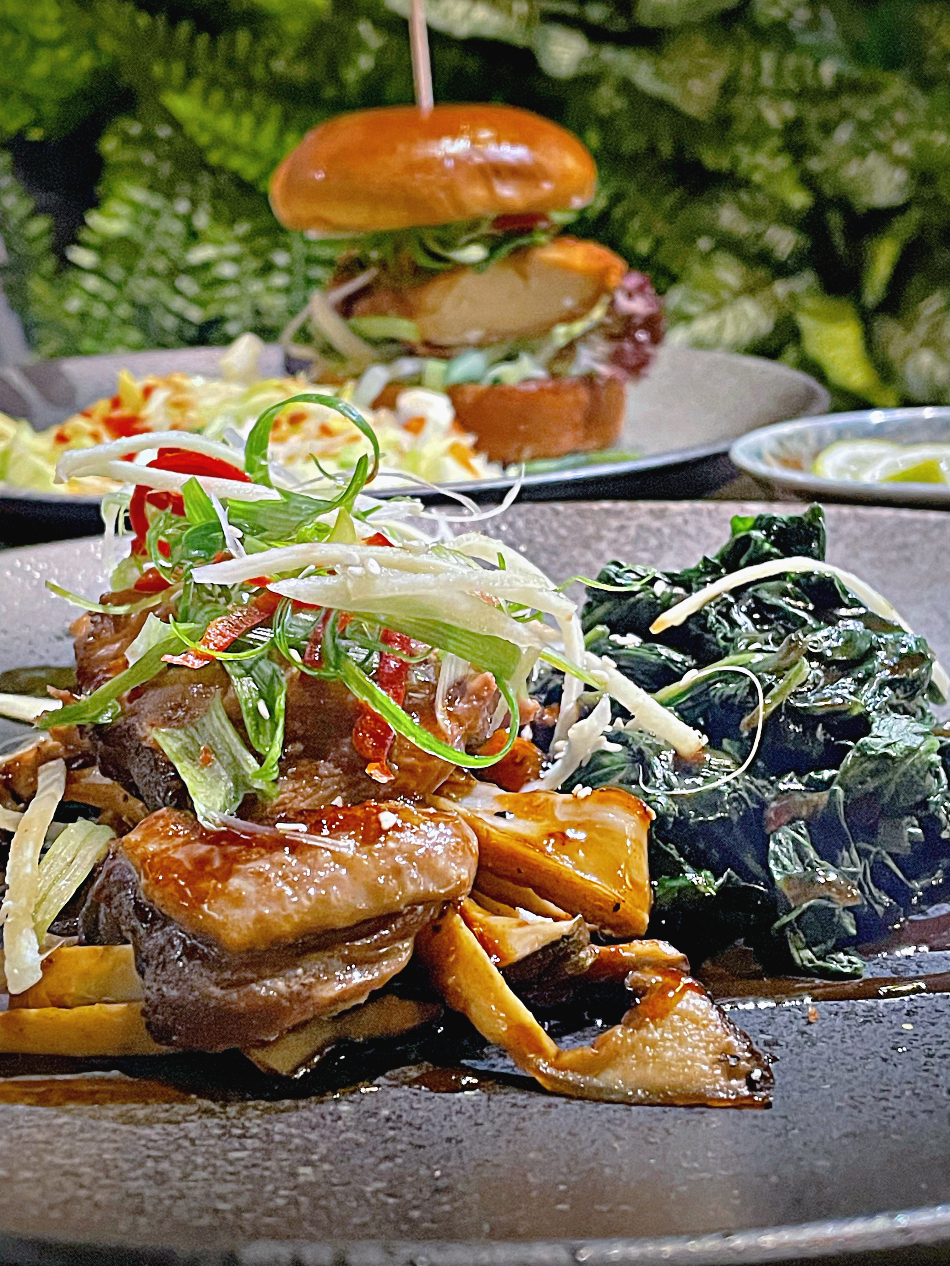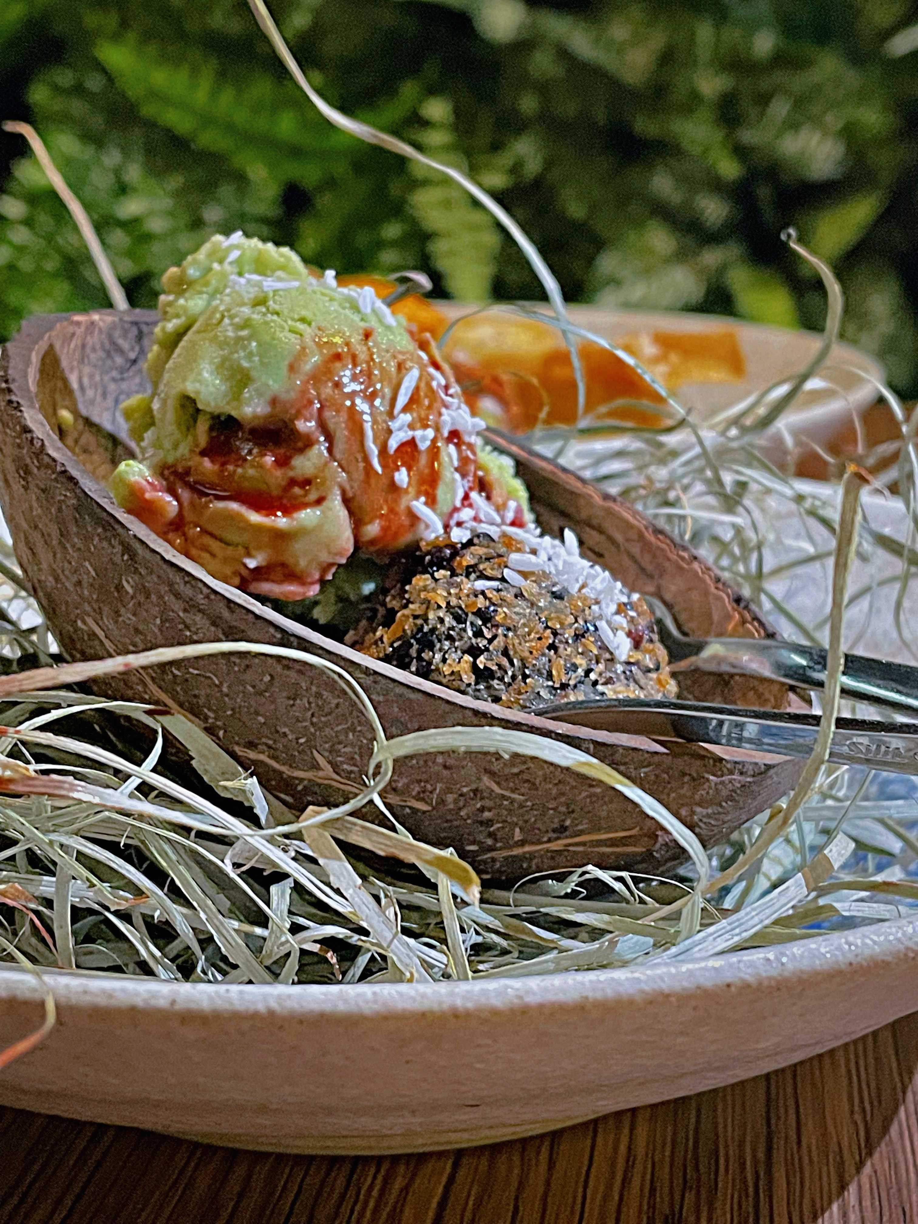 Wir haben uns einen “Cái Râng Style” mit Granatapfel, Maracuja, Curaçao und Wodka und einen “Pornstar Martini” mit Wodka, frischer Maracuja, Limettensaft und Prosecco bestellt und uns dann die “grünen Garnelen”, Hummerkrabben mit knusprigen Reisflocken, “Vegan Gyoza”, Kohlsalat, Frühlingslauch, Koriander und eingelegte Chilis und den “Taco Moo”, knuspriger Dumplingteig, Rindfleisch, Erdnuss, Kohlsalat, Koriander, asiatische Kräuter und Rau Râm Zwiebeln, empfehlen lassen. Als Hauptgang gab es die “Duck Till Dawn”, Barbarie Entenbrust, gebratene gemischte Pilze, Teriyaki Sauce, Frühlingslauch, Ingwersfreifen, Spinat und Duftreis und den “Bangkok Burger“ mit Brioche Bun, Koriander, Minze, gegrilltem Hähnchenbrustfilet, Erdnuss und Mangosalat. Dazu haben wir uns auch noch den „Blue Passion Ice Tea“ mit Grüntee, Maracuja, Blue Curaçao und Calamondin und den „Lytchee Rose Tea“ mit Litschi, Rosenblüten und Zitronen bestellt. Am Ende gab es noch ein Dessert, „Banane|Eis“, gebackene Banane im Teigmantel, Vanilleeis, Honig, Erdnuss und Sesam und „Arancini“, schwarzer Klebreis, Kokos, Arancini, Mangokompott, Joghurtsorbet und Himbeersauce. Wirklich empfehlen können wir die Cocktails, die Gyoza und die Ente.
