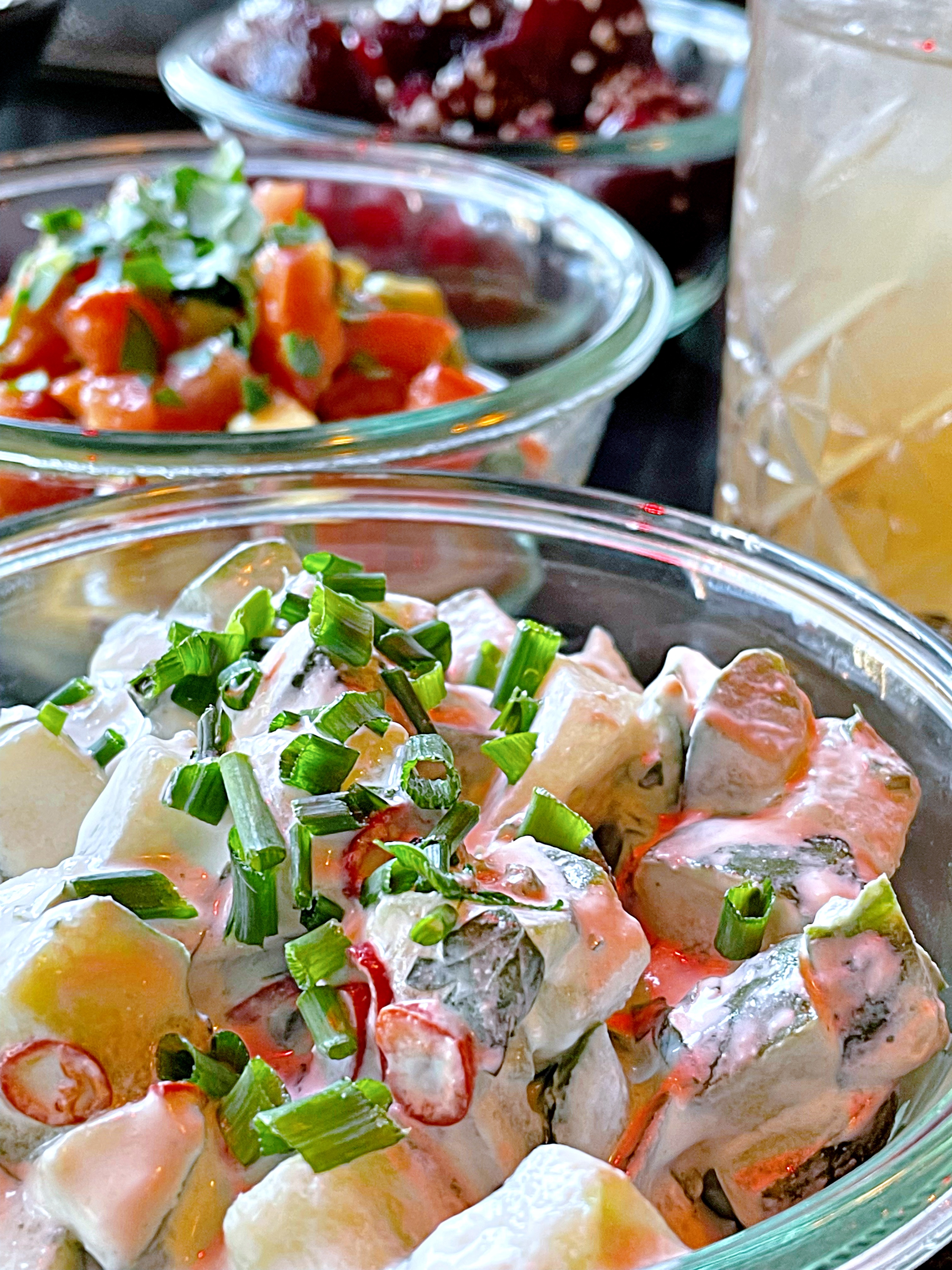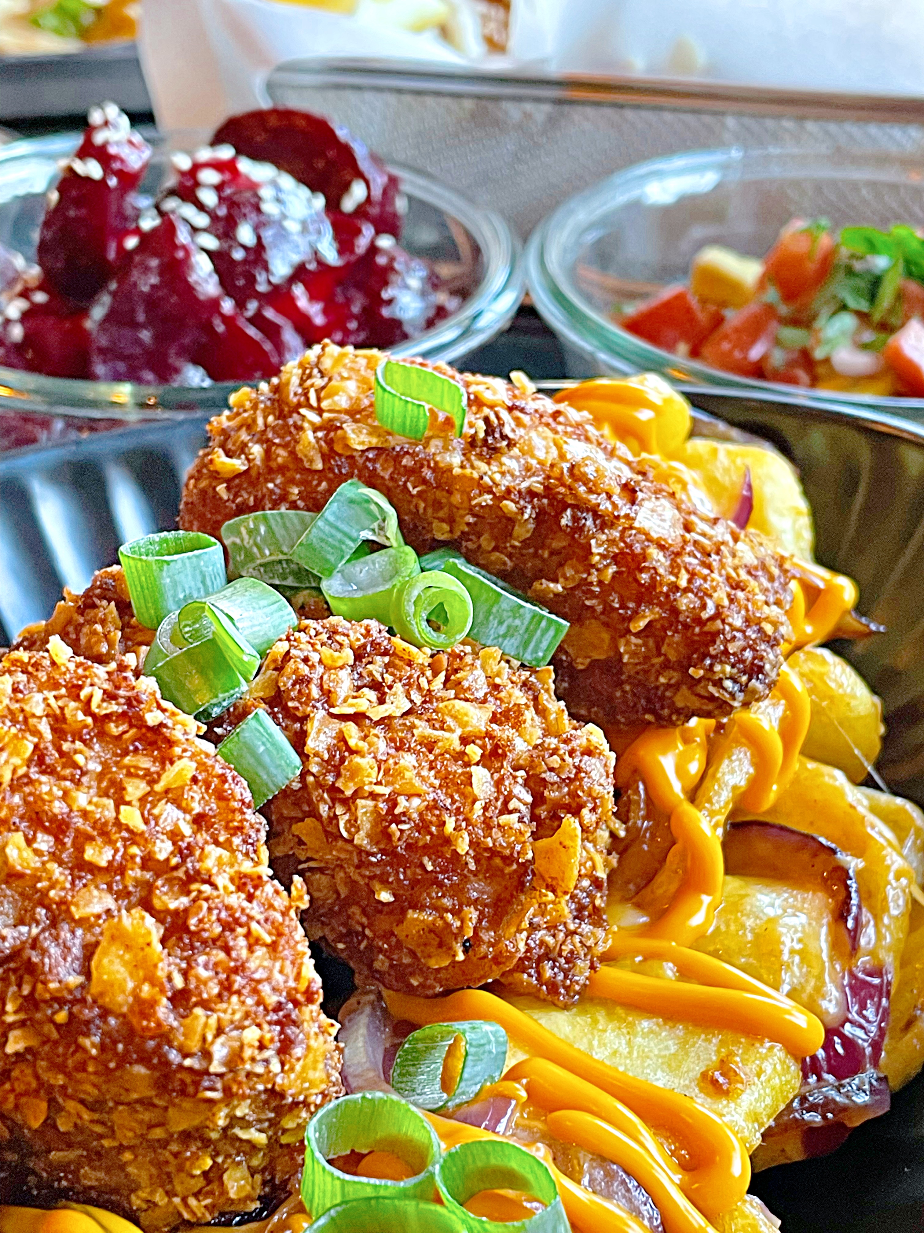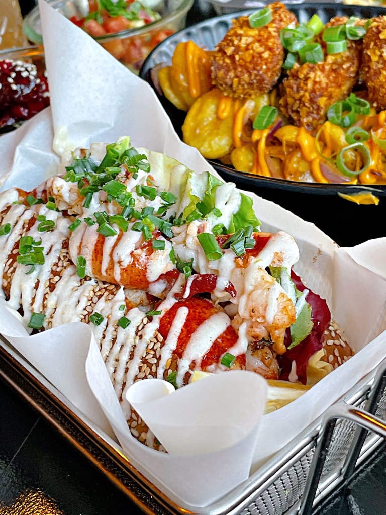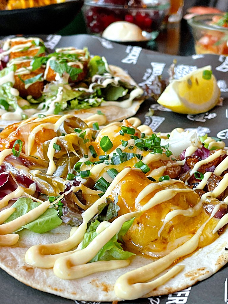 Wir haben uns direkt zwei Drinks zur Feier des Tages bestellt, und zwar den „Hamburg Fizz“ mit Skin Gin aus dem alten Land, Zitronensaft, Apfelschorle und Zuckersirup und den „Yakuza“ mit Kakuzo Tea Infused Wodka, Zitronensaft, Zuckersirup und Ginger Ale. Bei den vielen verschiedenen Leckereien war die Wahl nicht leicht und so haben wir uns die 3er Taco Kombination mit dem „Black Tiger Taco“ mit marinierten Black Tiger Garnelen, roten Schmorzwiebeln, frischem Salat und pikanter hausgemachter Aji Amarillo Sauce, dem „Vischstäbchen Taco vegan!“ mit Vischstäbchen, frischen Zwiebeln, sauerer Gurke, frischem Salat und hausgemachter Remoulade und dem „Pulled Lax Taco“ mit confiertem Lachs, frischer Avocado Salsa und milder BBQ Sauce ausgesucht. Dazu gab es dann noch die sensationelle „Lobster Roll“ mit in Butter geschwenktem Hummerfleisch, Sellerie, frischem Salat und hausgemachter Zitronen-Mayonnaise und die „Dirty crunchy Backfish & Chips“ mit saftigen Seelachs Loins im knusprigen Crunch Mantel, double fried und mit Cheddar-Mozzarella überbackenen Kartoffelchips, hausgemachter Remoulade und Jalapeños. Außerdem hatten wir noch drei kleine Side Salate, den „Rote Beete Apfel Salat“ mit lieblich-aromatischen Rote Beete Spalten mit fruchtigen Apfelstücken aus dem alten Land, verfeinert mit einem Essig-Öl Vinaigrette, die „Avocado Salsa“ mit Avocado, Tomate und roten Zwiebeln in einer fruchtigen Marinade und den „Wasabi Gurkensalat“ mit knackigen Salatgurken, frischer Petersilie und einem angenehm scharfen Wasabi-Creme Fraiche Dressing. Besonders empfehlen können wir die „Lobster Roll“, die „Dirty crunchy Backfish & Chips“ und den „Wasabi Gurkensalat“. Die Qualität des Essens hat uns wirklich positiv überrascht!