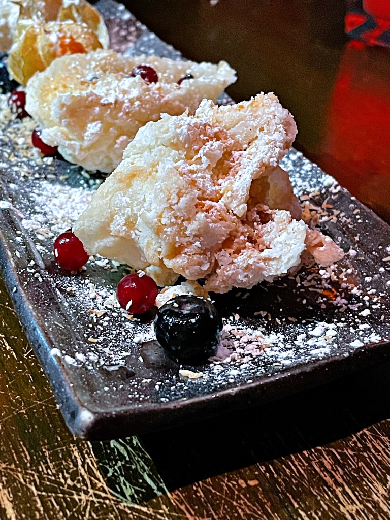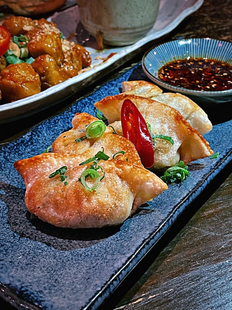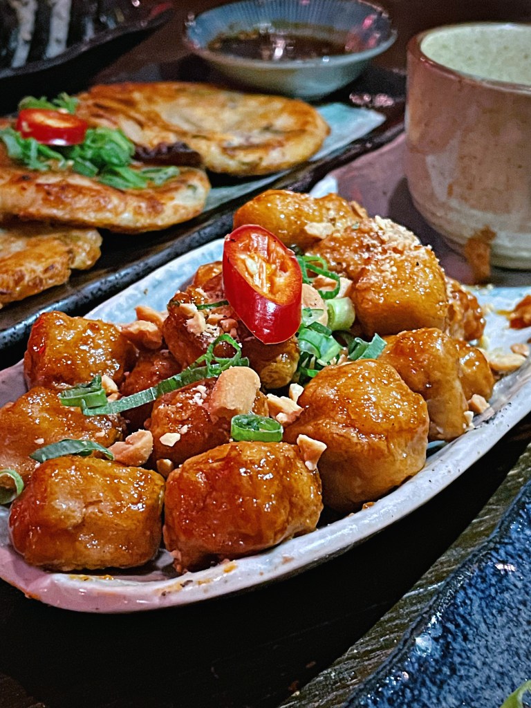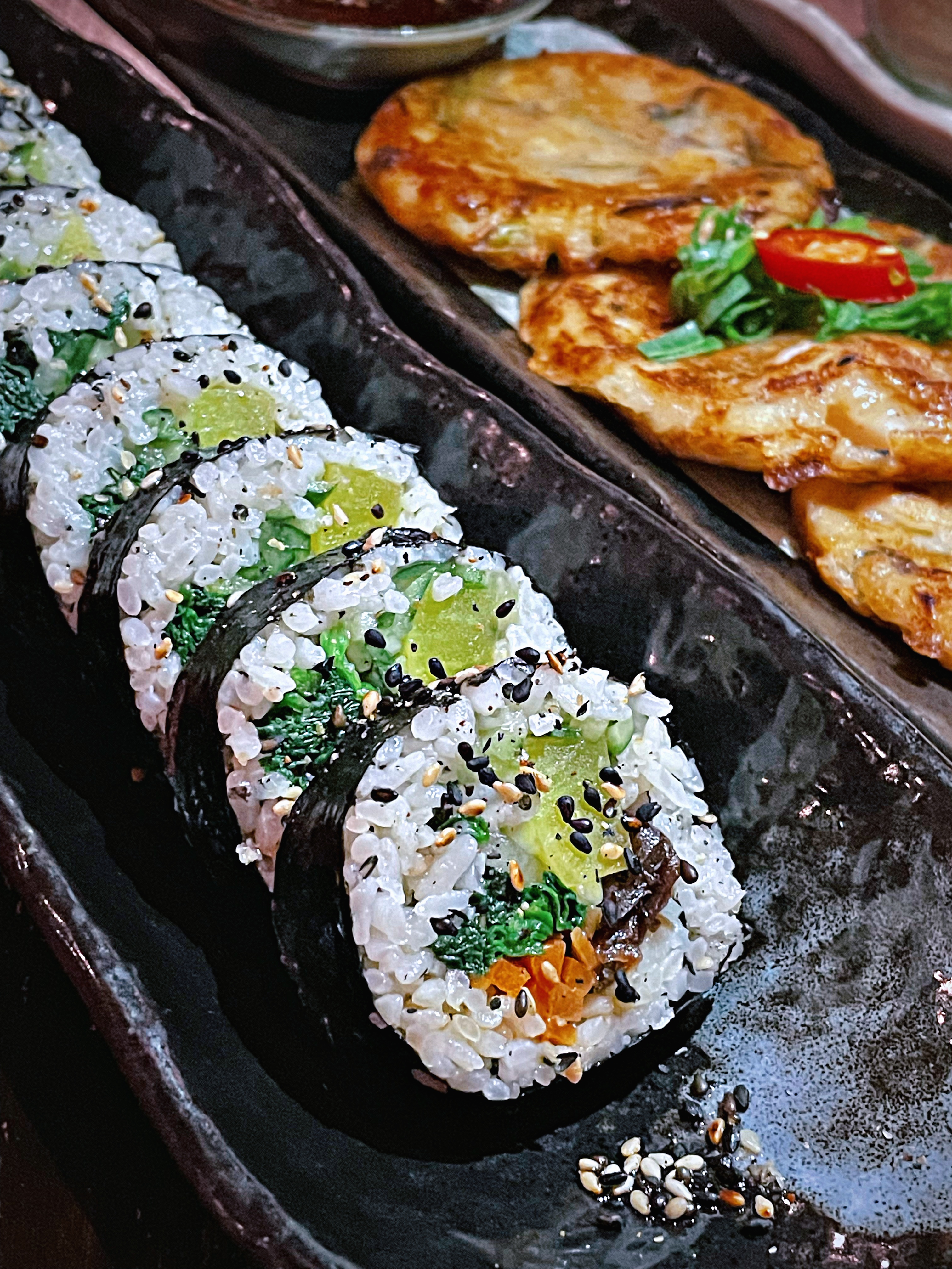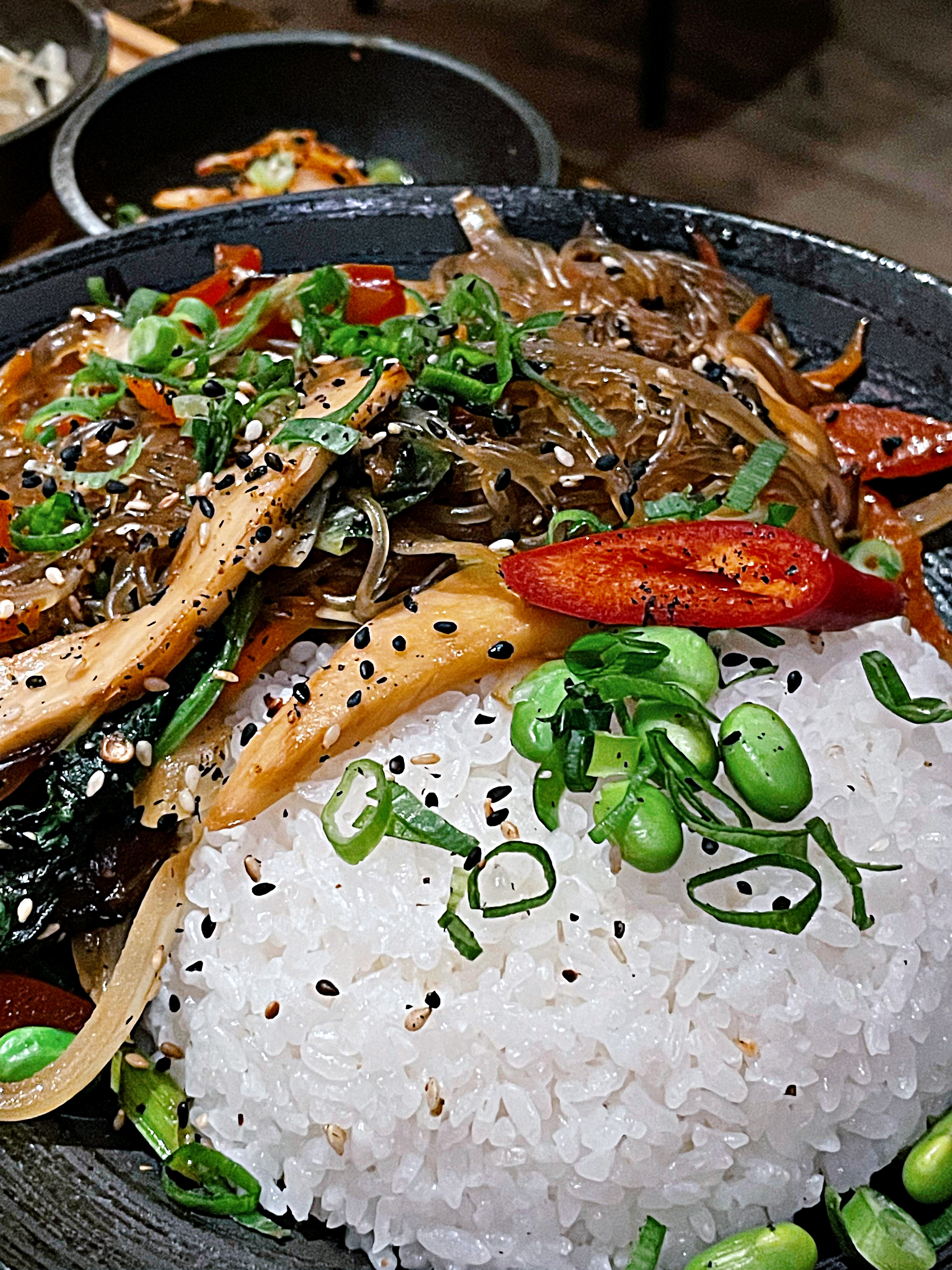 Den Abend haben wir mit einem Lillet Wildberry und einem „Grapy Alex“ mit Soju Garpefruit, Grapefruitsirup und Mineralwasser begonnen. Dazu gab es eine bunte Auswahl extrem leckerer Vorspeisen – den „Mandu Gemüse“, knusprige Teigtaschen mit Gemüse, Tofu und einer pikanten Soja-Sesam Sauce, „Gemüse Kimbab“, im Algenblatt eingerollter Reis, Spinat, Gurke, eingelegter Rettich, Kampyo und Sesam, „Hämul Jeon“, koreanischer Pfannkuchen mit Meeresfrüchten und Frühlingszwiebeln mit pikanter Soja-Sesam Sauce und „Dubu-Gangjeon“, knusprig frittierter Tofu mit Soja-Knoblauch Sauce oder süß-scharfer Sauce mit Erdnüssen. Als Hauptgang hatten wir „Bulgogi Bibimbab“, Reis mit mariniertem BBQ Rindfleisch, Gemüse und Shiitake Pilzen und „Japzeh“, gebratene Reisnudeln mit Gemüse und Kräuterseitlingen auf Reis, dazu gab es noch zwei hausgemachte Limonaden – „Ingwer-Limette“ und „Himbeer-Basilikum. Zum Abschluss mussten wir unbedingt noch die „gebackenen Mochi“, frittierte Mochi Reiskuchen, gefüllt mit Adzuki Bohnen und mit Kokos, probieren. Besonders empfehlen können wir die „Mandu“, „Hämul Jeon“, die „Bibimbab“ und die „Mochi“.