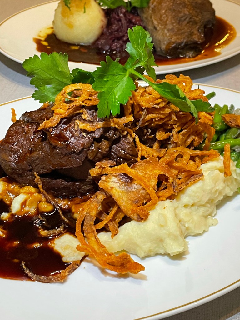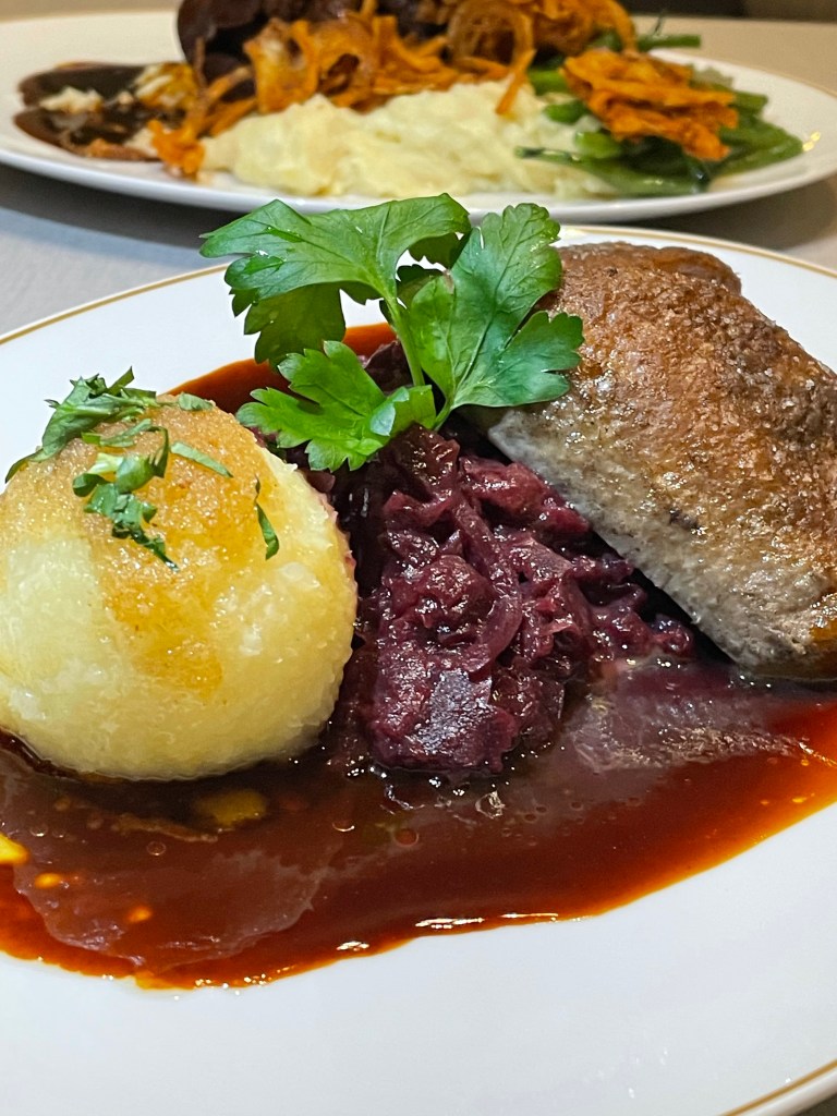 Wir haben uns für eine alkoholfreie Aperitif Variante und ein 3 Gänge Menü entschieden und es uns so richtig gut gehen lassen. Besonders empfehlen können wir tatsächlich „Birnen, Bohnen, Speck“ und die „Roulade“, aber auch das Weihnachtsessen „Gans mit Rotkohl und Klößen“ sollte man sich nicht entgehen lassen.