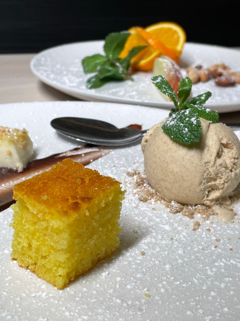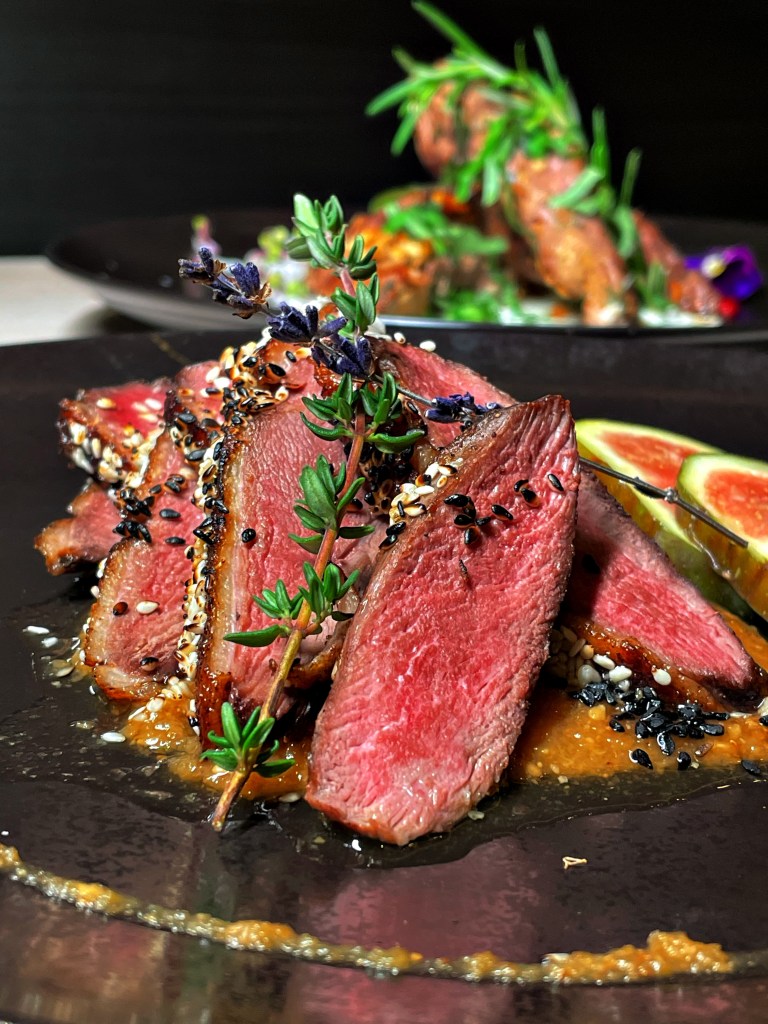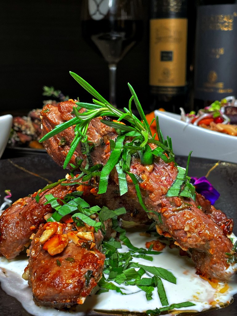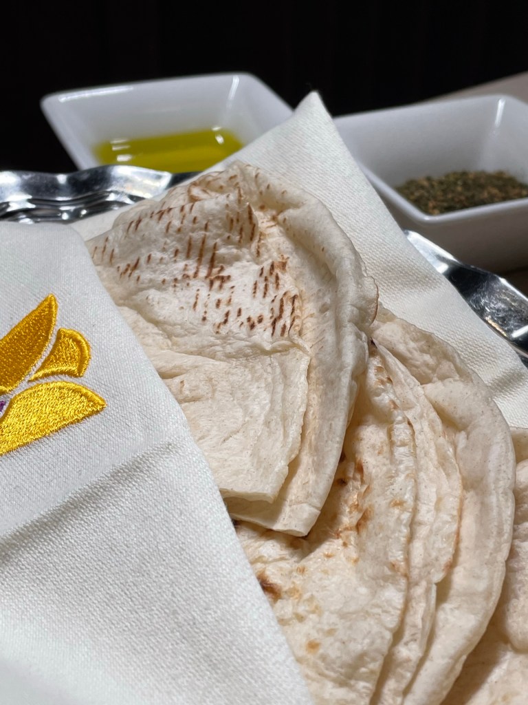 Wir haben den Abend mit einem Cucumber Gin und Belsazar begonnen und uns dann “Mazza” bestellt – die weltbekannte Vorspeise des Orients mit frischem Gemüse, Salaten, Mousses und Pasten mit Nüssen, Saaten & edlen Ölen- veredelt aus dem Füllhorn libanesischer Gewürze. Sehr empfehlen können wir davon das Hummus, “Fatoush” und die Falafel. Besonders angetan waren wir auch von den Hauptgängen “Batta bel Tiin”, Barbarie-Entenbrust auf Feigen-Carpaccio an Walnuss-Anissauce mit Gemüse und Zimt-Pimentreis, und das marinierte Lammfilt nach Arabischer Art, welches unfassbar zart war. Ihr solltet auch unbedingt einen Mocca probieren.