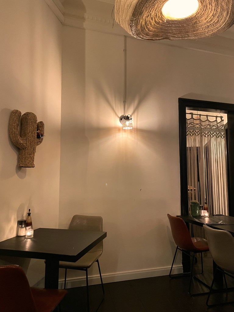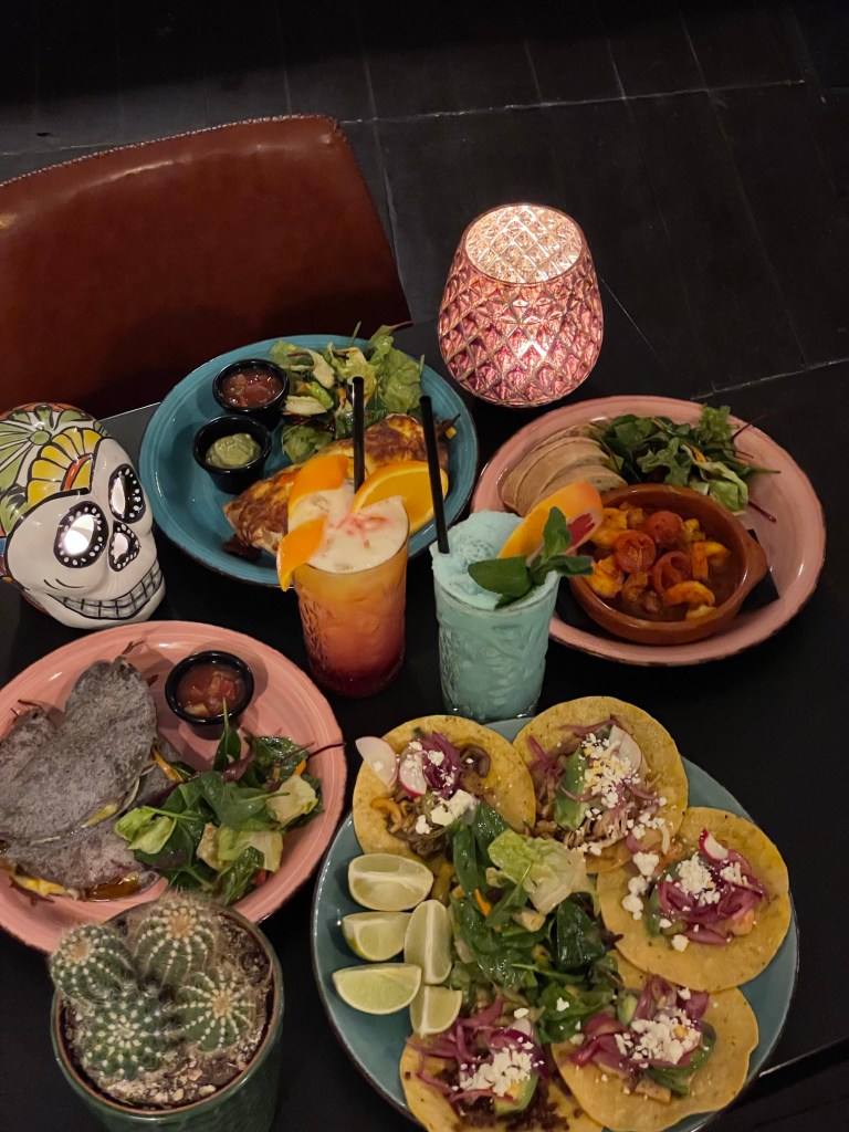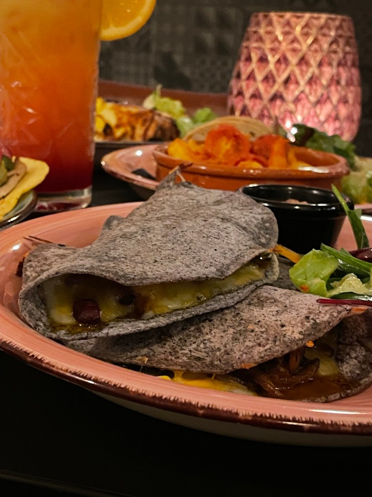 Wir haben es uns so richtig gut gehen lassen und den Abend mit einem Frozen Strawberry Margarita begonnen. Dazu haben wir uns die mit Käse und Jalapeños überbackenen Loco Nachos gegönnt. Natürlich wollten wir auch die Tacos probieren und haben uns für die vegetarische Variante mit Guacamole, Rote Beete, Zwiebeln, Radieschen, Käse, Salsa Verde, Koriander und Limette entschieden. Außerdem hatten wir die Veggie Quesadillas mit Austernseitlingen, Mais, Jalapeños, Bohnen, Käse, Salat und Salsa und die Gambas al ajillo sowie die Veggie Enchiladas, die uns mit den Nachos am meisten begeistern konnten. Natürlich haben wir uns auch noch die super knusprigen Churros zum Nachtisch bestellt.