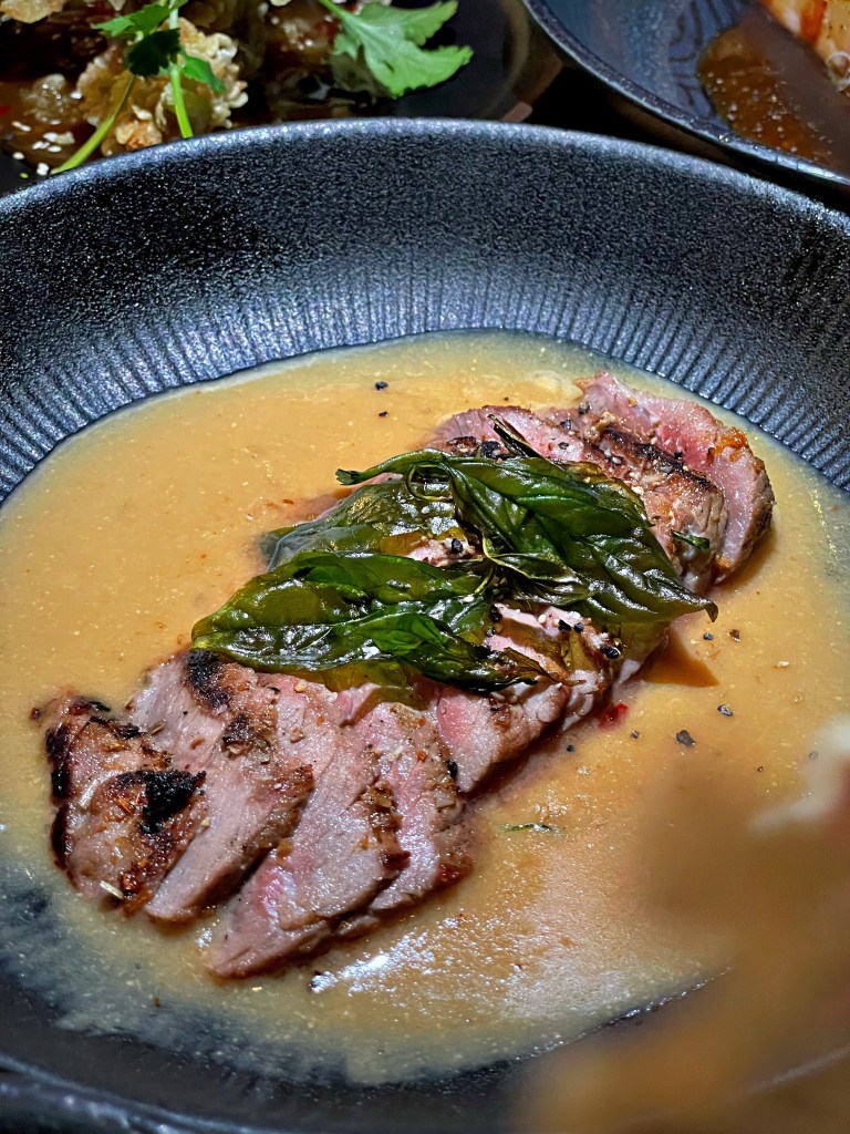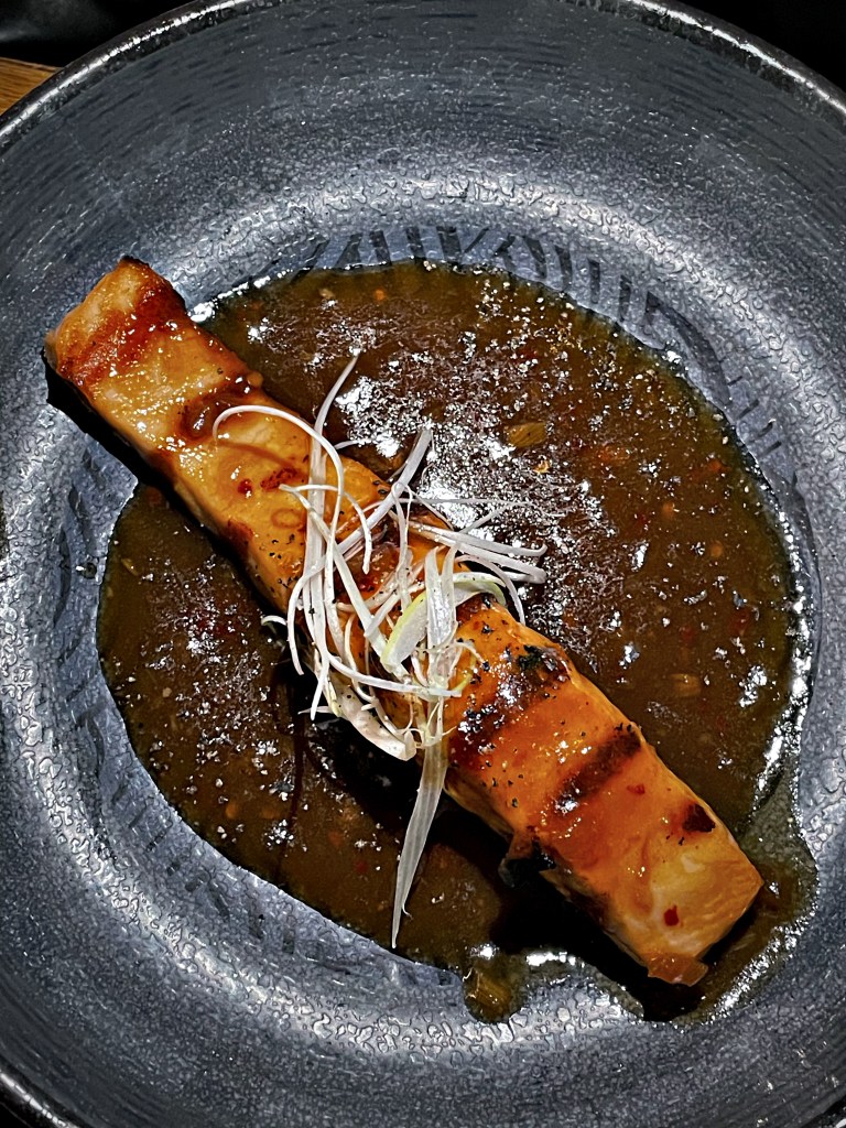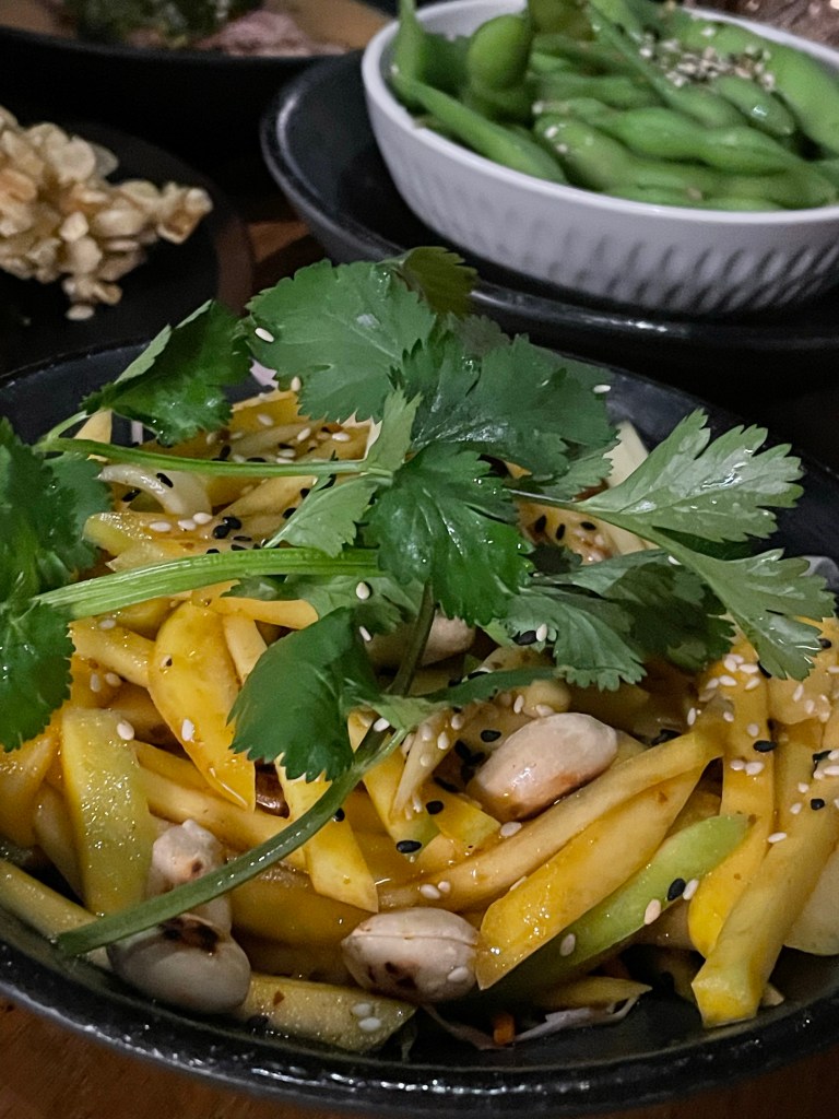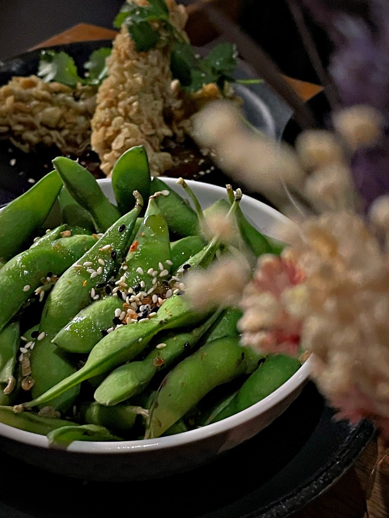 Natürlich war es wahnsinnig schwer, sich bei der großen Tapas Auswahl zu entscheiden. Auf Empfehlung unseres Gastgebers hin, haben wir „Crazy Edamame“, „Mango Tango“, „Face Punch“ (Garnelen mit Crispy-Rice-Flakes und Limetten-Chillisauce), „Once in Tokyo“ (medium gegrilltes Flanksteak mit Miso-Sauce) und „Silly Salmon“ bestellt. Dazu gab es eine hausgemachte Limonade und einen unglaublich guten Cocktail. Am Ende konnten wir gar nicht anders als uns noch einen Nachtisch zu bestellen und haben uns für „Sweet Potato Wonton“ entschieden. Die Wantans sind mit Tarokartoffel und Blueberry gefüllt und kommen mit einer Mangocreme. Unsere absoluten Favoriten waren „Once in Tokyo“ und „Face Punch“. Der Lachs war allerdings auch extrem gut!