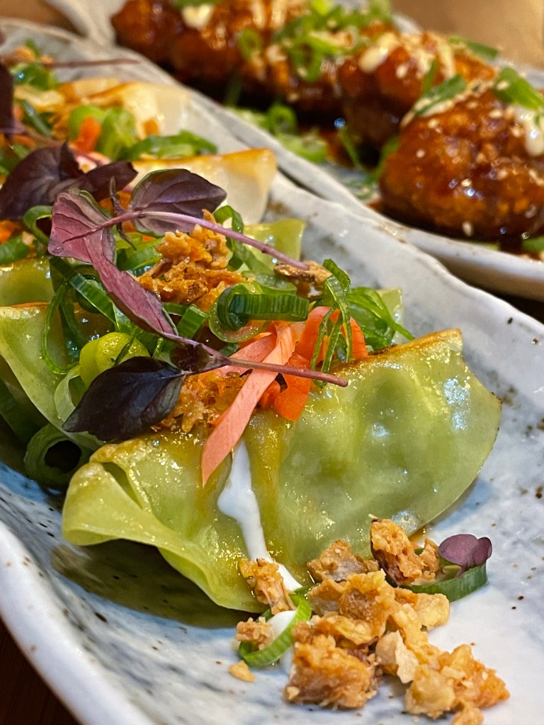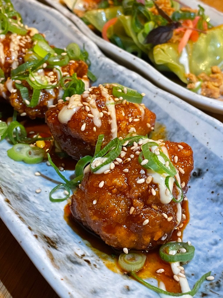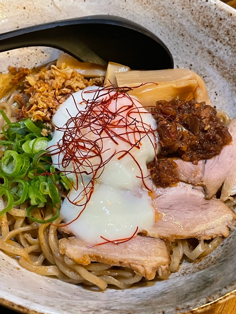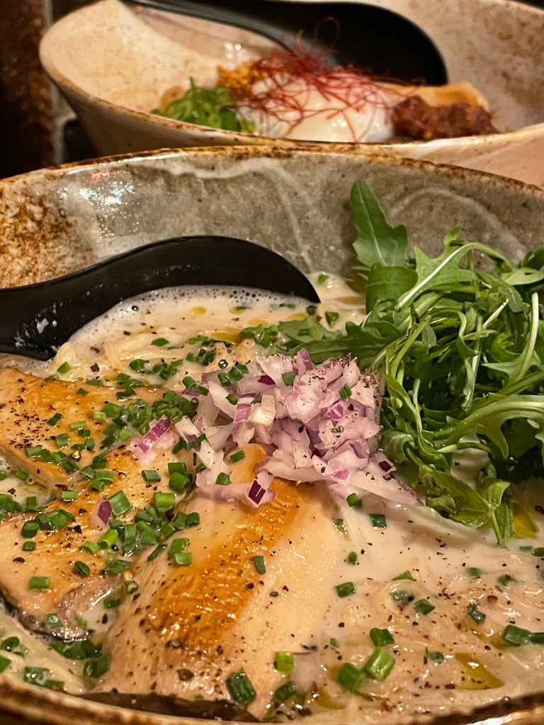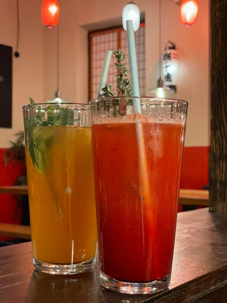 Wir haben uns natürlich Sake bestellt und dazu gab es einen hausgemachten Eistee und eine Himbeer-Thymian Limonade, sehr erfrischend. Vorab hatten wir Korean Fried Chicken und die Gyoza Spezial (halb vegan). Bei den Ramen konnten wir uns kaum entscheiden und haben uns daher den “Teriyaki Kräutersaitlinge” und “Abura Soba Chashu” empfehlen lassen. Zu guter Letzt gab es dann noch einen Hokkaido Cheesecake und Matcha und schwarzer Sesam Eis. Besonders angetan haben es uns die Gyoza, der würzige “Abura Soba Chashu” und das Sesam Eis. Beim nächsten Mal müssen wir unbedingt noch den “Abura Soba Tantan” probieren.