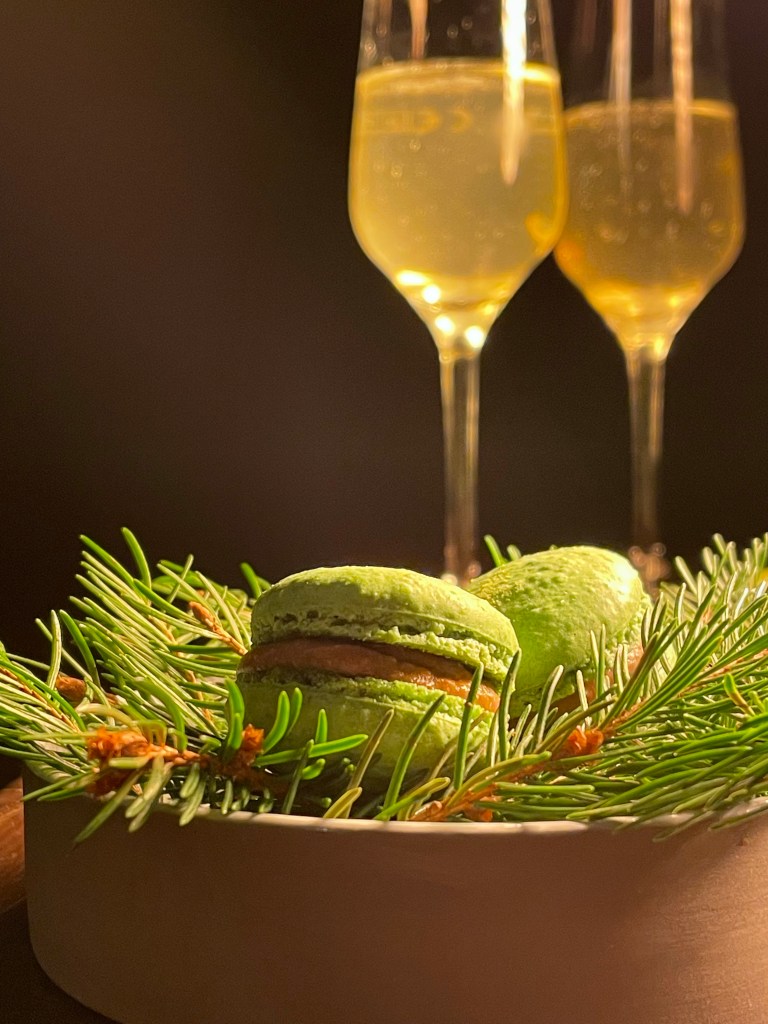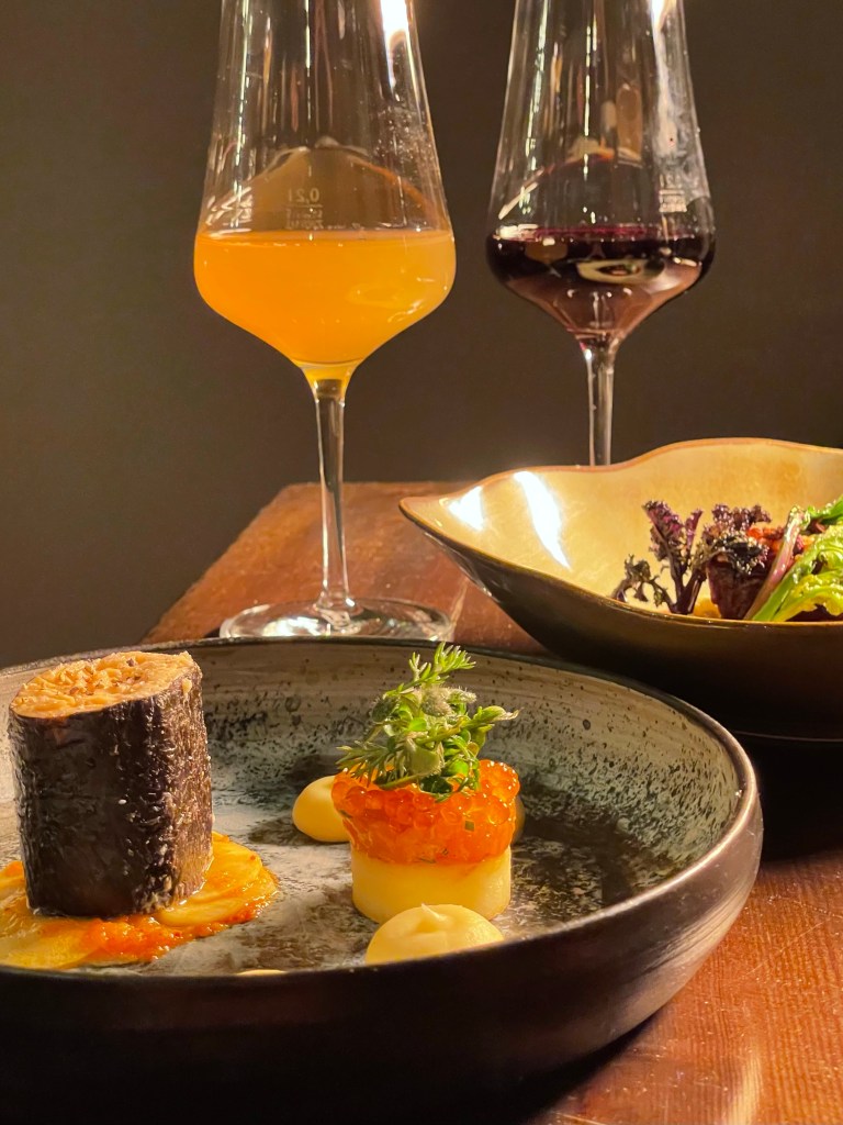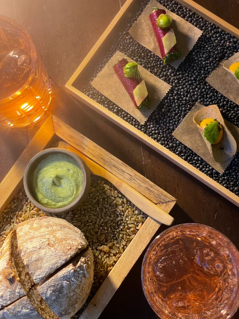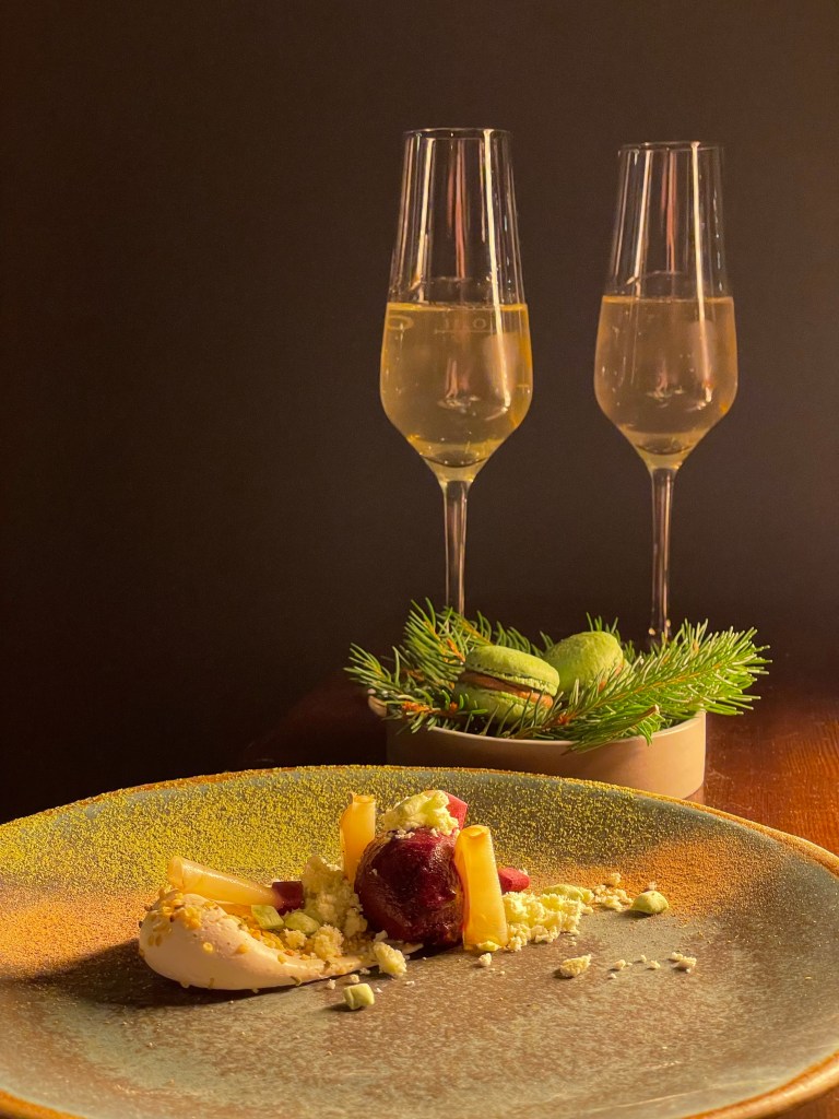 Wir haben uns für ein 4 Gänge Menü mit Weinbegleitung entschieden und waren bereits von den Amuse-Bouche absolut begeistert. Es gab einen herzhaften Gugelhupf mit Rotkohl Püree, einen Linsen Taco mit Süßkartoffelhummus und ein abgewandeltes Smørrebrød (rote Beete Canneloni mit Brotcreme, gepickekter Gurke, gelber Beete und Kräutermajo). Dazu wurde ein knuspriges Kohl-Sauerteigbrot mit Bärlauch-Margarine gereicht. Als Nächstes gab es ein sehr schmackhaftes Karottentatar mit Estragoneis und Karottenöl. Der erste Gang bestand aus dreierlei Chicorée, Buchweizen und Koreandersamen, der zweite aus einer gerösteten Kartoffel, Champignons und Vogelmiere. Bei den Hauptgängen hatten wir einmal die vegetarische Variante mit BBQ Rote Beete, Gerste und Sezchuan Pfeffer und die Lachsforelle mit Pastinake und Jalapeño. Der Nachtisch war auch extrem süß angerichtet – besonders fasziniert waren wir von der Sauerrahmpraline mit weißer Schokolade auf Blätterteig. Dazu gab es noch eine Schoko-Knusper-Schnitte, einen Zitronenkuchen mit Holunderblütensphäre und Holunderkapern und einen Fichten Macaron. Wir können das Menü auf jeden Fall sehr empfehlen und auch die Weine haben uns begeistert.