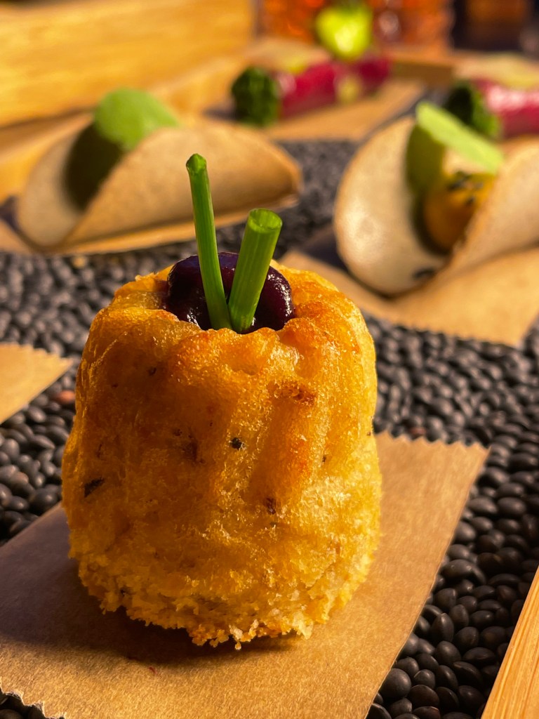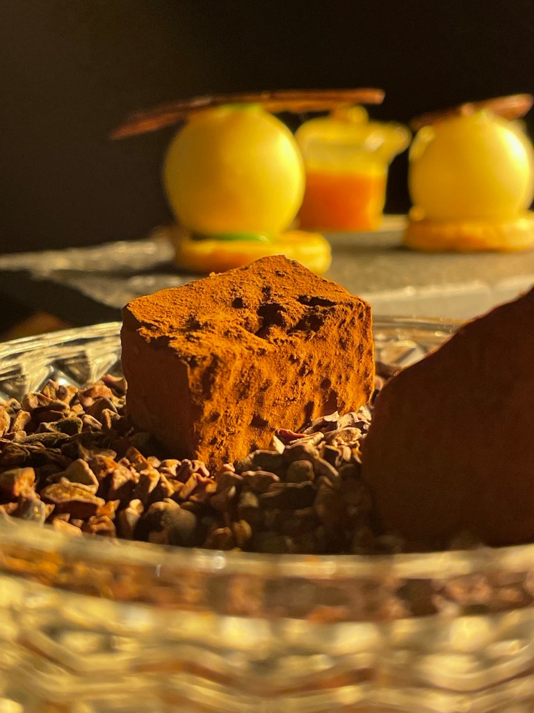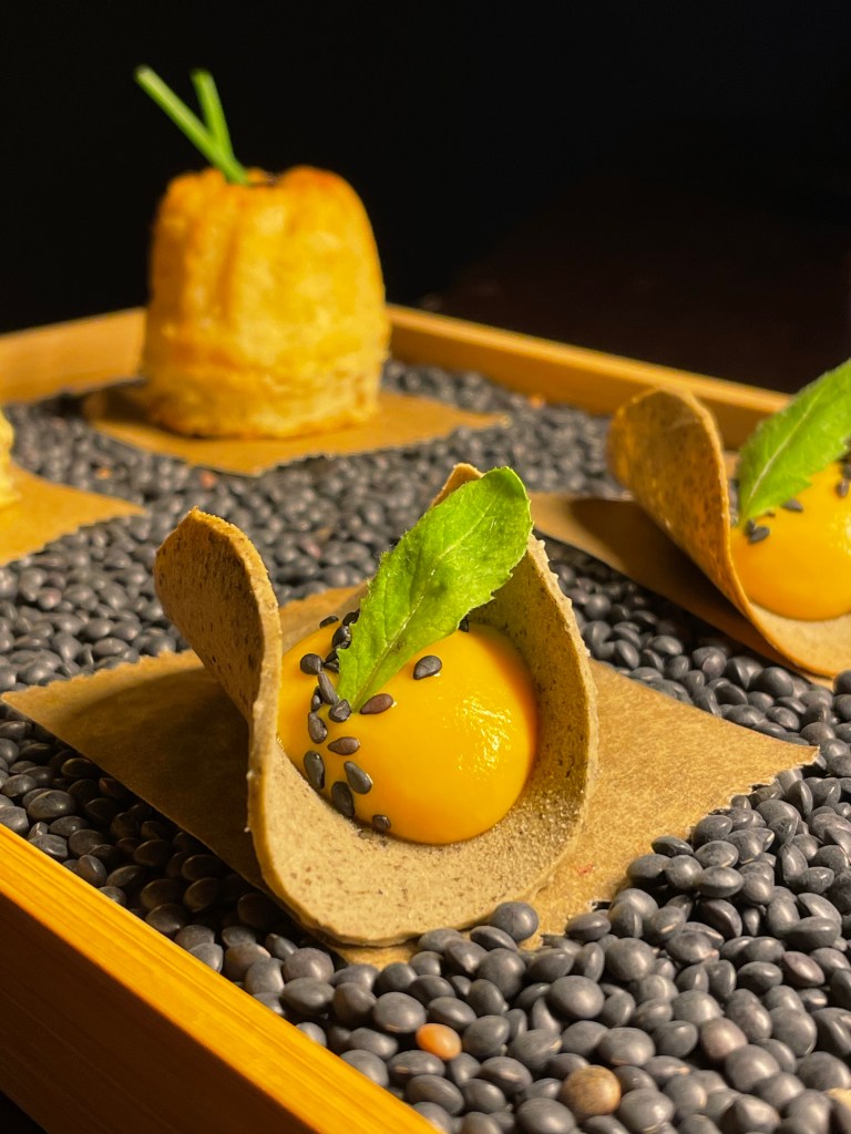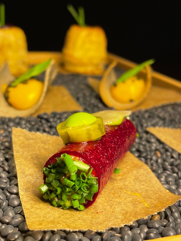 Wir haben uns für ein 4 Gänge Menü mit Weinbegleitung entschieden und waren bereits von den Amuse-Bouche absolut begeistert. Es gab einen herzhaften Gugelhupf mit Rotkohl Püree, einen Linsen Taco mit Süßkartoffelhummus und ein abgewandeltes Smørrebrød (rote Beete Canneloni mit Brotcreme, gepickekter Gurke, gelber Beete und Kräutermajo). Dazu wurde ein knuspriges Kohl-Sauerteigbrot mit Bärlauch-Margarine gereicht. Als Nächstes gab es ein sehr schmackhaftes Karottentatar mit Estragoneis und Karottenöl. Der erste Gang bestand aus dreierlei Chicorée, Buchweizen und Koreandersamen, der zweite aus einer gerösteten Kartoffel, Champignons und Vogelmiere. Bei den Hauptgängen hatten wir einmal die vegetarische Variante mit BBQ Rote Beete, Gerste und Sezchuan Pfeffer und die Lachsforelle mit Pastinake und Jalapeño. Der Nachtisch war auch extrem süß angerichtet – besonders fasziniert waren wir von der Sauerrahmpraline mit weißer Schokolade auf Blätterteig. Dazu gab es noch eine Schoko-Knusper-Schnitte, einen Zitronenkuchen mit Holunderblütensphäre und Holunderkapern und einen Fichten Macaron. Wir können das Menü auf jeden Fall sehr empfehlen und auch die Weine haben uns begeistert.