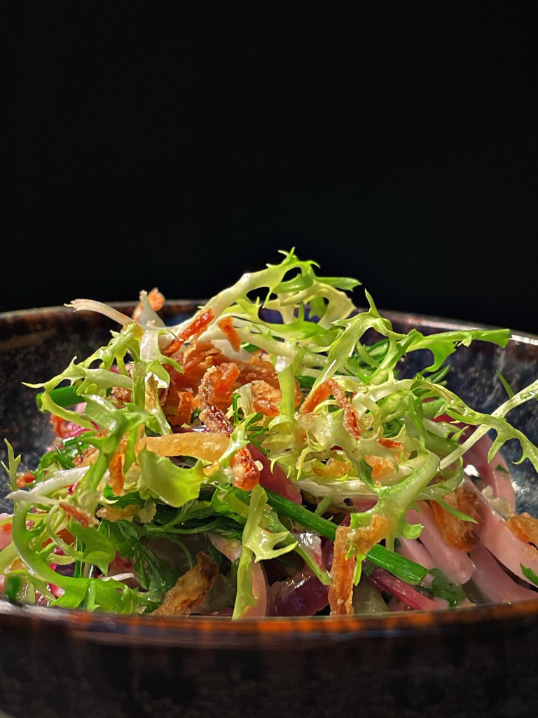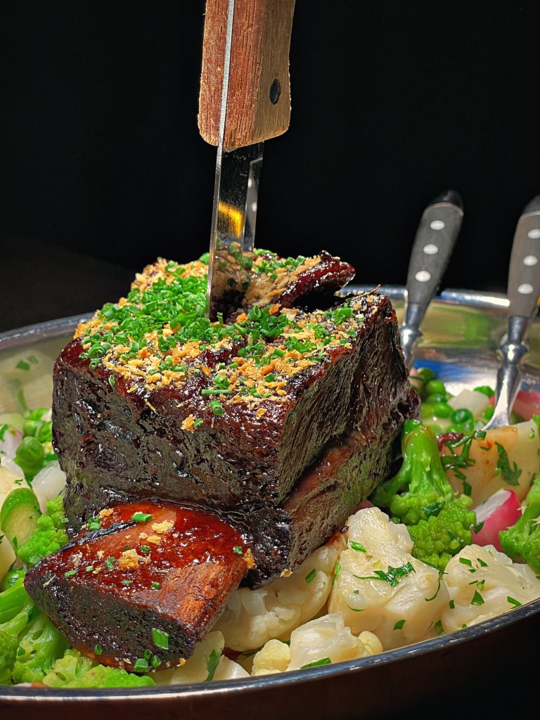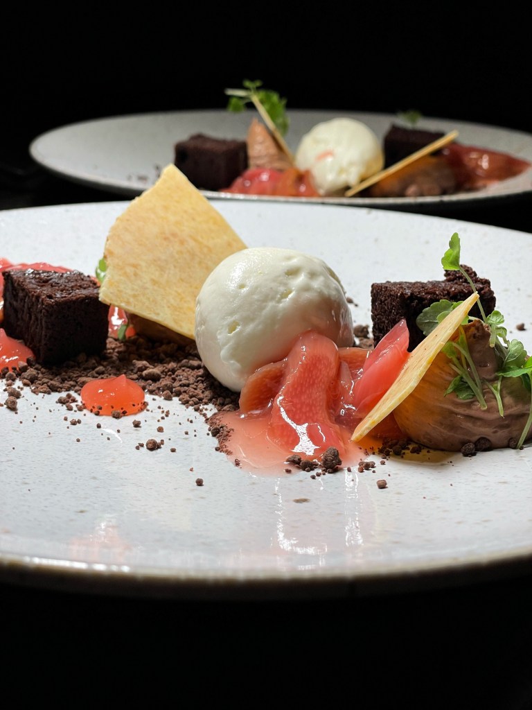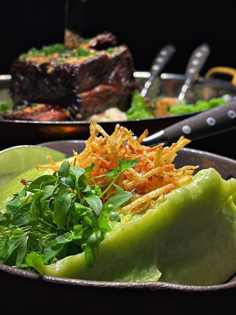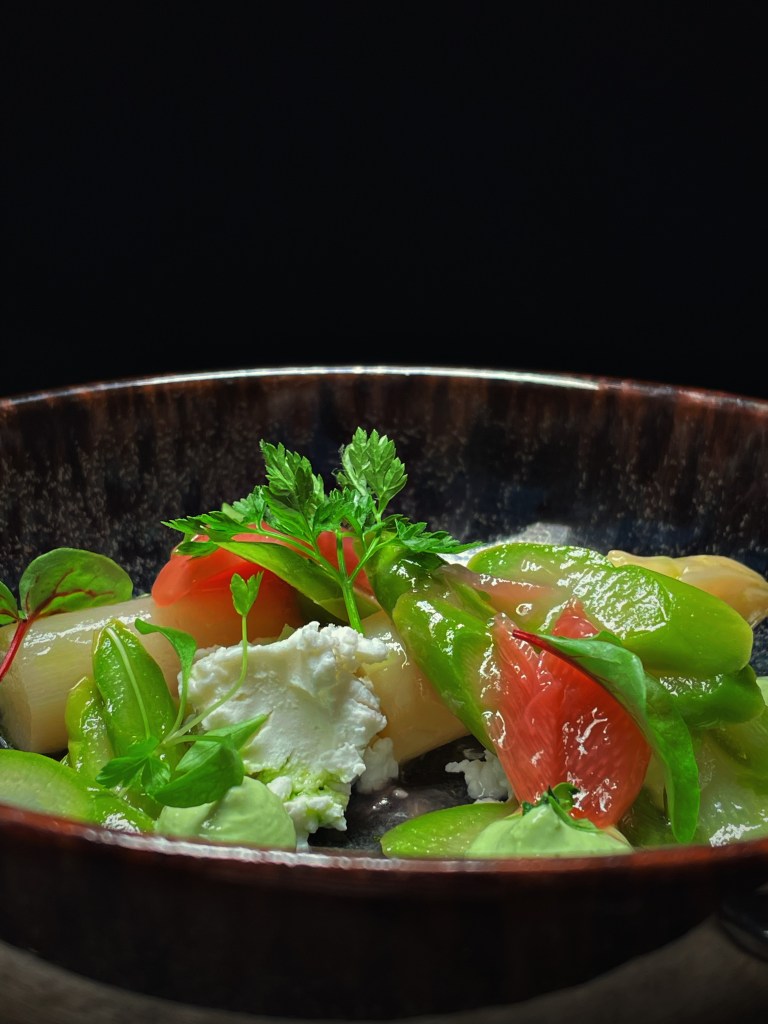 Wir haben uns für das “Herzstück” entschieden und den Abend mit einem wunderbaren Aperitif begonnen. Zunächst gab es aromatisches Sauerteigbrot mit einem hausgemachtem Dip. Der erste Gang bestand aus drei kleinen Tellerlein, der geräucherten Forelle mit Joghurt und Gurke, dem milden Ziegenkäse mit Rhabarber und Spargel und dem Fränkischen Wurstsalat. Beim Hauptgang haben wir uns für die geschmorte Rinderrippe mit Honiglack, Frühlingsgemüse und Kartoffel- Bärlauchpüree entschieden. Zu guter Letzt haben wir das unfassbar gute Dessert aus Schokolade, Rhabarber und Sauerrahmeis bekommen. Unsere absoluten Favoriten waren der Ziegenkäse, die Rinderrippe und natürlich auch das Dessert. Wir können das Menü wärmstens empfehlen.