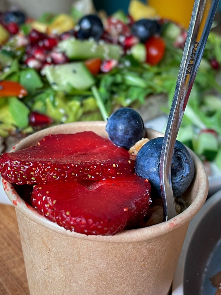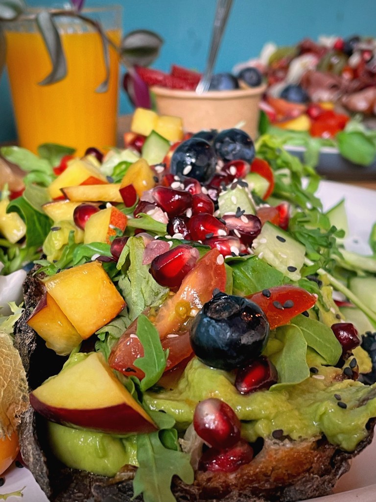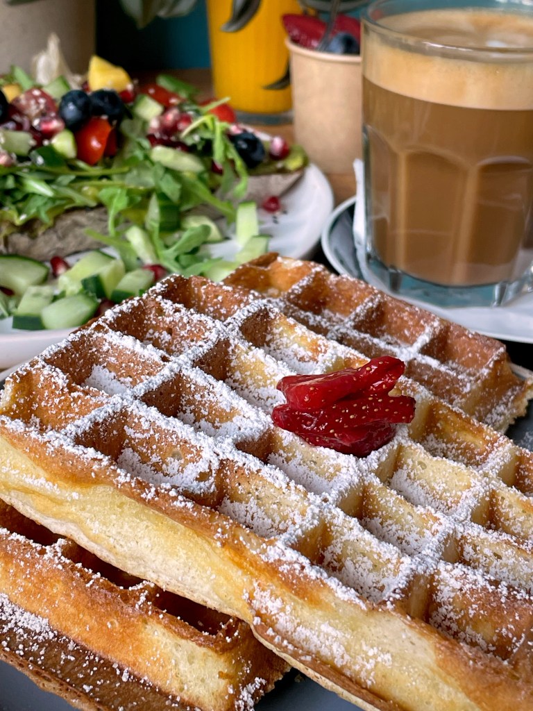 Wir haben uns das “Hulk Bread” mit Avocado, Sesam, Granatapfelkernen, Tomaten und Rucola und den “Italian Job” mit Prosciutto, Trüffelbutter, Rucola, Parmesan, Tomaten und Crema di Balsamico, beides gigantische Scheiben frischen Sauerteigbrotes, bestellt. Dazu hatten wir noch eine Portion Rührei, eine Waffel mit Puderzucker und ein “selfmade Granola Joghurt”, das wir wirklich empfehlen können.