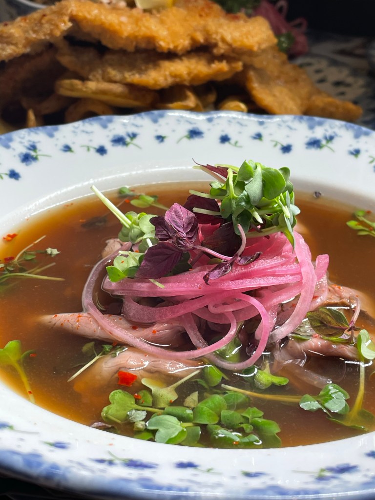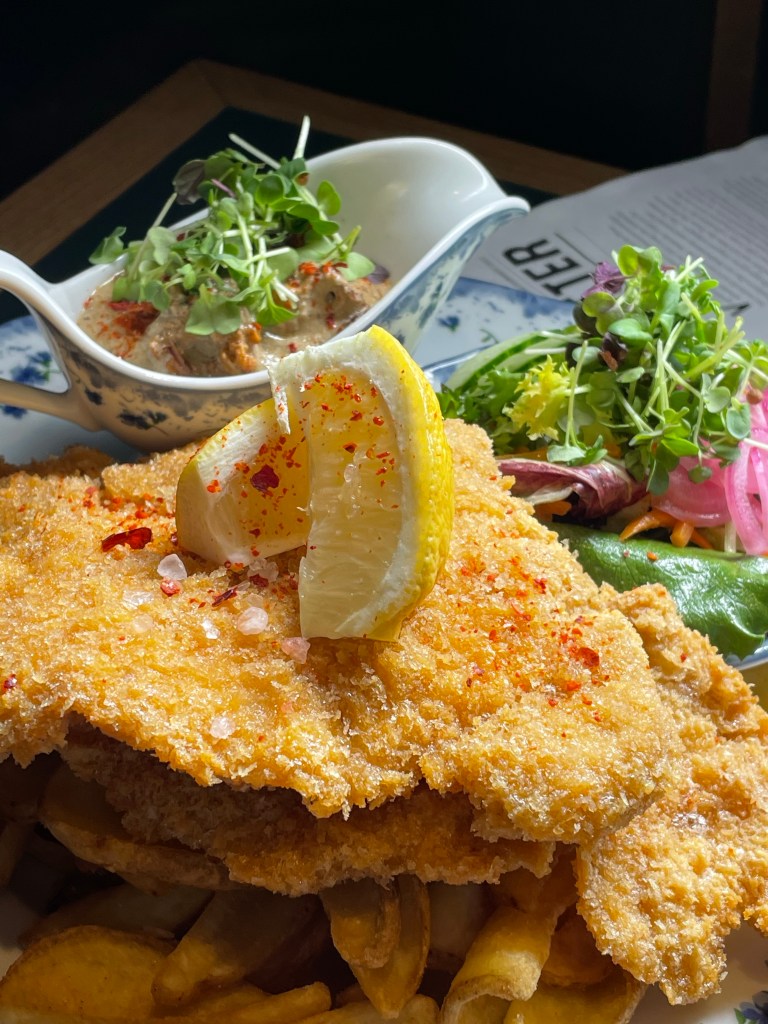 Zu Beginn gab es drei sehr interessante Bier-Aperitife, unter anderem den aktuellen Klassiker – Organic Spritz. Wir haben uns vom Pfifferlings-Menü inspirieren lassen und den “Ochsenschluck”, eine kräftige Rinderbrühe mit Wurzelgemüse, gesottenem Rindfleisch, Pfannkuchenstreifen, Kräutern & frischen Pfifferlingen, “Pfiffig”, eine Sauerteigseele mit Pfifferlingen, roter Zwiebel, Schmortomaten und Sauerrahm und das “Schnitzel mit frischen Pfifferlingen” ausgesucht und dazu noch die “Vegane Seitan-Currywurst Schranke” bestellt. Das Schnitzel hat uns besonders begeistert und auch die Sauerteigseele können wir sehr empfehlen. Zu guter Letzt haben wir uns noch die “Matrosenschluck-Mascarpone-Creme”, eingeweckte Kirschen und Franzbrötchen-Stücken, geteilt. Ein echter Hochgenuss für Mascarpone-Liebhaber.