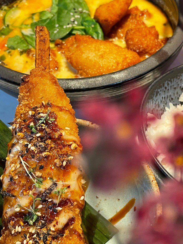 “Onigiri Yaki”, knuspriges Reisbällchen am Stiel, gefüllt mit Yakitori Hähnchen, Kafir-Mayo, Teriyaki und Furikake, “Gyoza Ente”