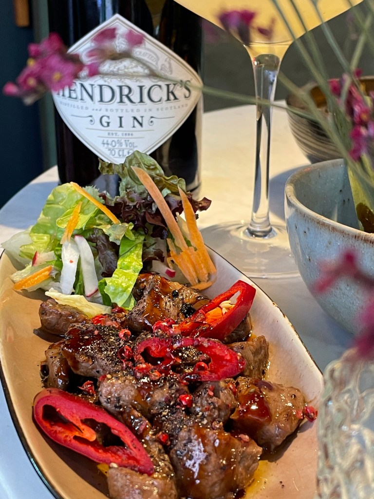 Gin, Limettensaft, Eiweiß und Grenadine und einen “Mui Ne Sunrise” mit Himbeere, Chili, Limetten, Zucker und Wodka. Bei der großen Tapas Auswahl fiel es uns wirklich nicht leicht und wir haben uns den “Teriyaki Lachs” mit Edamame, Sesam und Wasabi Crunch, “Luc Lac Beef”, Rindfleischwürfel im Wok geschwenkt in Yakiniku-Soße, rote Peperoncini und Rosa Pfeffer, “Mango Salat”,