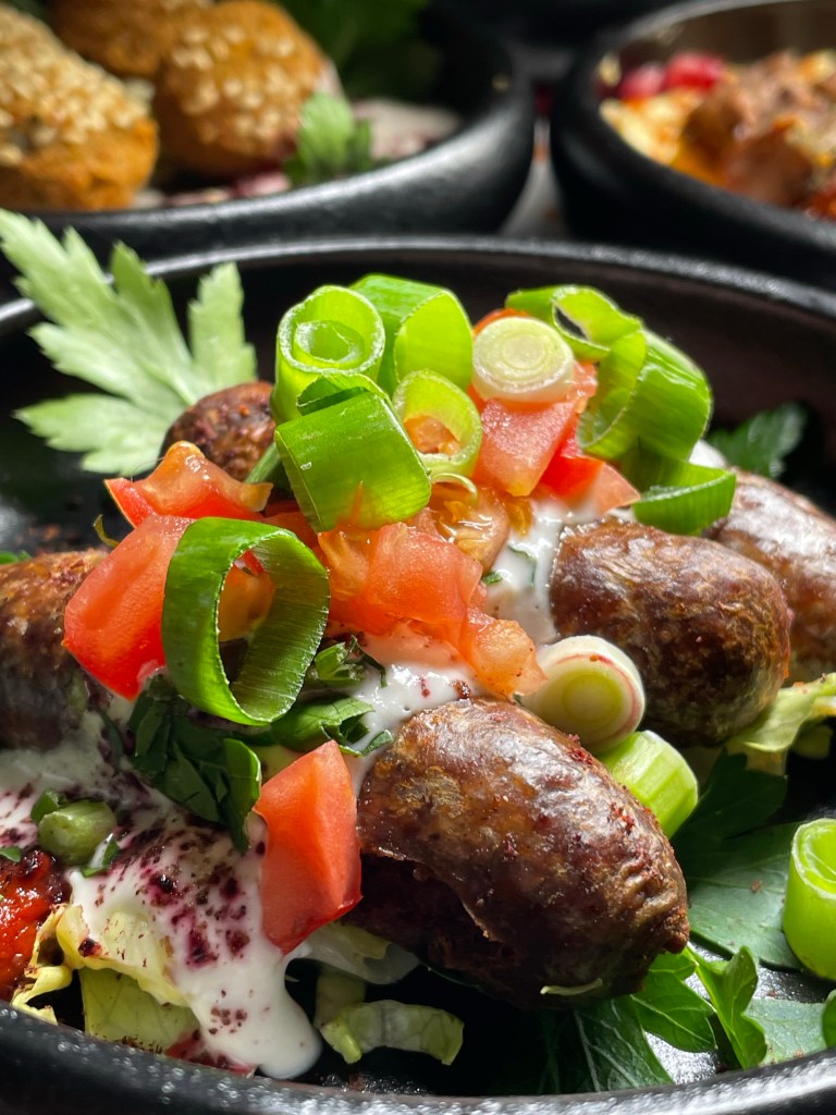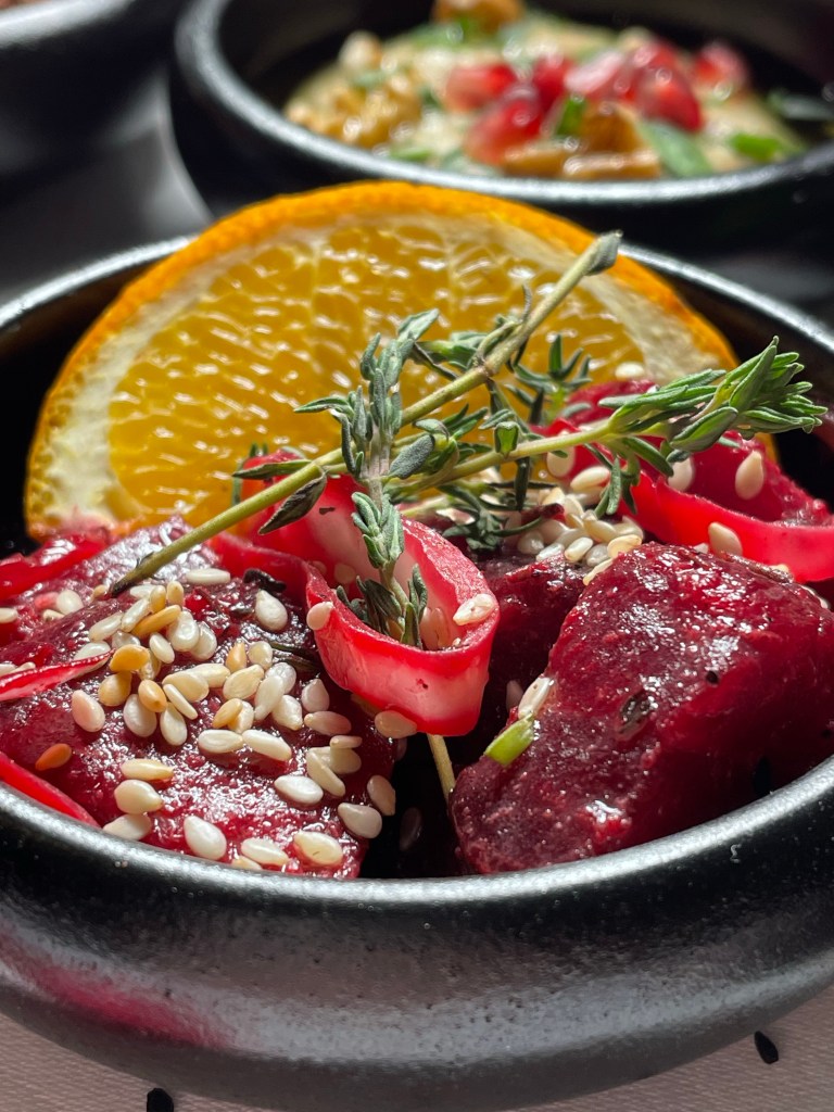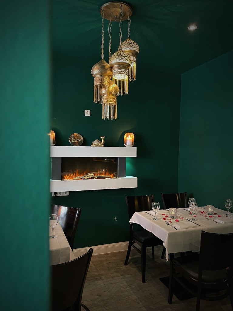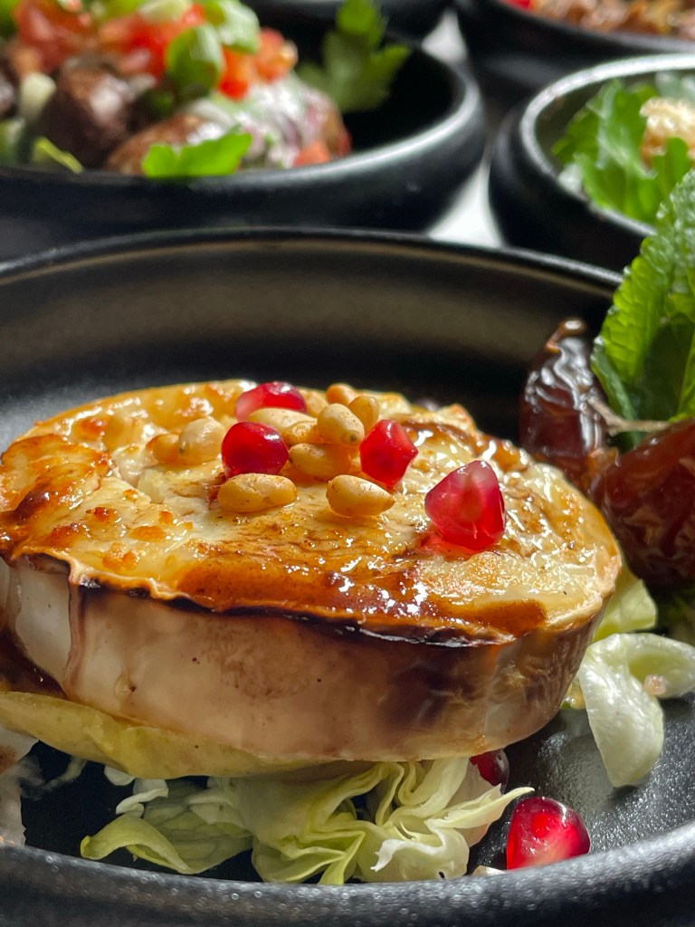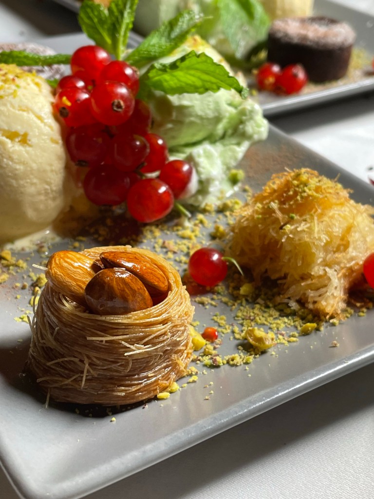Wir haben den Abend mit einem libanesischen Aperitif, “Château Heritage à base du vin & noir”, begonnen und uns dann eine bunte Auswahl der orientalischen Tapas zusammenstellen lassen. Zunächst kam ein Gruß aus der Küche – geröstetes Brot mit Frischkäse und Datteln, dann gab es Humus, marinierte Rote Bete mit Sesam und Thymian, Labne (Joghurt mit Walnuss, Minze, Knoblauch), Baba Ghanoush (geräuchertes Auberginenmousse) und Olivensalat mit Granatapfel und Thymian. Dazu kam natürlich frisches Brot. Dann ging es noch mit einer Runde warmer Tapas weiter und wir haben Falafel, gebackenen Ziegenkäse mit Honig & Zimt, “Makanek”, hausgemachte Lammwürstchen mit Pinienkernen, Riesengarnelen in Hummer-Estragon Sauce, Humus mit Lammrücken Scheiben und Schawarma mit Hähnchenstücken bekommen. Tatsächlich haben es uns die Riesengarnelen, das Lamm, das Baba Ghanoush und der Olivensalat besonders angetan und wir würden diese Gerichte jedem ans Herz legen. Natürlich gab es noch einen süßen Abschluss mit selbstgemachtem und sehr leckerem Eis, Baklawa, einem mini Fondant au Chocolat und Kunafa (Süßspeise aus Käse).