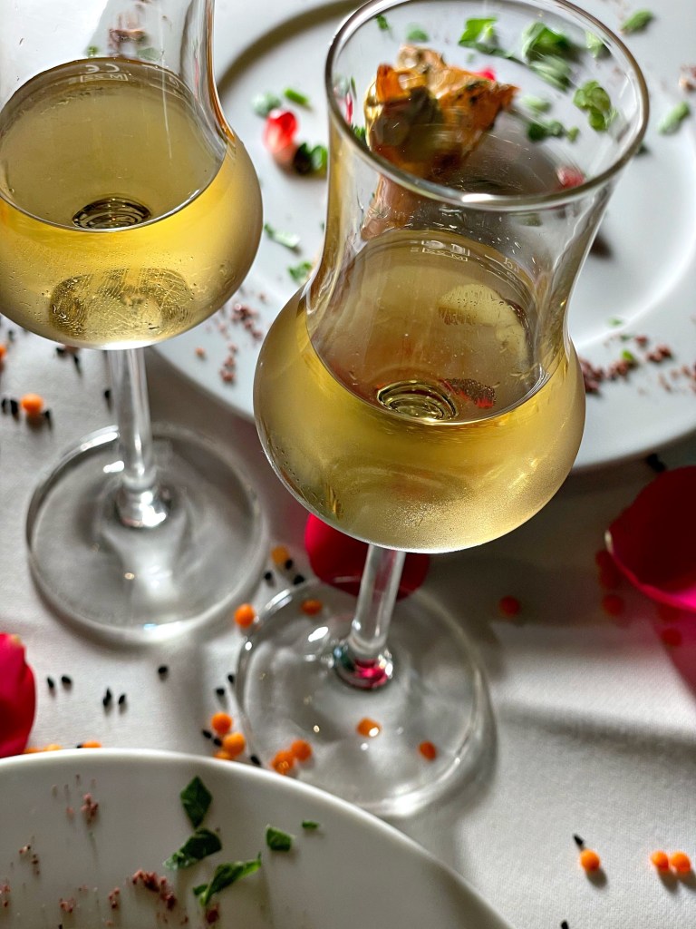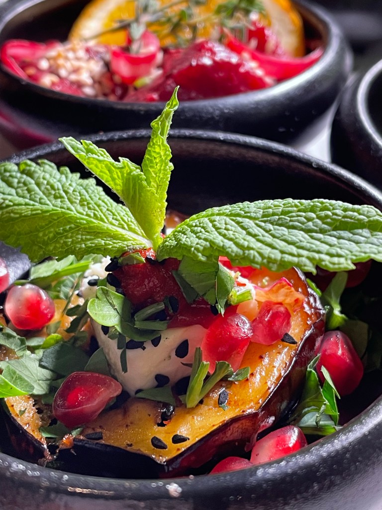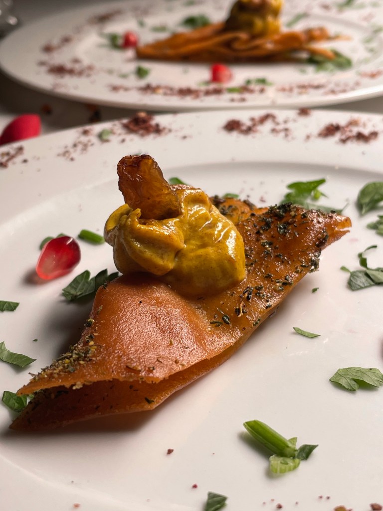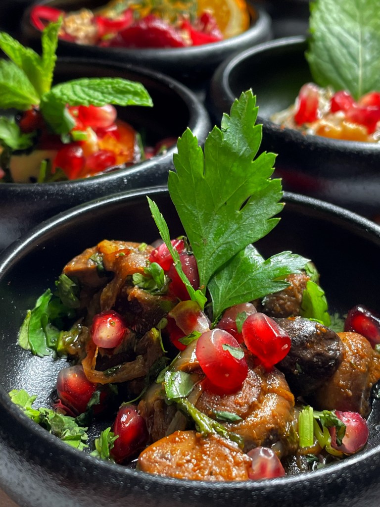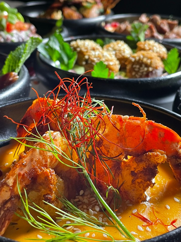 Wir haben den Abend mit einem libanesischen Aperitif, “Château Heritage à base du vin & noir”, begonnen und uns dann eine bunte Auswahl der orientalischen Tapas zusammenstellen lassen. Zunächst kam ein Gruß aus der Küche – geröstetes Brot mit Frischkäse und Datteln, dann gab es Humus, marinierte Rote Bete mit Sesam und Thymian, Labne (Joghurt mit Walnuss, Minze, Knoblauch), Baba Ghanoush (geräuchertes Auberginenmousse) und Olivensalat mit Granatapfel und Thymian. Dazu kam natürlich frisches Brot. Dann ging es noch mit einer Runde warmer Tapas weiter und wir haben Falafel, gebackenen Ziegenkäse mit Honig & Zimt, “Makanek”, hausgemachte Lammwürstchen mit Pinienkernen, Riesengarnelen in Hummer-Estragon Sauce, Humus mit Lammrücken Scheiben und Schawarma mit Hähnchenstücken bekommen. Tatsächlich haben es uns die Riesengarnelen, das Lamm, das Baba Ghanoush und der Olivensalat besonders angetan und wir würden diese Gerichte jedem ans Herz legen. Natürlich gab es noch einen süßen Abschluss mit selbstgemachtem und sehr leckerem Eis, Baklawa, einem mini Fondant au Chocolat und Kunafa (Süßspeise aus Käse).