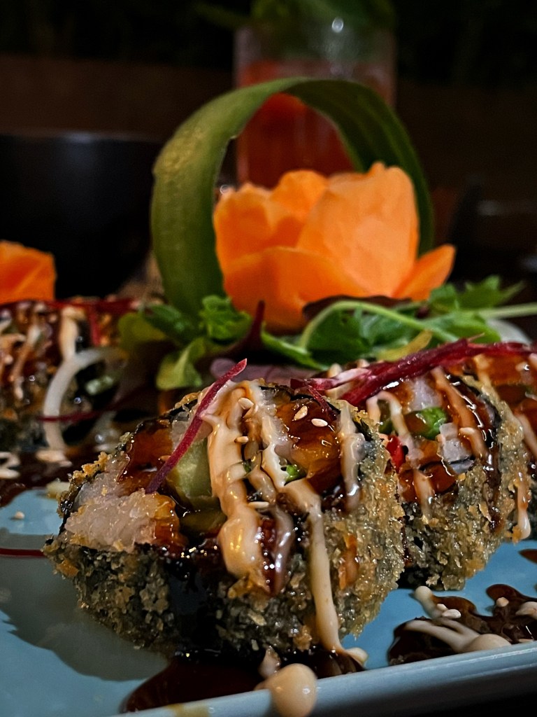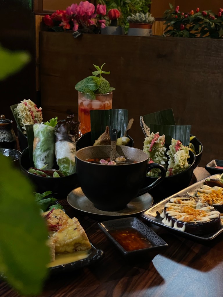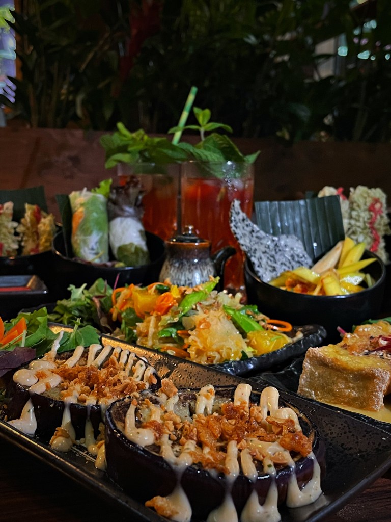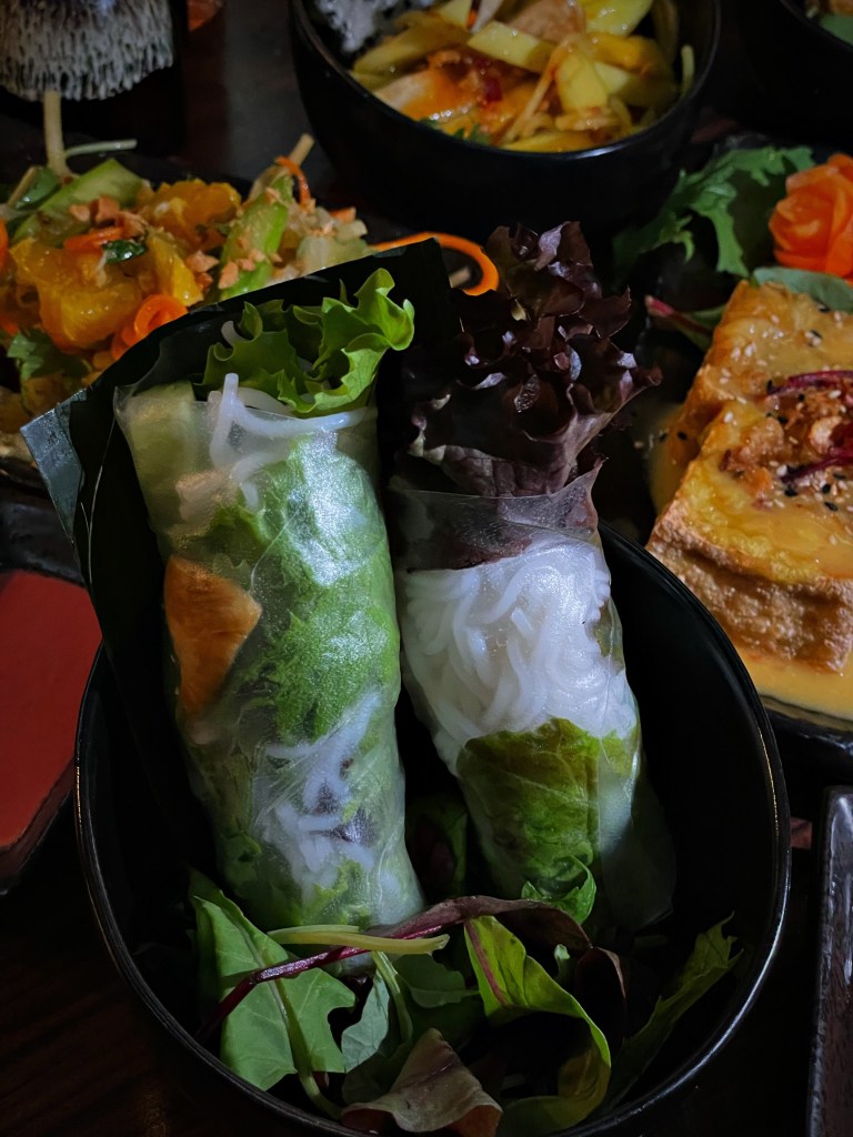 Die Getränke haben uns direkt begeistert und wir haben uns einen “Ha Long” Eistee mit Jasmintee, Erdbeere, Ananas und Maracuja und einen “Hai Hung” mit Roseneistee, Litschi, Limette und Minze und dazu noch sehr leckere Tees bestellt. Wir haben uns für verschiedene vegane Tapas entschieden und hatten unter anderem super frische Sommerrollen, “Wizard” – frittierter Tofu mit Currysoße, “Innocent” – weißer Holzohrpilze-Salat mit Karotte, grünem Spargel, Erdnüssen und Mango-Dressing, “Marvelous” – gegrillte Aubergine mit Röstzwiebeln, Erdnüssen und Chili-Teriyaki-Sauce. Zu unseren Highlights gehörte die gebackene Avocado mit Reischips und Himbeersauce und das vegane Sushi. Für die, die vegan essen, aber den Geschmack von Fleisch vermissen, gibt es sogar Seitan-Garnelen und Seitan-Chicken, die wirklich sehr nah an das Original rankommen! Zum Abschluss hatten wir noch Mochi-Eis – sehr lecker!