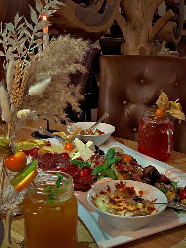 Wir haben direkt einen sehr fruchtigen Begrüßungsdrink bekommen und uns dann die „XII Apostel Vorspeisenplatte“ mit Garnelen in Tomatensauce, Datteln im Speckmantel, gegrilltem Gemüse, Grana Padano, italienischem Schinken, Oliven und Schafskäse, geteilt. Als Zwischengang haben wir uns eine sehr leckere Pizza bestellt. Die Pizza machen sie auf dem Stein, daher wird sie besonders knusprig. Als Hauptgang hatten wir frische Trüffelpasta und Surf & Turf. Natürlich gab es auch noch eine Dessertvariation mit Tiramisù, Lavakuchen und Pana Cotta – ein Traum! Wir können vor allem die Pizza empfehlen.