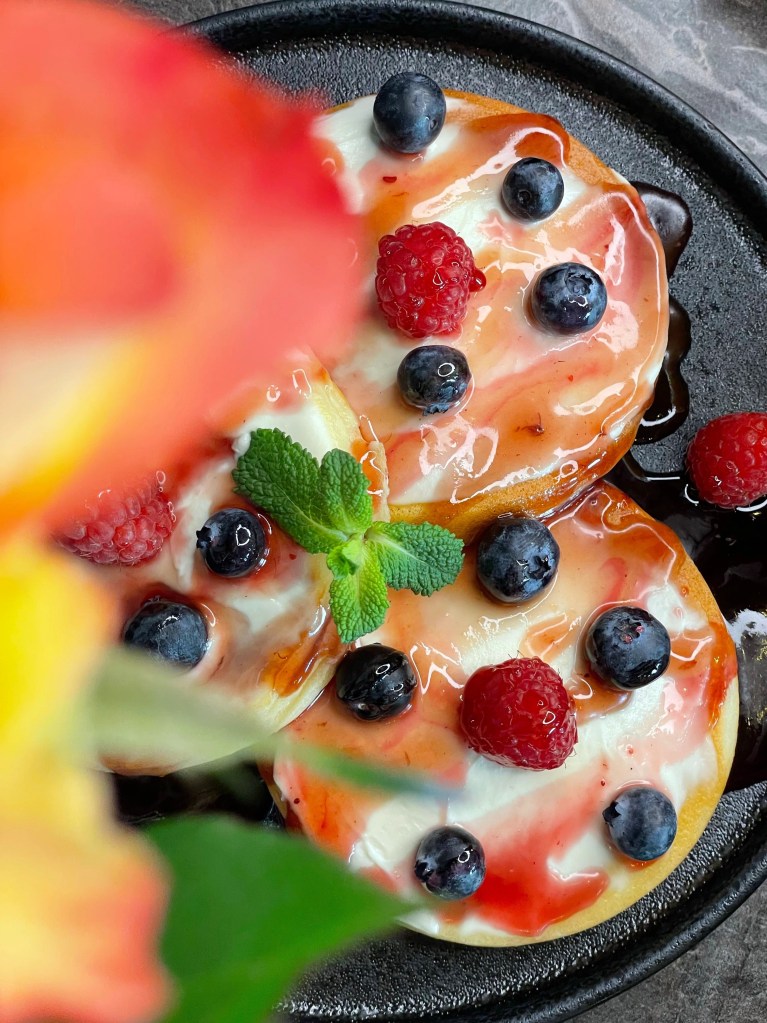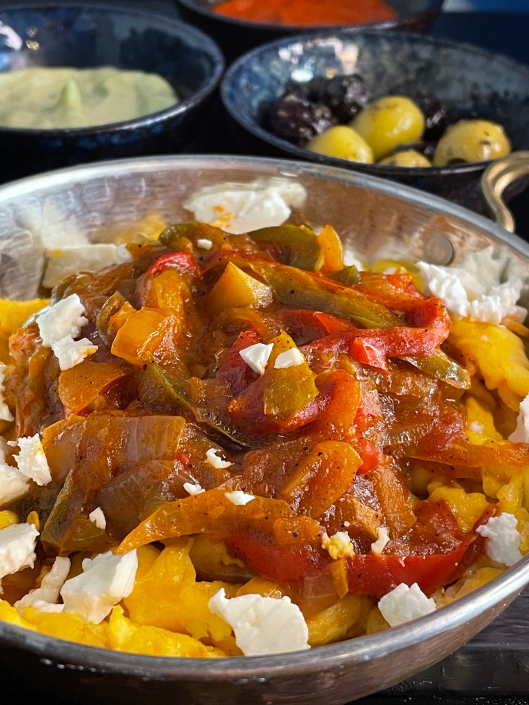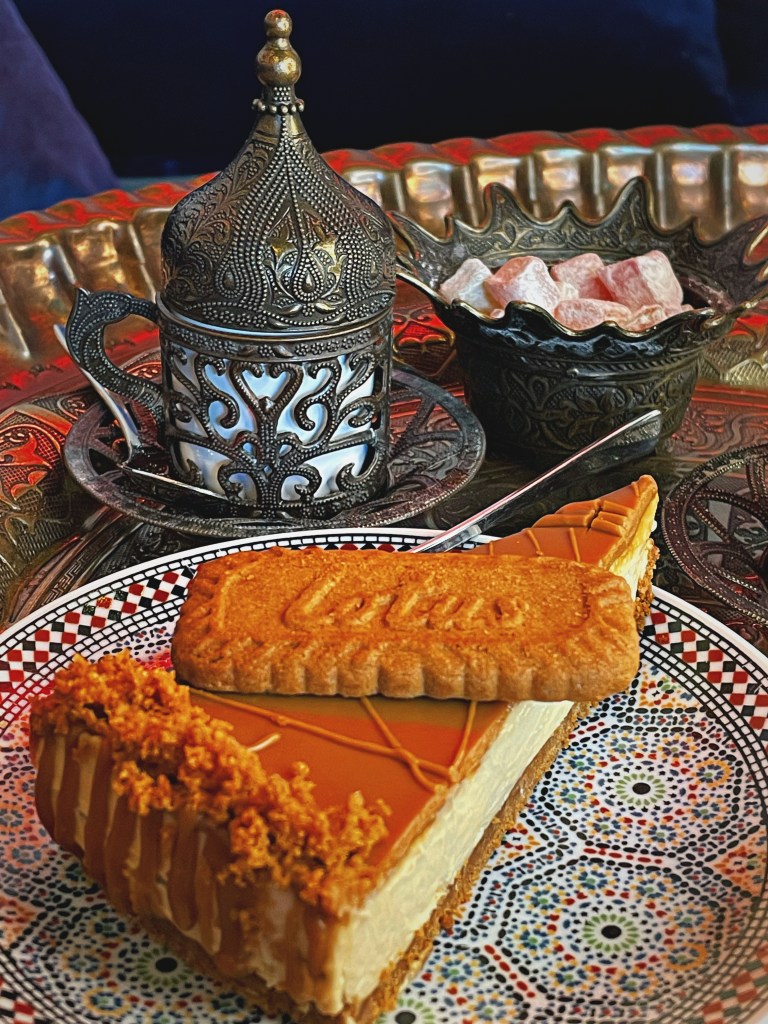 Pfanne mit Chakchouka und Schafskäse und die Pancakes „Mascarpone jagt Wildbeere“, fluffig und süß nach amerikanischer Art. Das absolute Highlight ist auf jeden Fall der Lotus Cheesecake, der einfach unfassbar cremig ist!