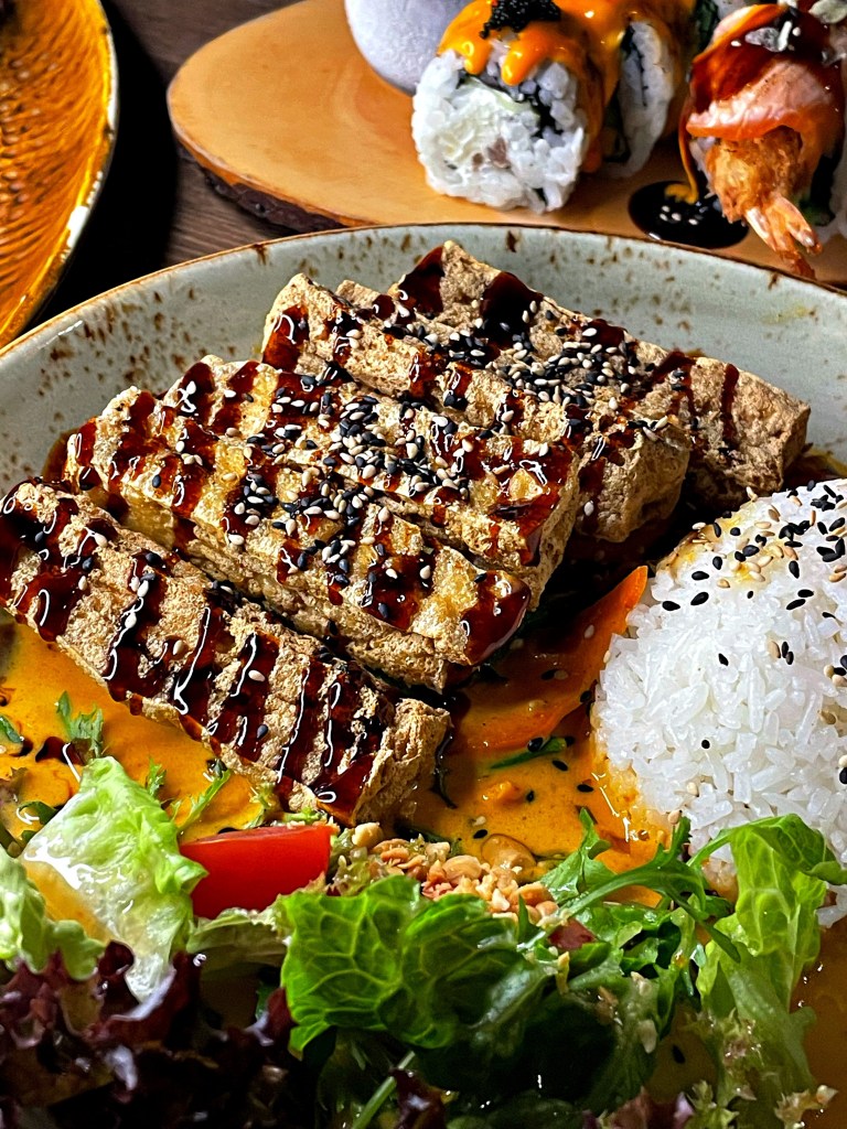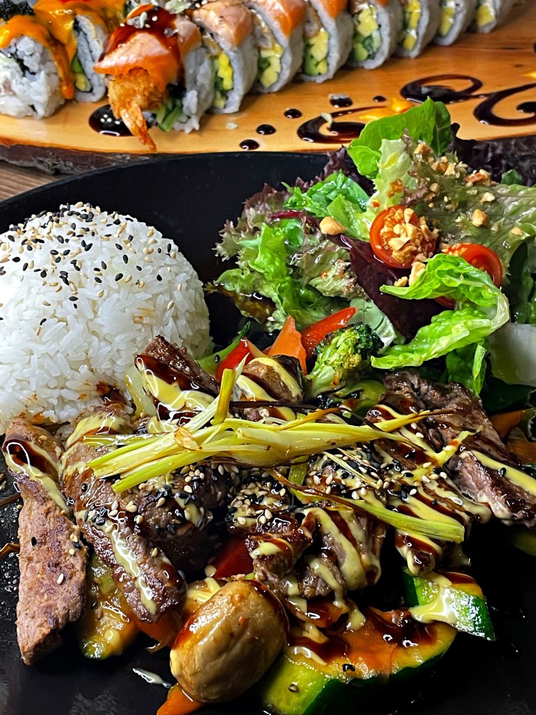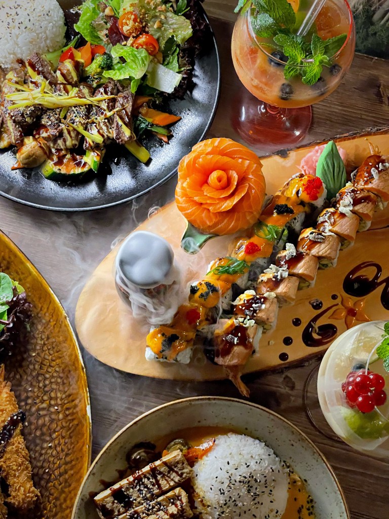 Zunächst haben wir uns den „Summer Milky Silky“, ein Cocktail mit Yakult und Reisschnaps, bestellt. Diese Kombination haben wir noch nie getrunken und können sie sehr weiterempfehlen! Als Vorspeise hatten wir die „Torpedogarnelen“, mit Sweet Chili (Hoisin Erdnuss oder Fruity Mango). Beim Sushi haben wir uns die „KINGDOM TUNA ROLL“ mit Chili Mayo, Chips und Tobiko Topping und Lachstatar, Philadelphia, Avocado, Gurke, Mango und Surimi Füllung und die “SKY DRAGON & PHOENIX ROLL” mit Lachs Topping und Avocado, Mango, Gurke, Tempura Garnele und Philadelphia Füllung ausgesucht. Als Hauptgang hatten wir “BEEF GINGER”, Roast Beef geschwenkt in Saisongemüse und hausgemachter Soße, serviert mit Reis und Salat und “MO’S SPECIAL CURRY”, ein cremiges Curry mit Saisongemüse, Ananas, serviert mit Reis, frischem Salat und Tofu. Als Dessert gab es noch sehr leckeres “MOCHIES”, feine Eiscreme in zartem Reisteigmantel mit frischen Früchten und hausgemachter Sauce. Unser absolutes Highlight waren die “Torpedogarnelen” und die “Sky Dragon & Phoenix Roll”.