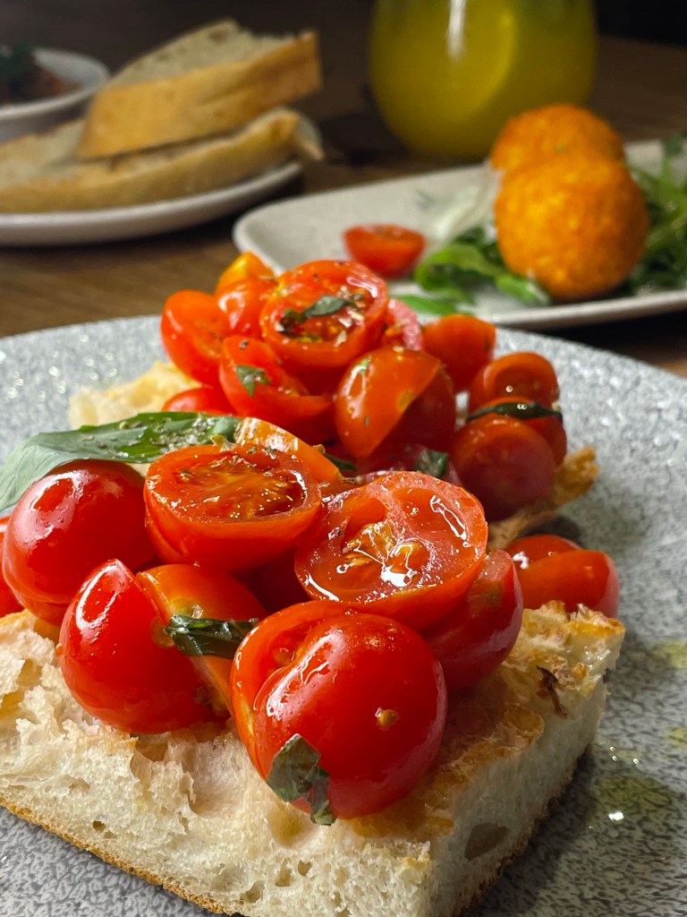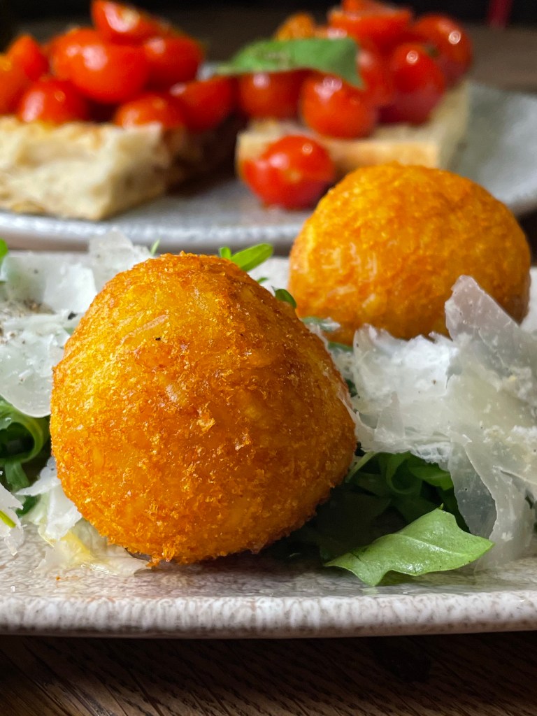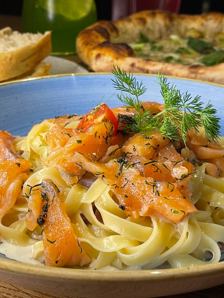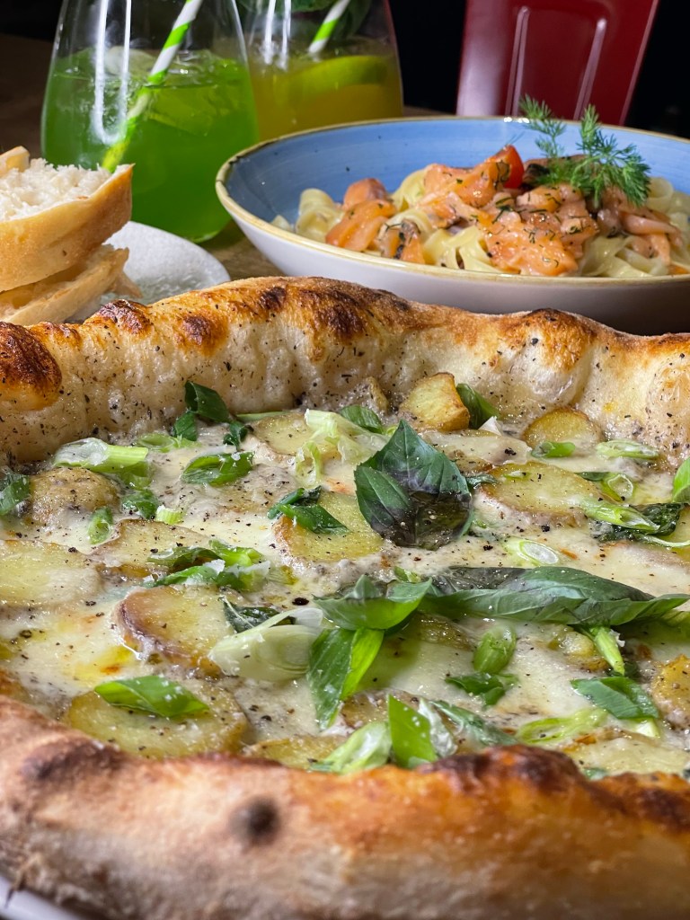 Wir haben uns zunächst die super leckeren “Arancini”, frittierte Risottobällchen mit pikanter Wurst und Parmesan Füllung, die “Caponata di Melanzane”, Auberginen, Tomaten, Zwiebeln, Sellerie, Kapern, Oliven und hausgemachtes Focaccia und hausgemachtes “Bruschetta Pizzamacher” mit Cherrytomaten, Oregano und Olivenöl – „Come in Italia” bestellt. Dazu gab es die hausgemachten Limos “Maracuja-Minze” und “Cranberry-Rosmarin”, sehr erfrischend! Als Hauptgang gab es dann die “Tagliatelle al Salmone”, mit gebeiztem Dill-Graved -Lachs, Sahne al Limone und rotem Pfeffer und eine “Tartufata e Patate Veggie” Pizza mit Crème Fraîche, Fior di Latte Mozzarella, Trüffelcreme, Drillingen, Parmesan und Frühlingszwiebeln. Zu guter Letzt gab es noch ein „AFFOGATO“, Vanilleeis mit Espresso und