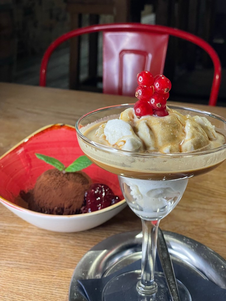 ein „GELATO ALTARTUFO CLASSICO“, Schokoladeneis mit Haselnuss-Stückchen und Zabaione-Kern. Wir können vor allem die Arancini, die Pasta und die Pizza sehr empfehlen.