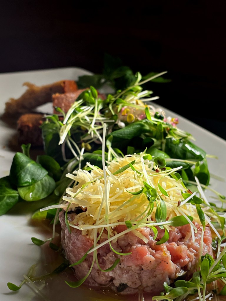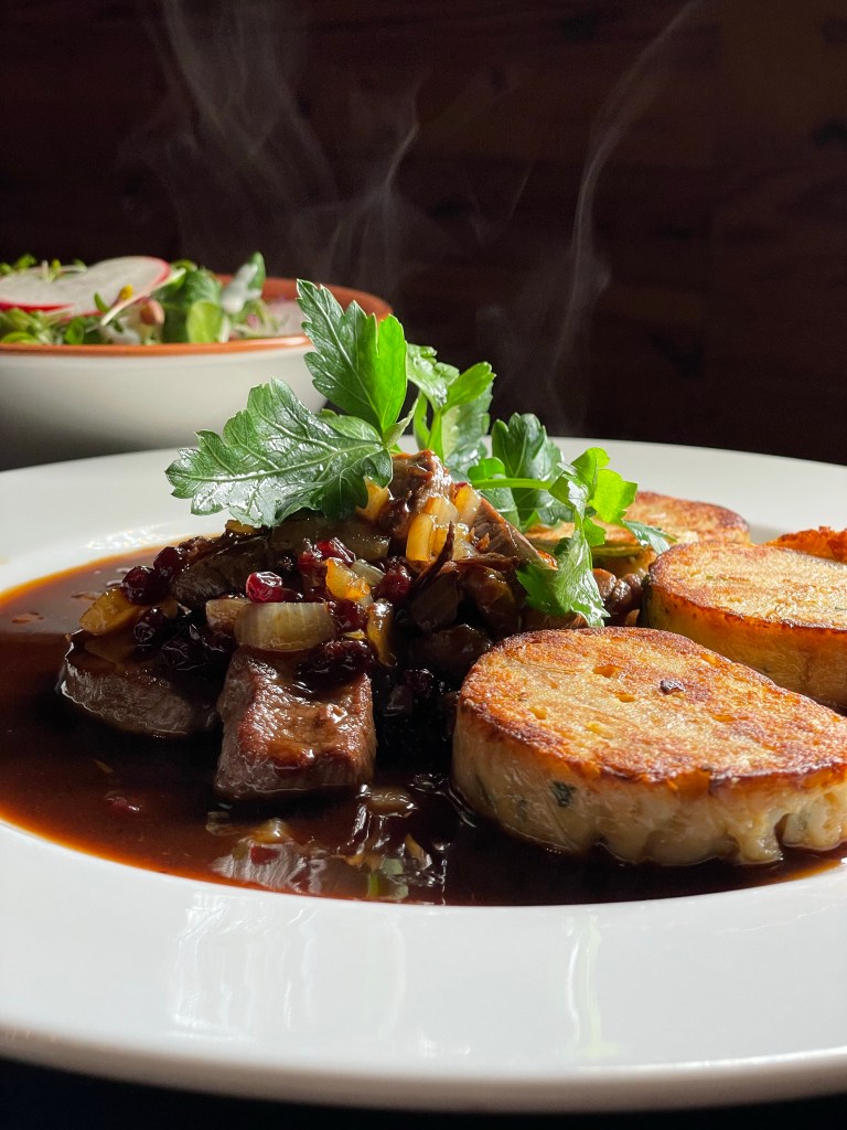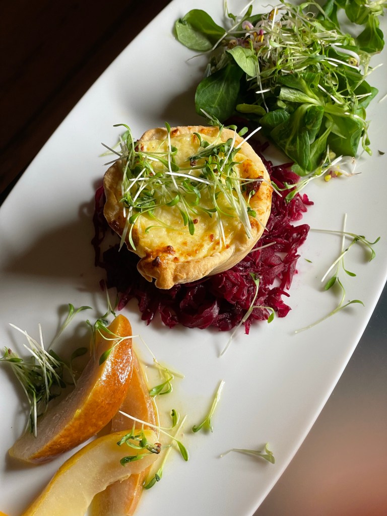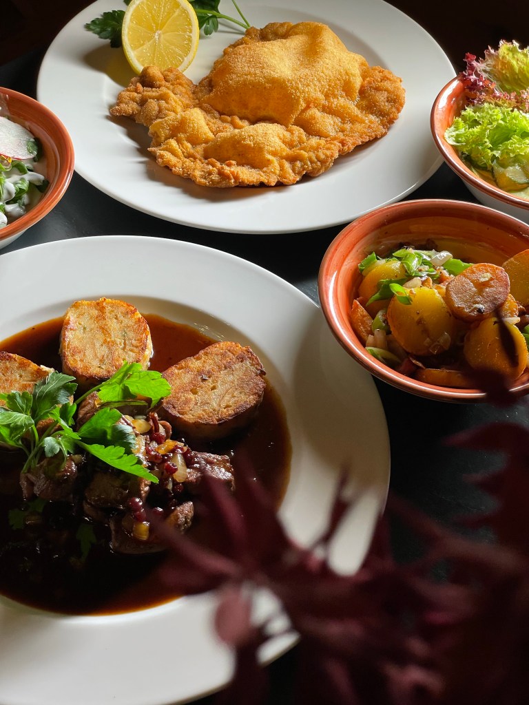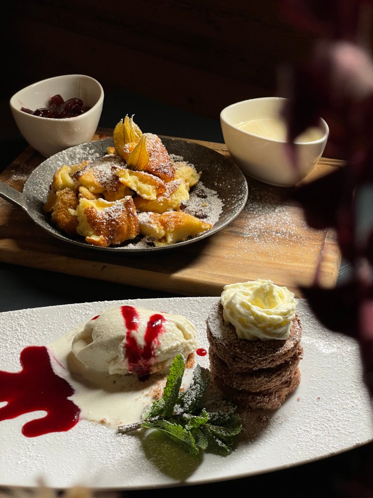 Als Erstes haben wir uns einen Aperitif gegönnt und einen „Alpenspritz“ mit Himbeeren, Rosenwasser, Prosecco und Soda, sowie einen Negroni bestellt. Dann ging es direkt los mit gleich vier wunderbaren Vorspeisen (wir konnten uns wirklich nicht entscheiden). Es kamen warme „Kasnudeln“ im klarem Paradeisersud und Rucola, ein unfassbar gutes „Tiroler Bergkäsetörtchen“ mit Blaukrautsalat, glasierter Birne und Feldsalat, das „Kalbstartar” auf geröstetem Bauernbrot, Schnittlauch und Gartenkresse und die “Fleckerlsuppe” eine kräftige Rinderbrühe mit Kalbfleischstreifen, Wurzelwerk und frischem Kern. Als Hauptgang kam das Tagesgericht “Neues vom Bebensee” mit Bio Reh und natürlich das “Gassenhaur Original” Wiener Schnitzel aus dem Kalbsrücken geschnitten. Zu guter Letzt haben wir uns dann noch den “Kaiserschmarrn aus’m Reindl” mit Zwetschgen, Rosinen und Vanilleschaum und das “Topfen-Joghurt-Eis” mit Beerenschaum und Schokomoussetörtchen bestellt. Wir hatten einen wunderschönen Abend mit großartigem Essen und sehr gutem Service. Das Gassenhaur ist ein echter Geheimtipp!