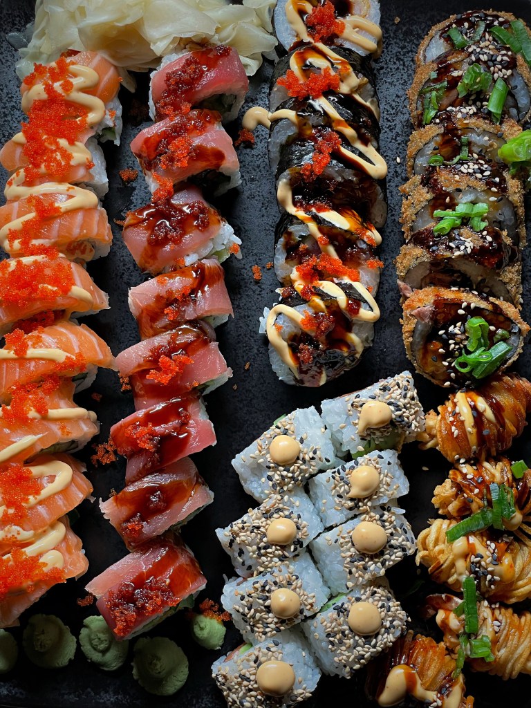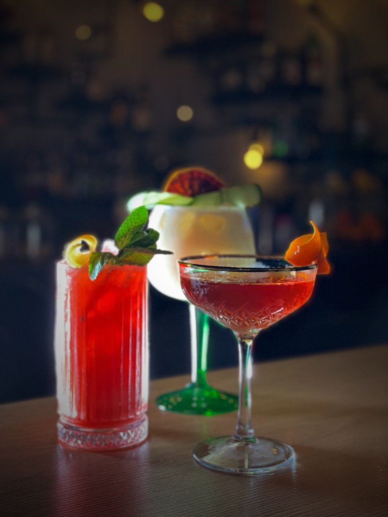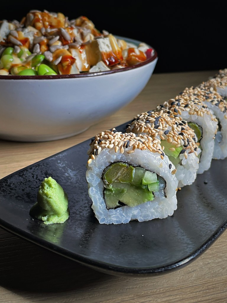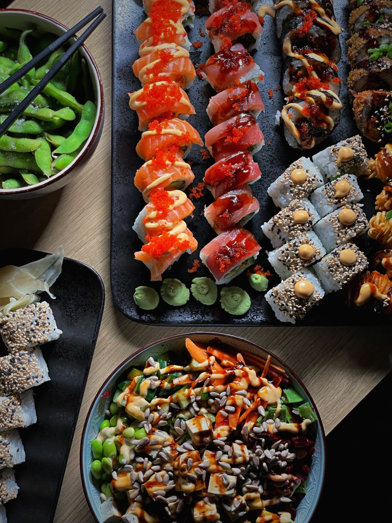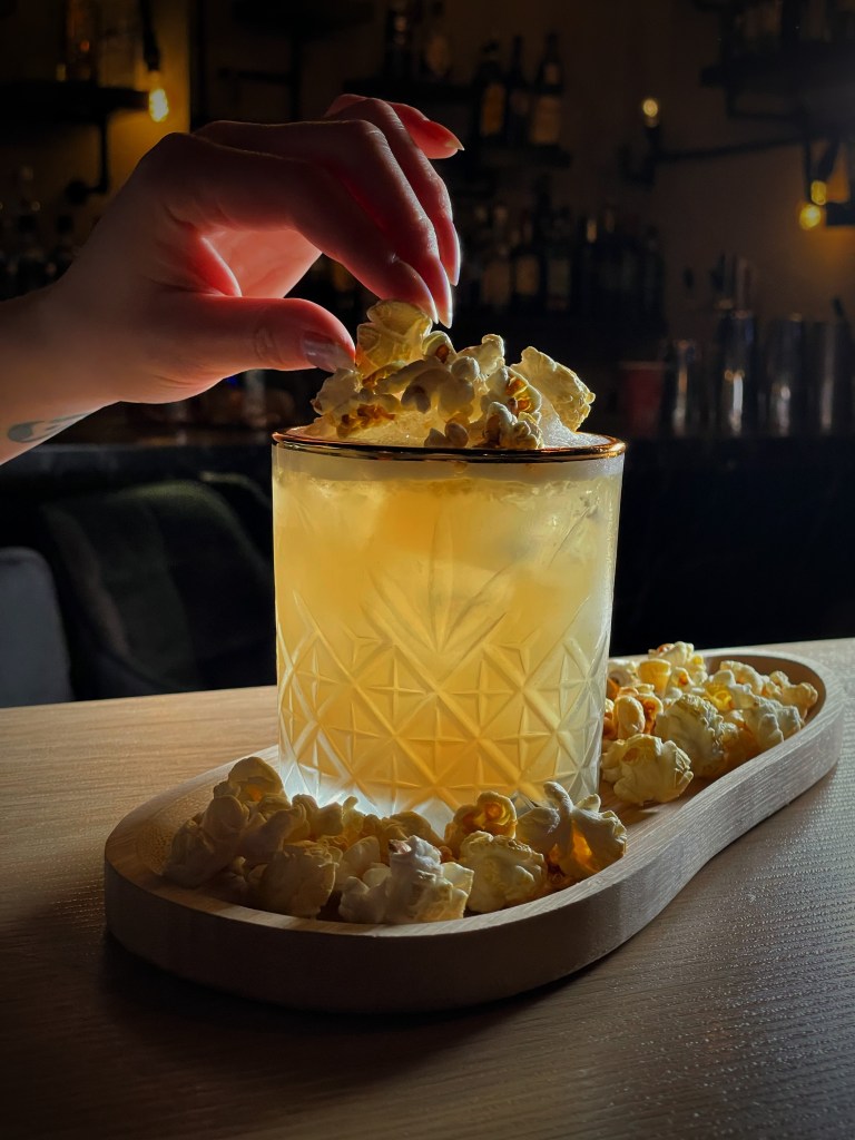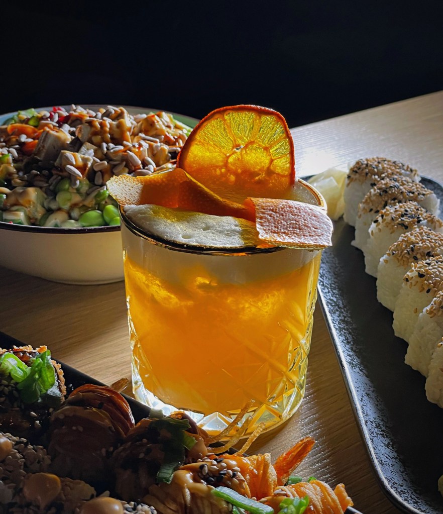 Wir haben den Abend mit einem „Cucumber and Pineapple“ (Absolut dripped through Cucumber, Pineapple and Coconut), einem „Alpha“ (Absolut, Lime, Orange, Vanilla, Strawberry, Passionfruit) und einem „Manhattan“ (Bulleit Rye Whisky, Red Vermouth, Bitters) begonnen. Laut meiner Freundin der beste Manhattan seit langem! Bei den Startern haben wir uns Edamame und Tempura Garnelen ausgesucht und beim Sushi die „Garnelen Tuna Roll“, die vegane „Tempura Spargel Roll“, die „Crispy Duck Roll“, die „Salmon Garnelen Roll“ und die „Yam Roll“ mit spicy Tuna Tartar und Panko Garnelen. Unsere vegetarische Freundin hatte noch eine „Veggie Bowl“. Ein weiteres Highlight war der „Popcorn Sour“ mit durch Popcorn getropften Bourbon, Lemon, Zucker und Eiweiß, ein echtes Erlebnis! Die Getränkekarte wird euch begeistern, denn es gibt unglaublich viel zu entdecken.