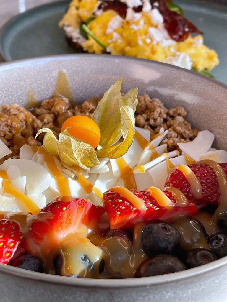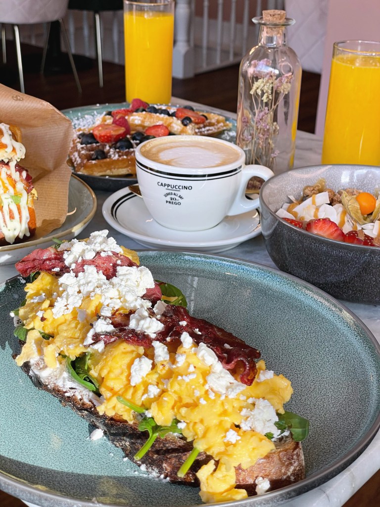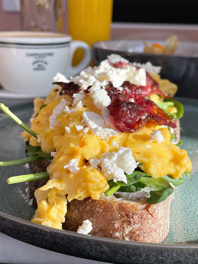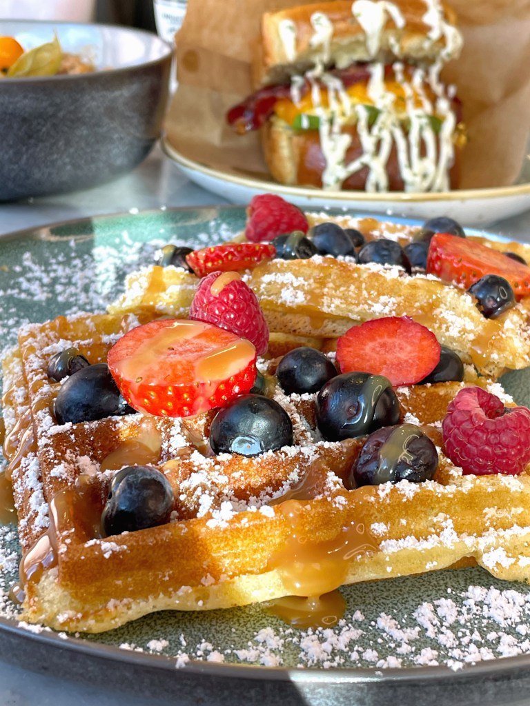 Wir haben uns das „Bacon & Egg Bread“ mit Frischkäse, Blattspinat, Rührei, Beef Bacon und Schafskäse, die Waffeln mit Toffee Sauce und Früchten, die „Açaí Bowl“ mit Banane, Mango, Açaí, Kokosmilch und Topings und den „Avocado Bacon Drop“ mit Rührei, Beef Bacon, Avocado, Cheddar-Cheese, Butter und Trüffelmayo (Wahlweise mit pikanter Special Sauce) bestellt. Dazu gab es noch frisch gepressten Orangensaft und natürlich Kaffee. Wir können tatsächlich alles sehr empfehlen, wobei unser Favorit das dick belegte Brot war.