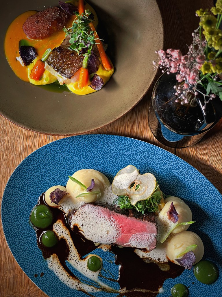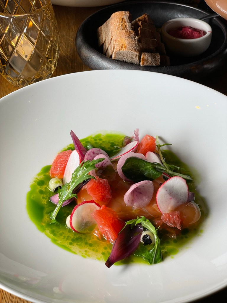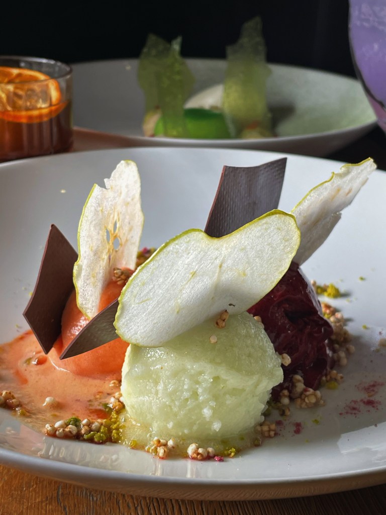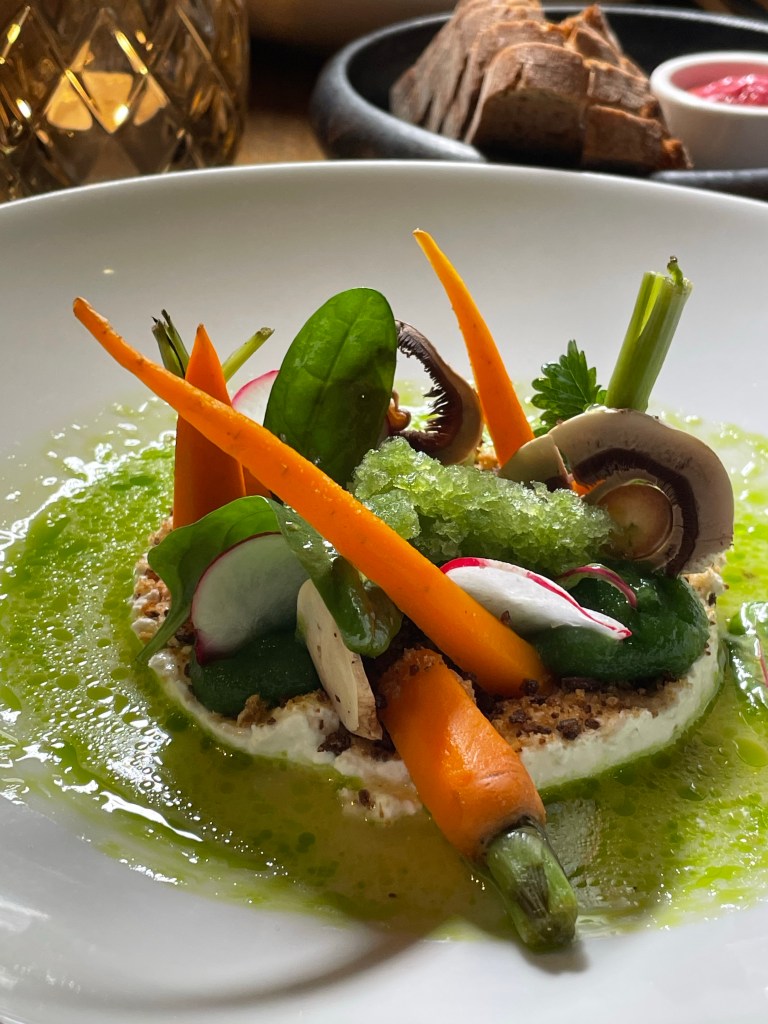 Selbstverständlich haben wir den Abend mit zwei wunderbaren Cocktails begonnen. Auf Empfehlung des Hauses hatten wir den „Sakura“, Sakura Rose Vermouth, Lillet Blanc, Limettensaft, Lychee Likör, Grapefruit und den „Lavandula“, Illusionist Gha, Triple Sec, Limettensaft, Zuckersirup, Soda, Lavendel, getrocknete Limette – eine erstklassige Wahl. Vorab gab es „Färöer Lachs Whisky gebeizt“ mit Kräutervinaigrette, Rettich und Grapefruit und „Frisch vom Feld“ mit Vollkorn, Molke und Hüttenkäse – beides ein Traum. Im Hauptgang gab es „Simmentaler Roastbeef“ mit Selleriecreme, Nussbutter und Apfelkompott und „Grönland Kabeljau“ mit Brandade, Escabeche und Sauce Rouille – für mein persönliches Empfinden war die Sauce etwas sehr lieblich, aber der Fisch war dafür ausgezeichnet. Als süßen Abschluss gab es dann noch „Weiße Schokolade“ mit Petersilie, Sauerrahm und Apfel und „Sorbetvariation (vegan)“ mit gepufftem Quinoa, Bitterschokolade und Chips – schön angerichtet und definitiv sehr kreativ. Besonders interessant fanden wir die Kombination mit Petersilie. Unser Highlight waren diesmal tatsächlich die Vorspeisen, die hätten wir am liebsten gleich nochmal bestellt. Zu guter letzt gab es noch einen weiteren Drink und wir haben den Abend entspannt ausklingen lassen.