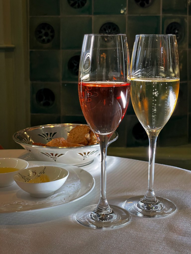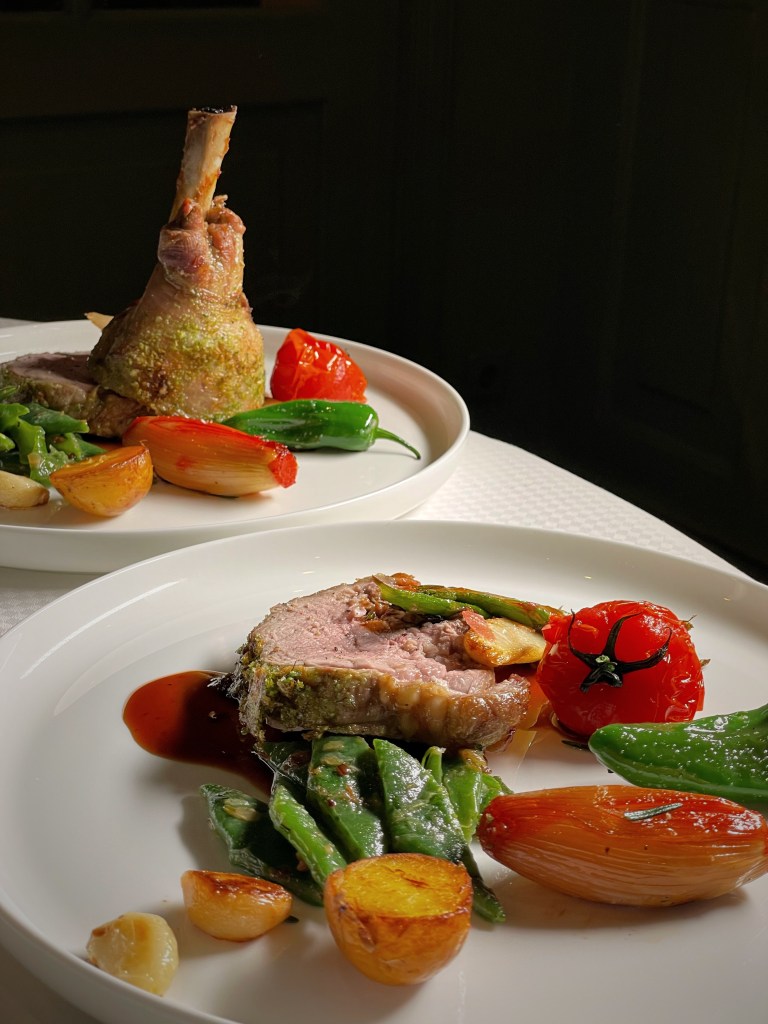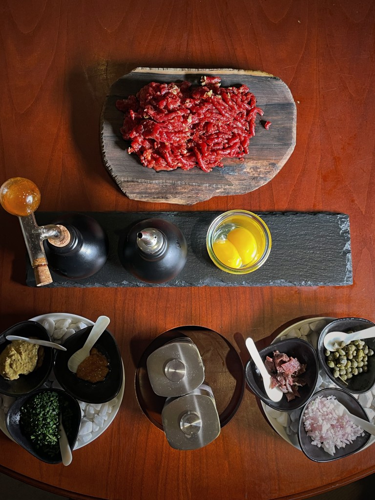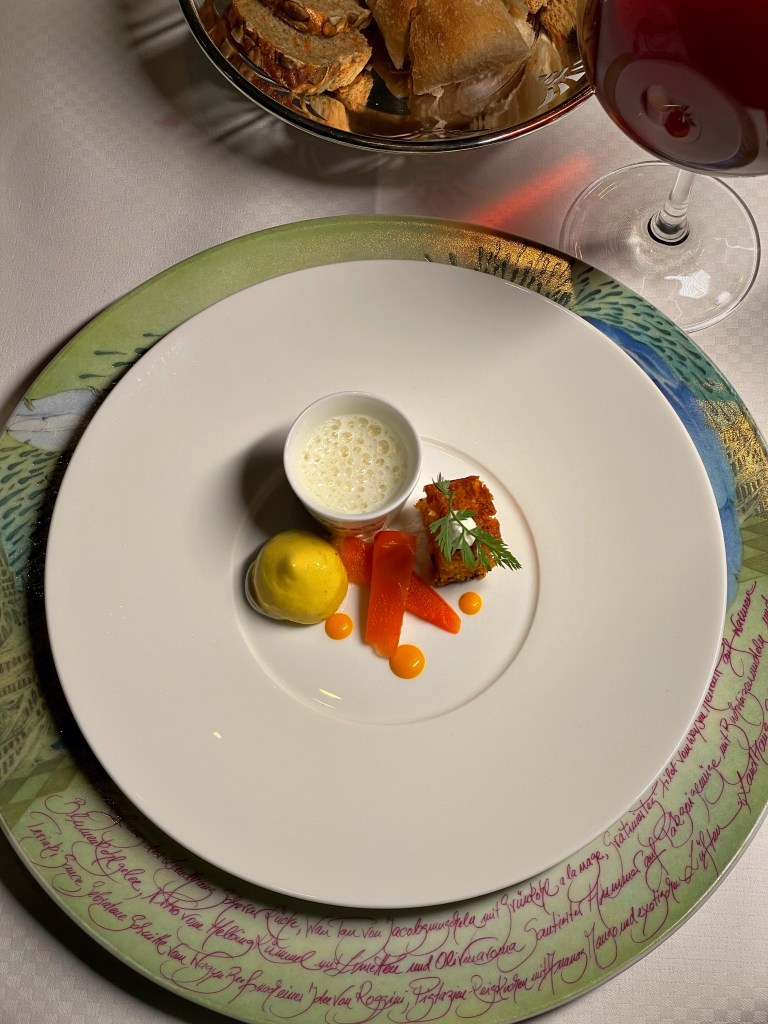 Wir hatten die Ehre, das Ostermenü vorab verkosten zu dürfen, welches Gang für Gang am Tisch für uns angerichtet wurde. Zunächst hatten wir ein Gläschen Champagner und dazu gab es einen Gruß aus der Küche, eine fantastische Spargelcremesuppe mit dreierlei Variationen der Karotte. Der erste Gang war nach individuellen Wünschen zubereitetes Tartar vom Rind. Wer also sein Tartar am liebsten ohne Zwiebeln oder mit extra Sardellen isst, kann hier selbst entscheiden. Der Hauptgang war vom Chefkoch Heinz Otto Wehmann selbst am Tisch tranchiertes Milchlamm. Das Fleisch war extrem zart! Natürlich gab es noch einen süßen Abschluss, einen ebenfalls am Tisch zubereiteten Crêpe Suzette – eine fantastische Show! Tatsächlich hat uns das Dessert auch sehr gefallen. Das Orangenaroma kam sehr schön raus.
