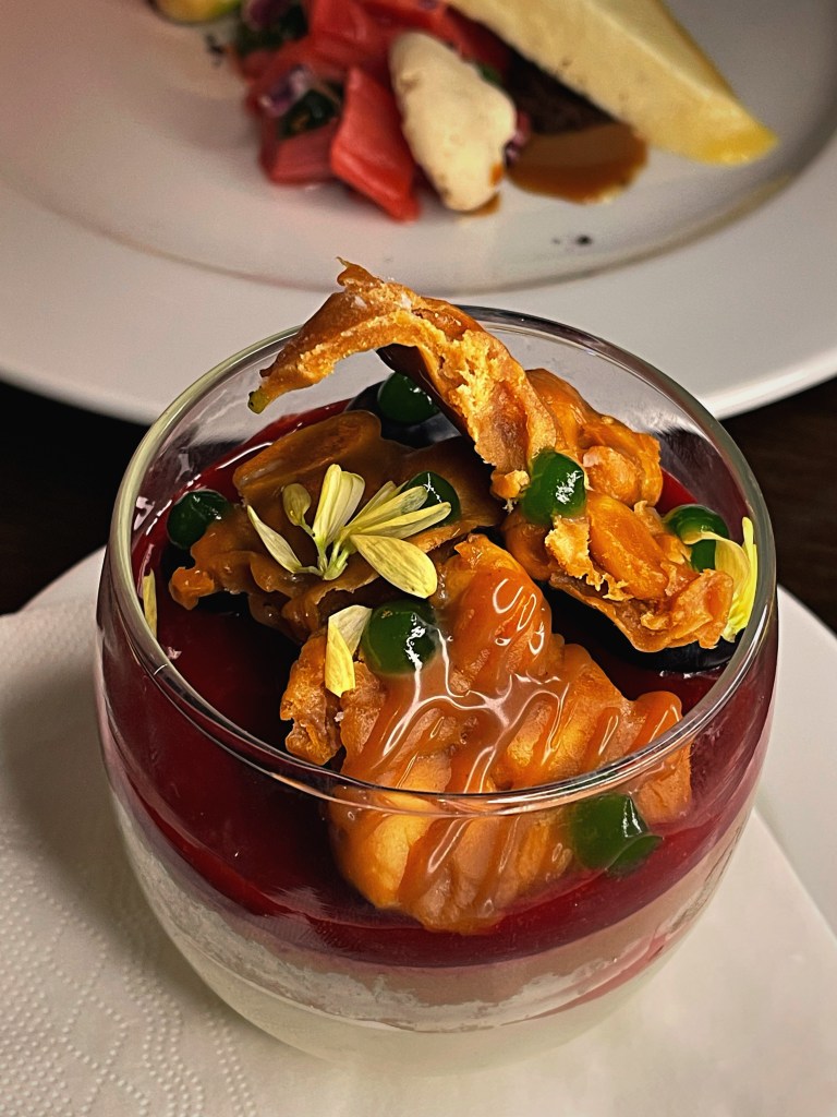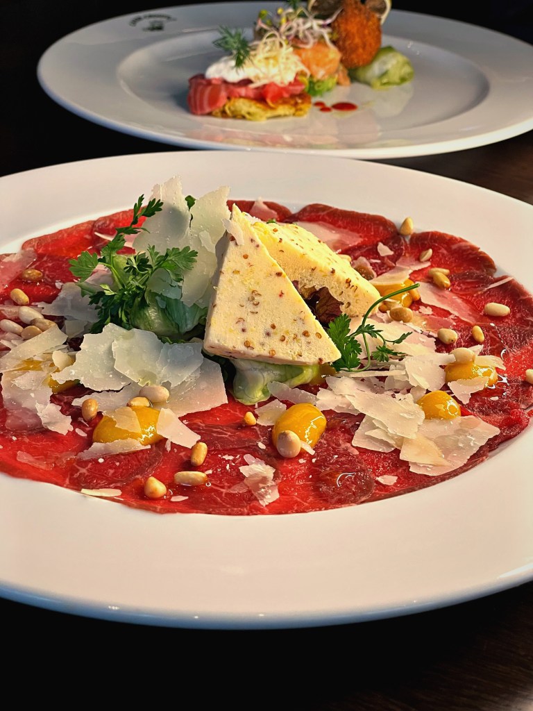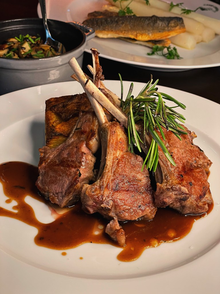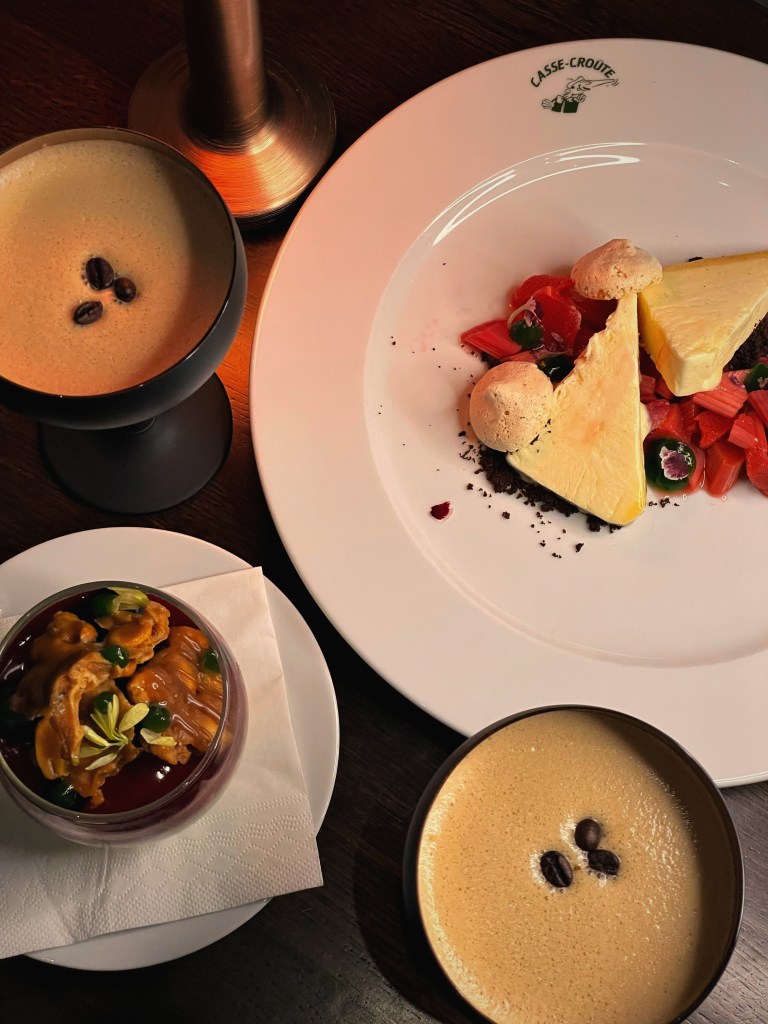 Um unseren Abend gebührend zu beginnen, entschieden wir uns für die erfrischenden Buttermilch Margaritas. Die perfekte Kombination aus spritziger Buttermilch und dem klassischen Margarita-Geschmack sorgte für einen erfrischenden Auftakt. Als Vorspeise wurden uns verschiedene Variationen vom Lachs serviert. Besonders beeindruckte uns das Lachs Tatar auf Avocado, bei dem das fein gehackte Lachsfilet auf einer cremigen Avocado-Basis ruhte. Die delikate Kombination von Fisch und Avocado war ein wahrer Genuss. Ebenso beeindruckend war der gebeizte Lachs auf Rösti, der mit seinem zarten Aroma und der perfekten Textur überzeugte. Abgerundet wurde die Auswahl durch eine köstliche geräucherte Lachspraline. Als Hauptgericht wählten wir die zarten Lammchops, begleitet von gebratenen Pilzen und einem herzhaften Kartoffelgratin. Die perfekt zubereiteten Lammchops schmolzen förmlich auf der Zunge und harmonierten wunderbar mit den sautierten Pilzen und dem cremigen Kartoffelgratin. Das Café de Paris Jus verlieh dem Gericht eine tiefe, aromatische Note. Ein weiterer Höhepunkt war das Filet vom Loup de Mer mit Spargel, Butter und Hollandaise. Das zarte Fischfilet war auf den Punkt gegart und ergänzte sich hervorragend mit dem frischen Spargel, der mit Butter und Hollandaise verfeinert wurde. Jeder Bissen war ein Fest für die Sinne. Zum Abschluss verwöhnte uns das Casse-Crôute mit einem köstlichen Nachtisch: dem Zweierlei Schokoladenmousse. Die cremige Schokolade in Kombination mit dem Erdnuss-Salz-Karamell und dem fruchtigen Coulis bildeten eine harmonische Komposition. Zudem gab es ein köstliches Vanille Parfait mit geschmortem Rhabarber und einer zarten Tonkabohnen-Baiserschicht. Dazu gab es einen Espresso Martini, ein wirklich guter Cocktail mit einem ausgeprägten Kaffeegeschmack und einer angenehmen Balance zwischen Bitterkeit und Süße.