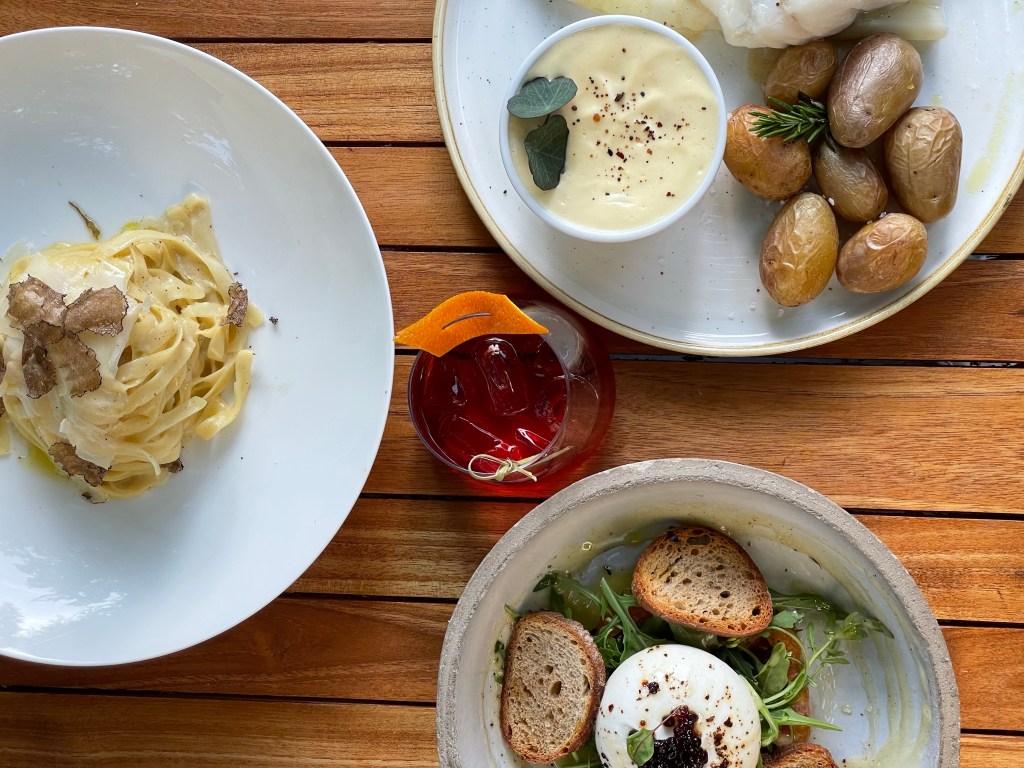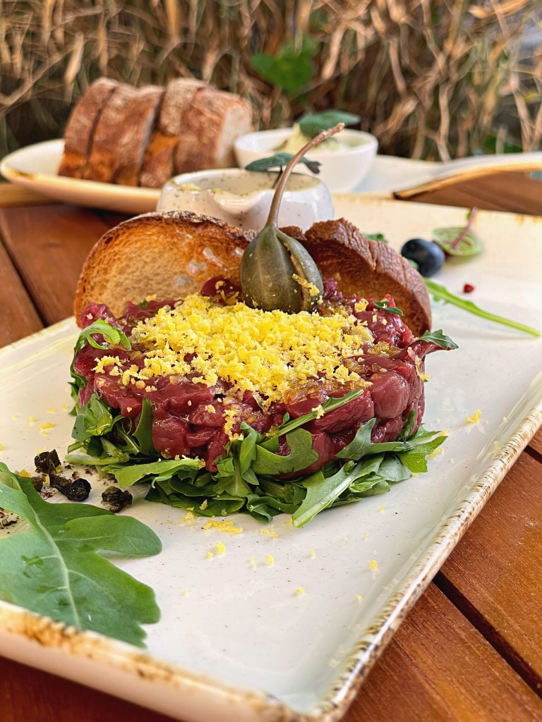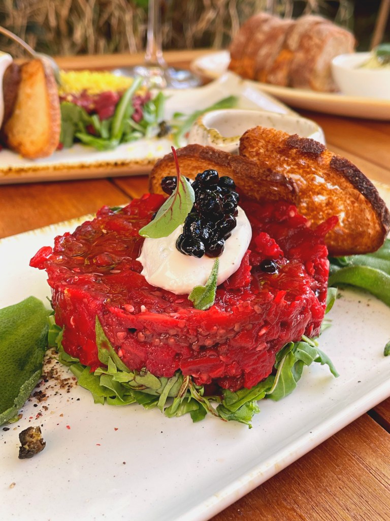 Bevor wir uns von den köstlichen Speisen verführen ließen, genossen wir den Aperitif des Tages, den erfrischenden Watermelon Sprizz. Als Vorspeise wurde uns das vegane Tatar mit Aubergine, Tomate, schwarzem Pfeffer Balsamico, Portulak und Kapern serviert. Zudem durften wir das Tatar vom Rehrücken mit gebeiztem BIO-Eigelb, Schalotte und Kapern probieren. Unser Hauptgang, die frischen Trüffel Tagliatelle mit schwarzem Trüffel und Parmesan, sowie die Burrata mit Ochsenherztomate, schwarzem Pfeffer Balsamico und Kapuziner, begeisterten uns mit ihrem intensiven Geschmack. Als Fisch des Tages wurde uns der Kabeljau mit Spargel und Hollandaise kredenzt – ein Traum! Als krönender Abschluss wurden wir mit dem Sorbet des Tages, Blaubeere und Mango, sowie einer hausgemachten Pistazienpraline aus einer renommierten französischen Chocolaterie in Hamburg, Léonie Corentin, verwöhnt.