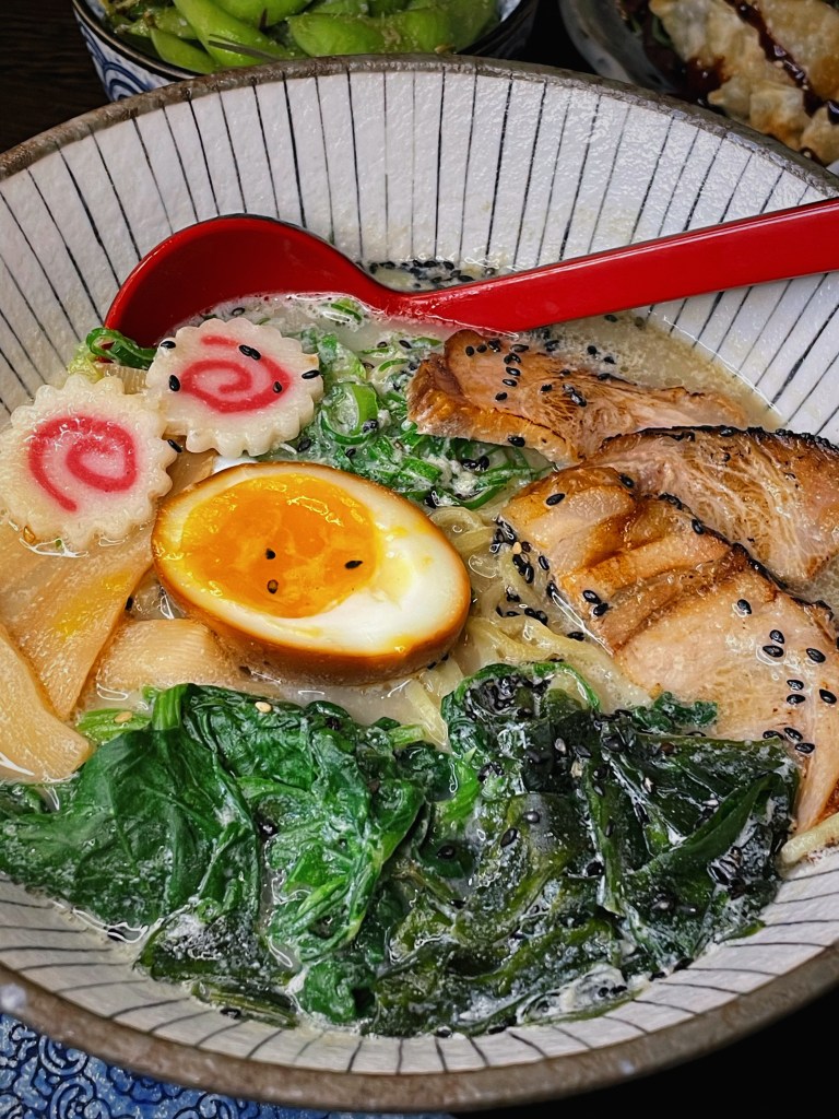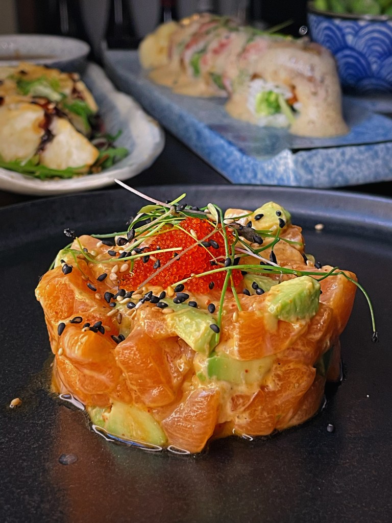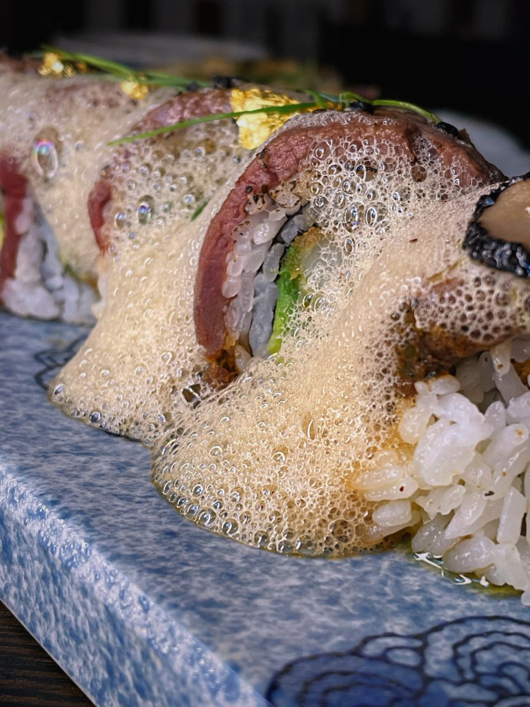 Zunächst probierten wir die hausgemachten Limonaden Passion Chia und Hata Ramune. Die erfrischende Kombination aus frischer Maracuja, Limettensaft und Chiasamen machte sie zu einem perfekten Start. Die Die Vorspeisen Edamame, Gyoza und Lachs Tatar überzeugten mit einem überraschenden Schärfekick, der uns begeisterte. Die Hauptspeisen ließen keine Wünsche offen. Die Sushi Steak Roll mit Avocado, Gurke, Garnelen und flambiertem Rindfleisch war ein wahrer Genuss. Die Trüffel Ponzu, Nussbutter, Trüffelpilze und gegrillter Spargel verliehen dem Gericht eine einzigartige Geschmackstiefe. Besonders beeindruckte uns das 23 Karat Blattgold, das eine luxuriöse Note hinzufügte. Der Tonkotsu Ramen mit zartem Schweinefleisch, weichgekochtem Ei, Menma, Sesam, Frühlingszwiebeln und Beni-Shoga war eine herzhafte Komposition, die uns begeisterte. Als Erfrischung wählten wir den Lemongrass Tea mit Zitronengras, Limetten, Rosenblüten, Honig und Goji Beeren – eine harmonische Kombination aus Zitrus- und blumigen Noten. Zum süßen Abschluss genossen wir das Mochi Eis in den Geschmacksrichtungen Matcha und Kokos. Die zarten Mochi-Bällchen umhüllten das cremige Eis und sorgten für einen köstlichen Genuss.