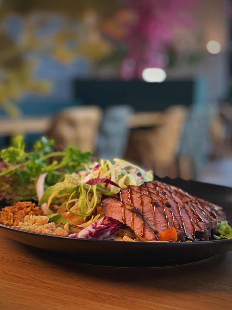 Wir begannen mit hausgemachten Eistees – Wassermelone und Lychee. Sie waren sehr erfrischend. Unsere Vorspeisen waren hausgemachte Saigon Frühlingsrollen und vegetarische Dumplings mit süß-scharfer Chili-Sauce. Die Frühlingsrollen solltet ihr unbedingt probieren. Als Hauptgerichte haben wir uns den Tan Tan Ramen Shoyu und die Shifudo Noodles mit Grill Ente. Der Ramen war ein Mix aus Ost und West, mit gebratenem Rinderhack und Sojasprossen. Die Ente hat uns sehr überzeugt – saftig und geschmackvoll. Auch die Sushi-Kreationen des Hauses, wie die Crunchy Tiger Roll mit Garnelen Tempura und flambiertem Lachs, sowie die Crunchy Salmon Roll mit Lachs Tempura und Avocado, sind sehr zu empfehlen. Das Dessert, eine hausgemachte Waffel mit Puderzucker, begleitet von einer Kugel Vanilleeis, Karamellsauce und Sahne, erweckte süße Kindheitserinnerungen. Die Getränkeauswahl im Restaurant ist gleichermaßen vielfältig. Ca Phe Sua Dua, ein vietnamesischer Eiskaffee mit Kokosmilch, sowie der Butterfly Shifudo’s special Tea, rundeten das Erlebnis ab.